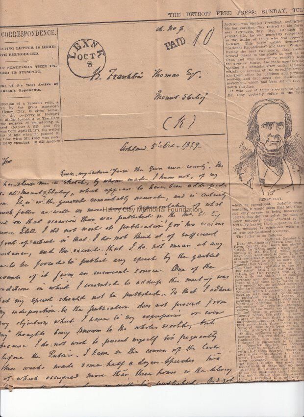 A reproduction of Henry Clay letter from October 5, 1829. The original was copied in large print, the transcription is typed on the right under henry Clay portrait.