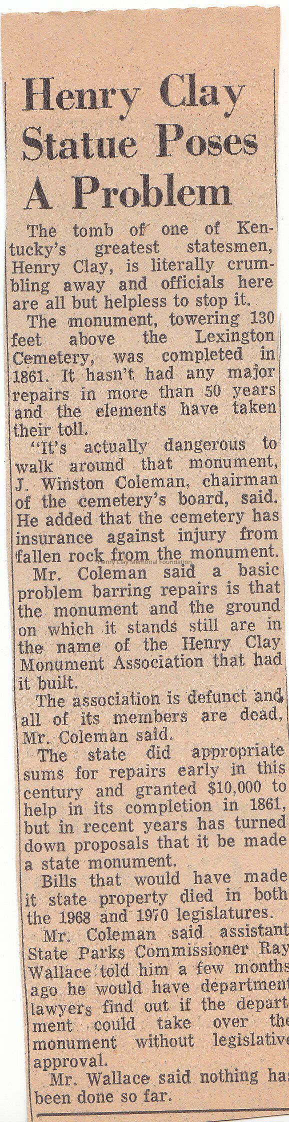 A small clipping talking about the risk that the statue of Henry Clay is posing.