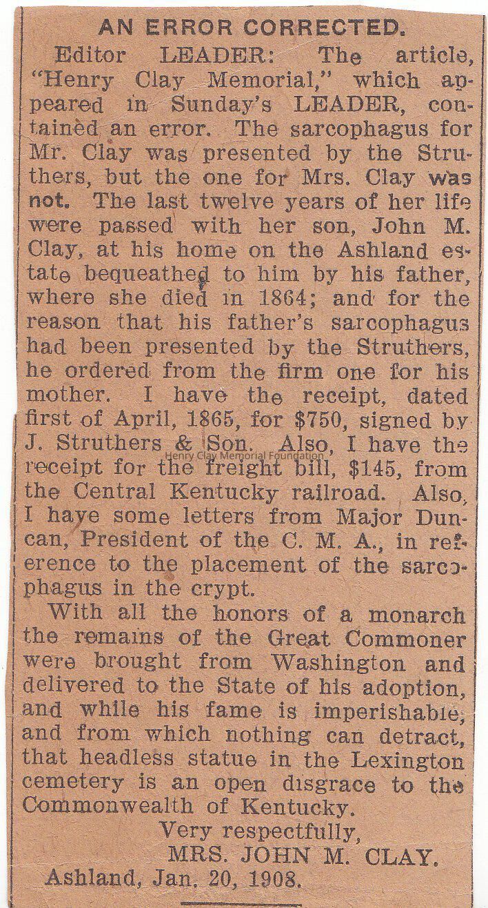 A small clipping in which Mrs. John M. Clay eplain an error that occurred on an article "henry Clay Memorial". The mistake was that henry Clay sarcophagus for Mr. Clay was presented by Struthers but not Lucretia.