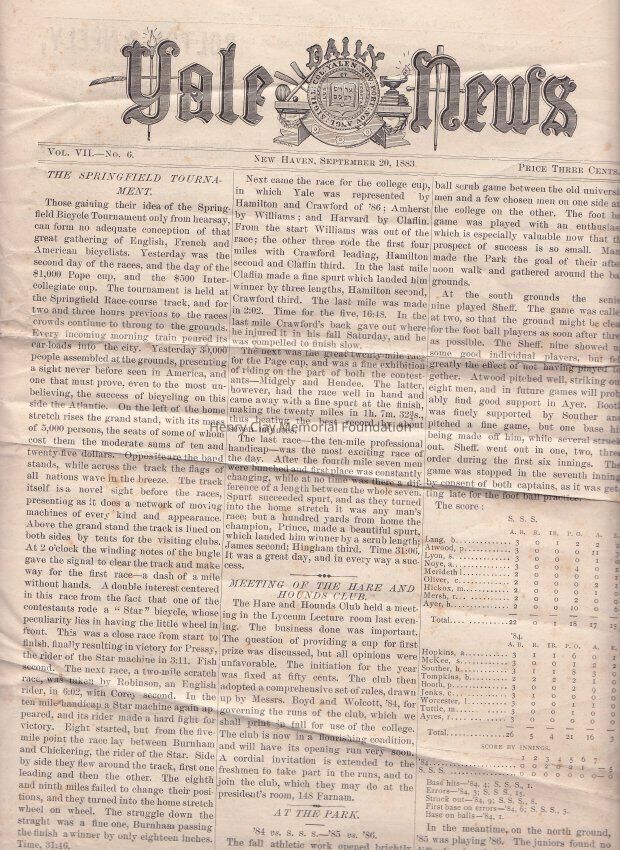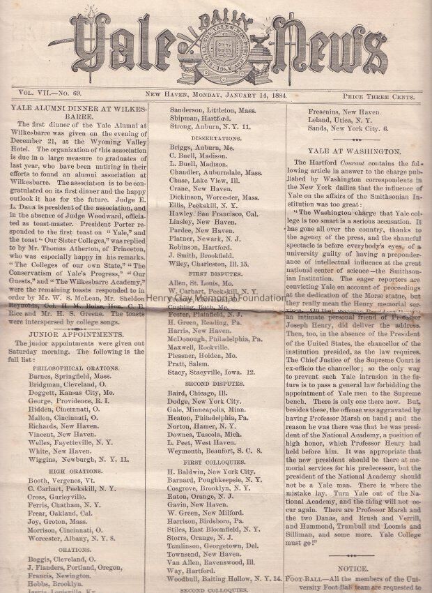 B: Vol VII no. 69. Price three cents. Four pages news, about the Yale Alumni dinner, Orations, Dissertations, Football, and advertisements