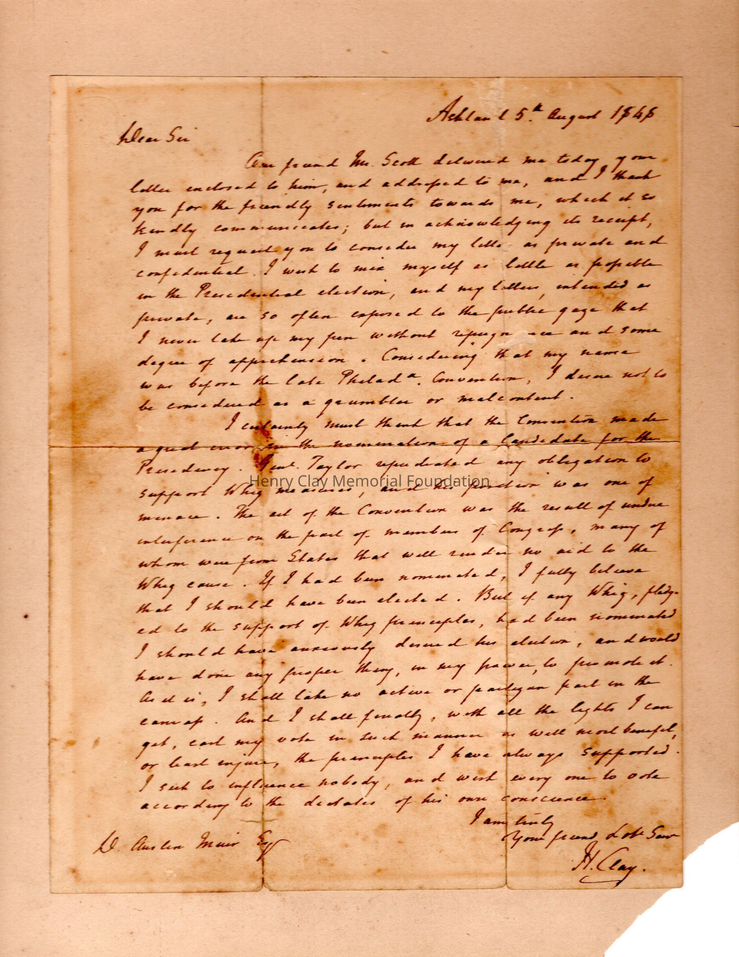 Letter written to Henry Clay to fellow Whig David Austin Muir about 1848 presidential campaign. Clay expresses his feelings of displeasure about Gen. Zachary Taylor receiving the presidential nomination in 1848 and that he is a mistake as a candidate. Clay goes on to express his desire to vote in anonymity and neither to help or harm the outcome of the election for the Whigs.