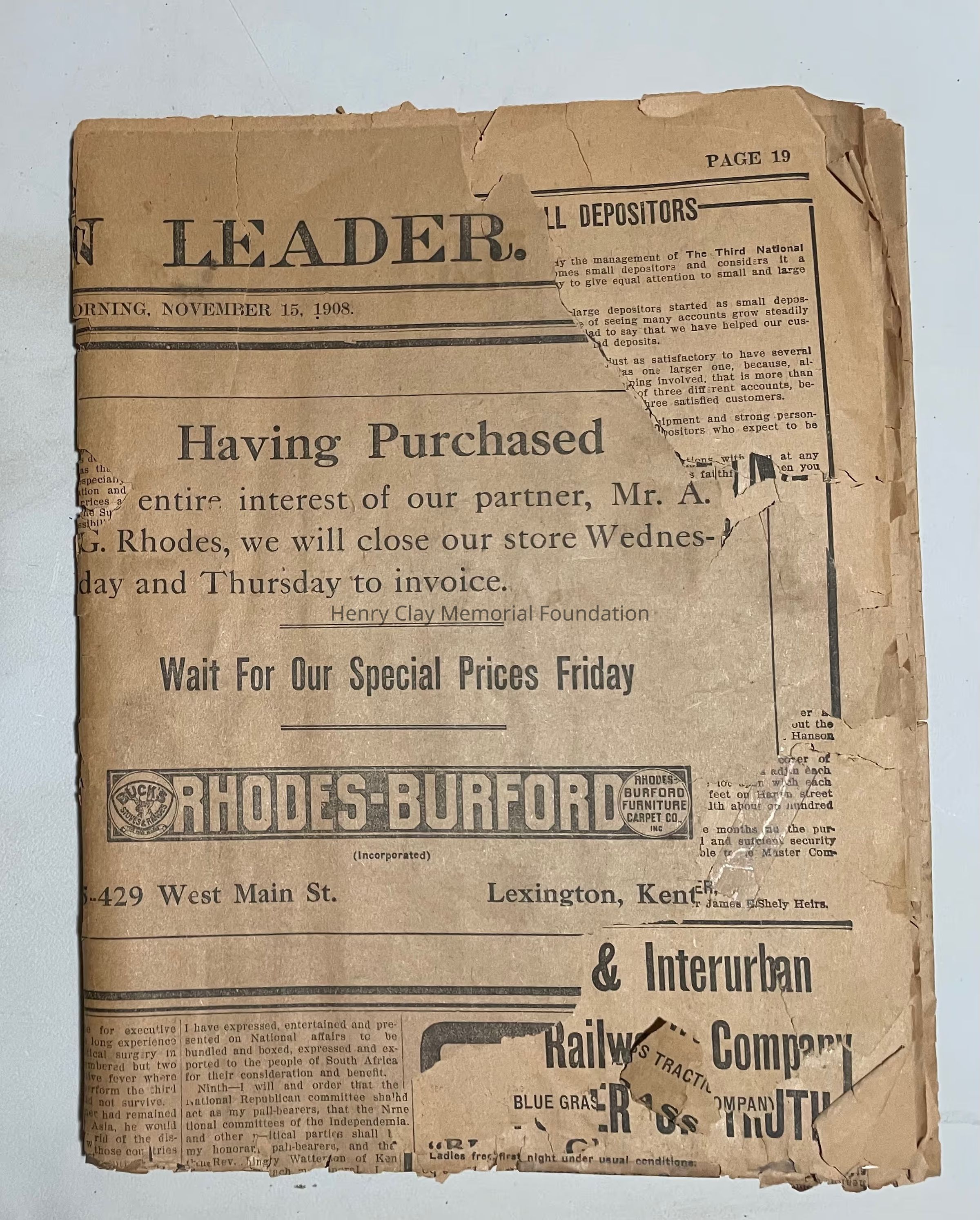 A copy of the Lexington Leader Newspaper from Sunday, November 15, 1908.