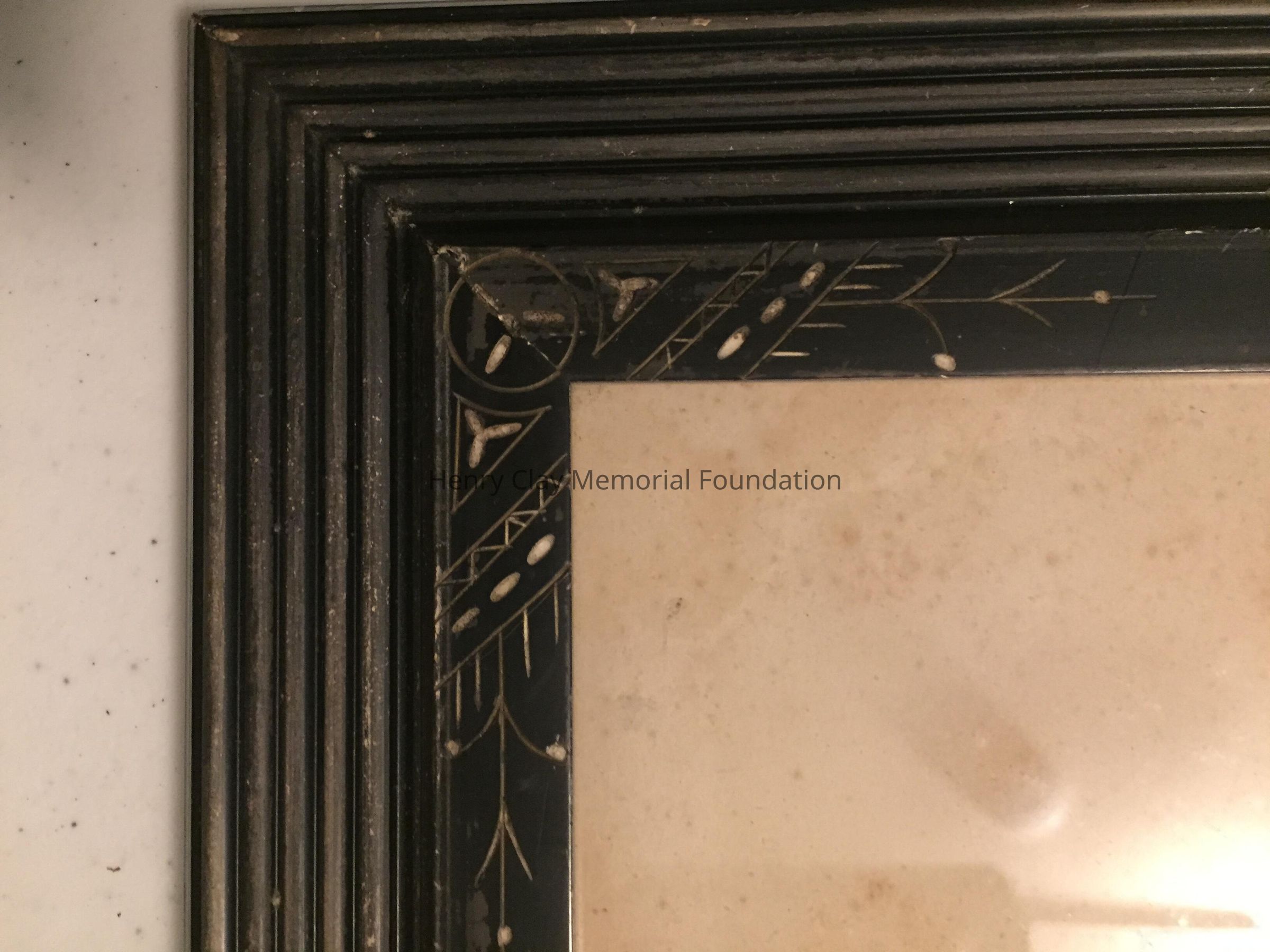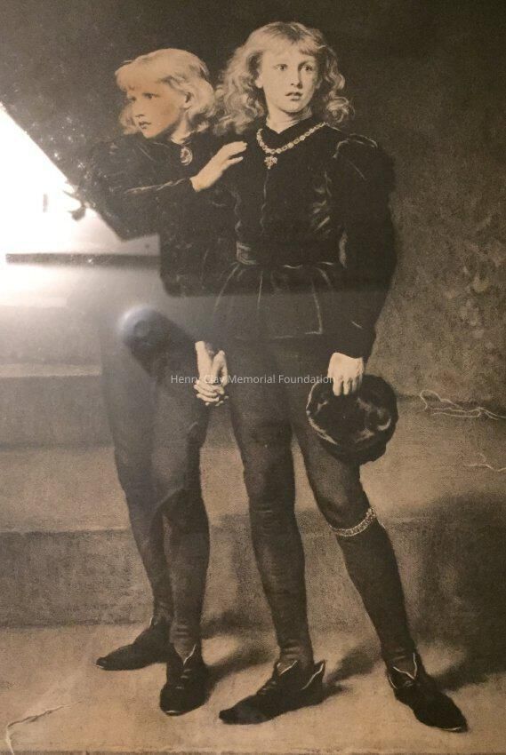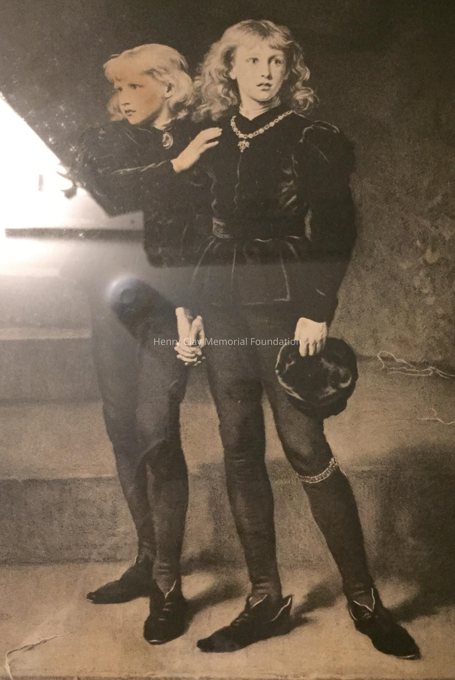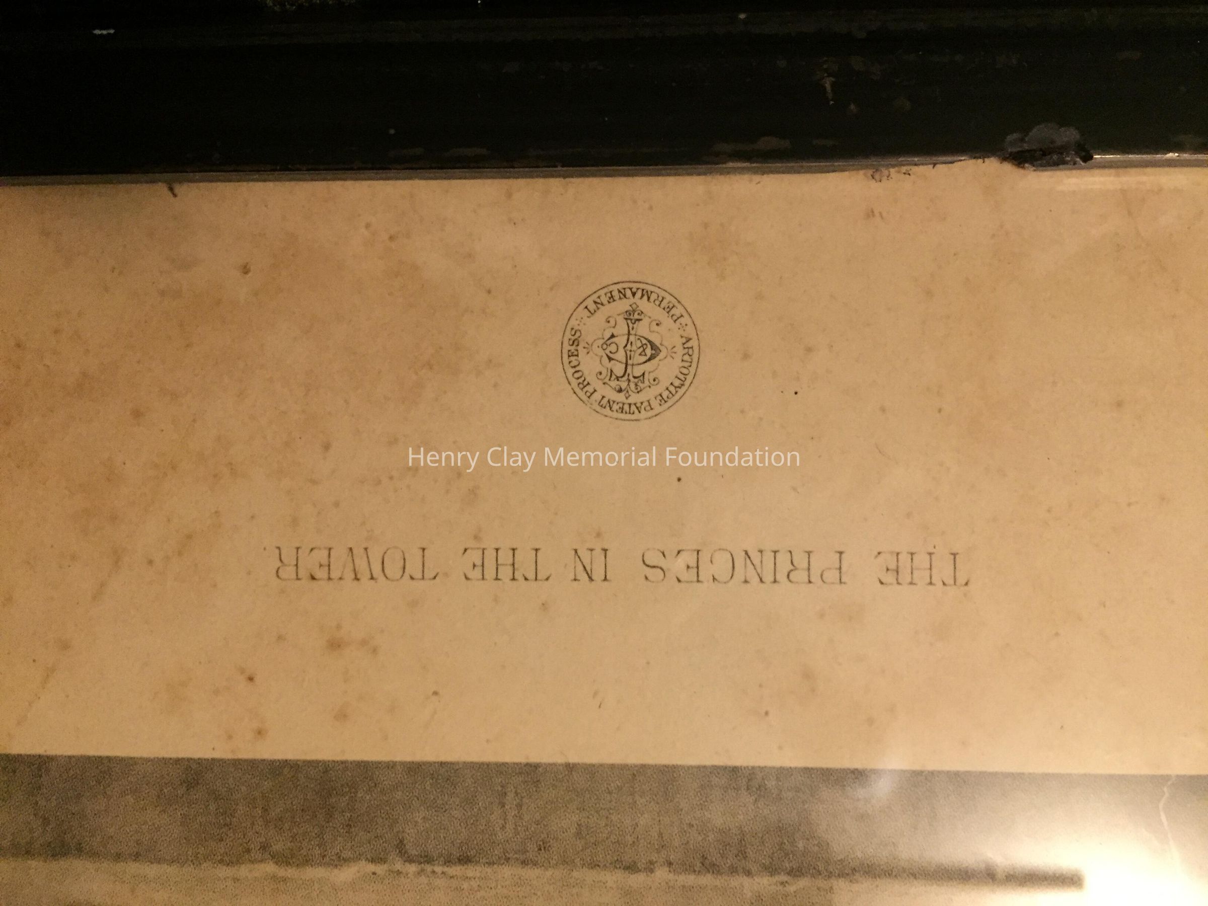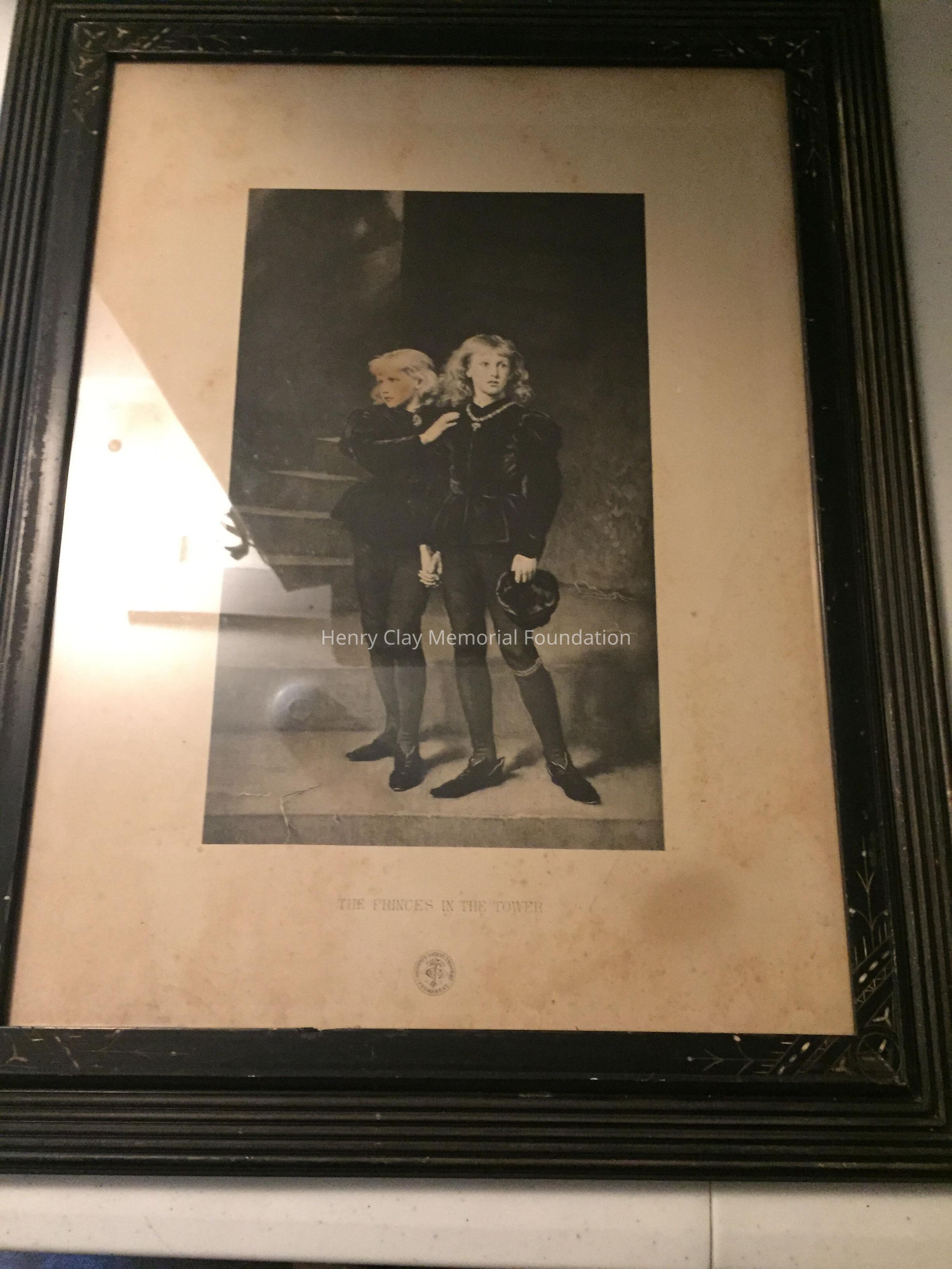 Black and white print showing two young men standing together in the Tower of London. At bottom corner of image is artist's symbol, a crown, flanked by the date 1878. Title of print is below image: "Princes in the Tower." Under title is a circular mark, "Permanent artotype patent process." Framed in black wood Eastlake style frame with white highlights.Dimensions