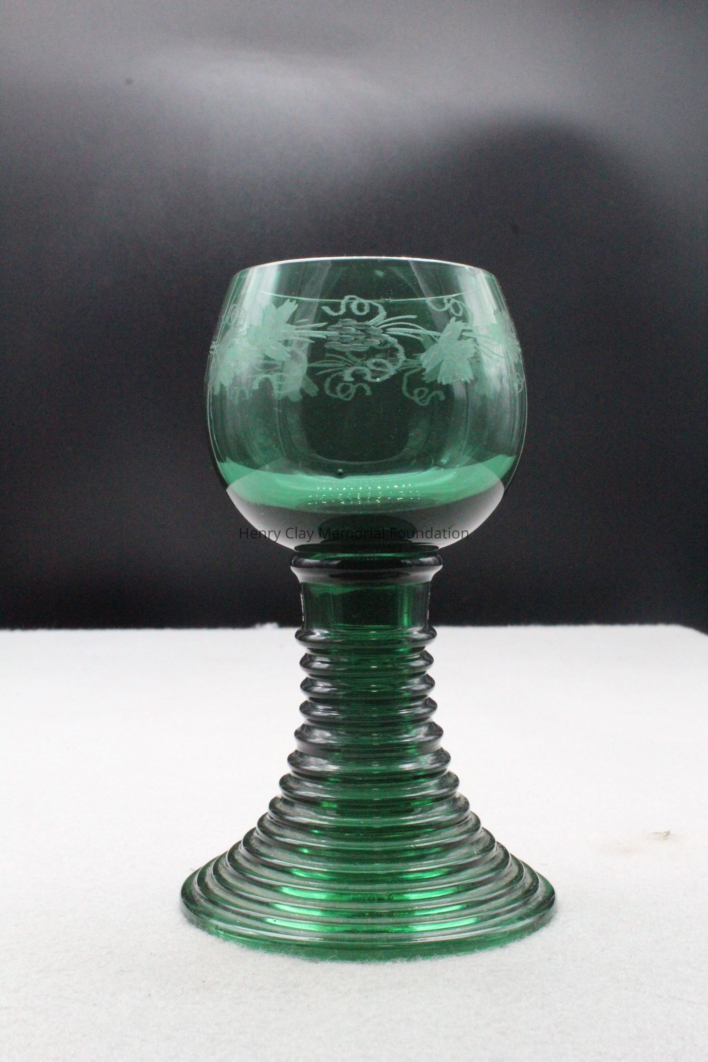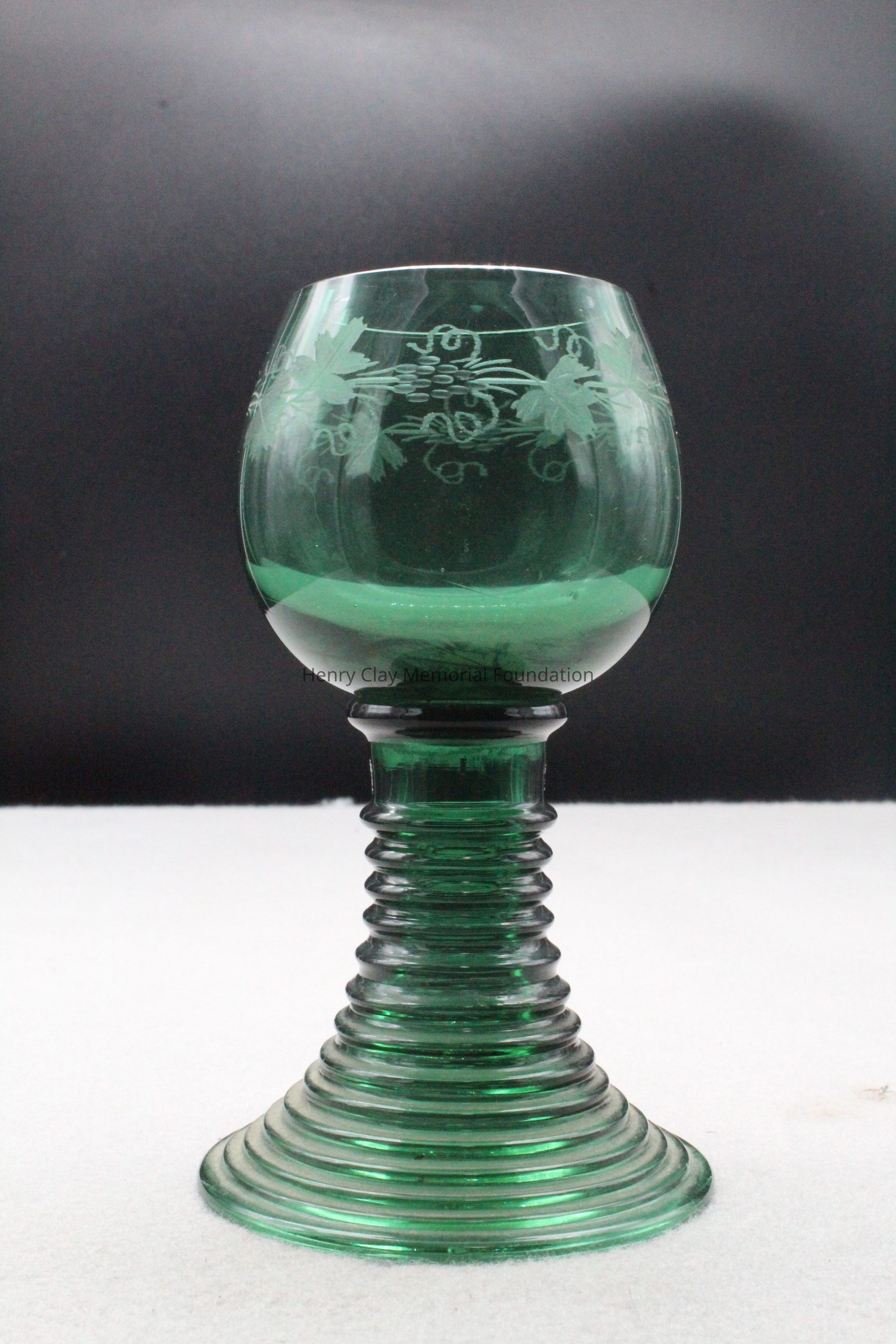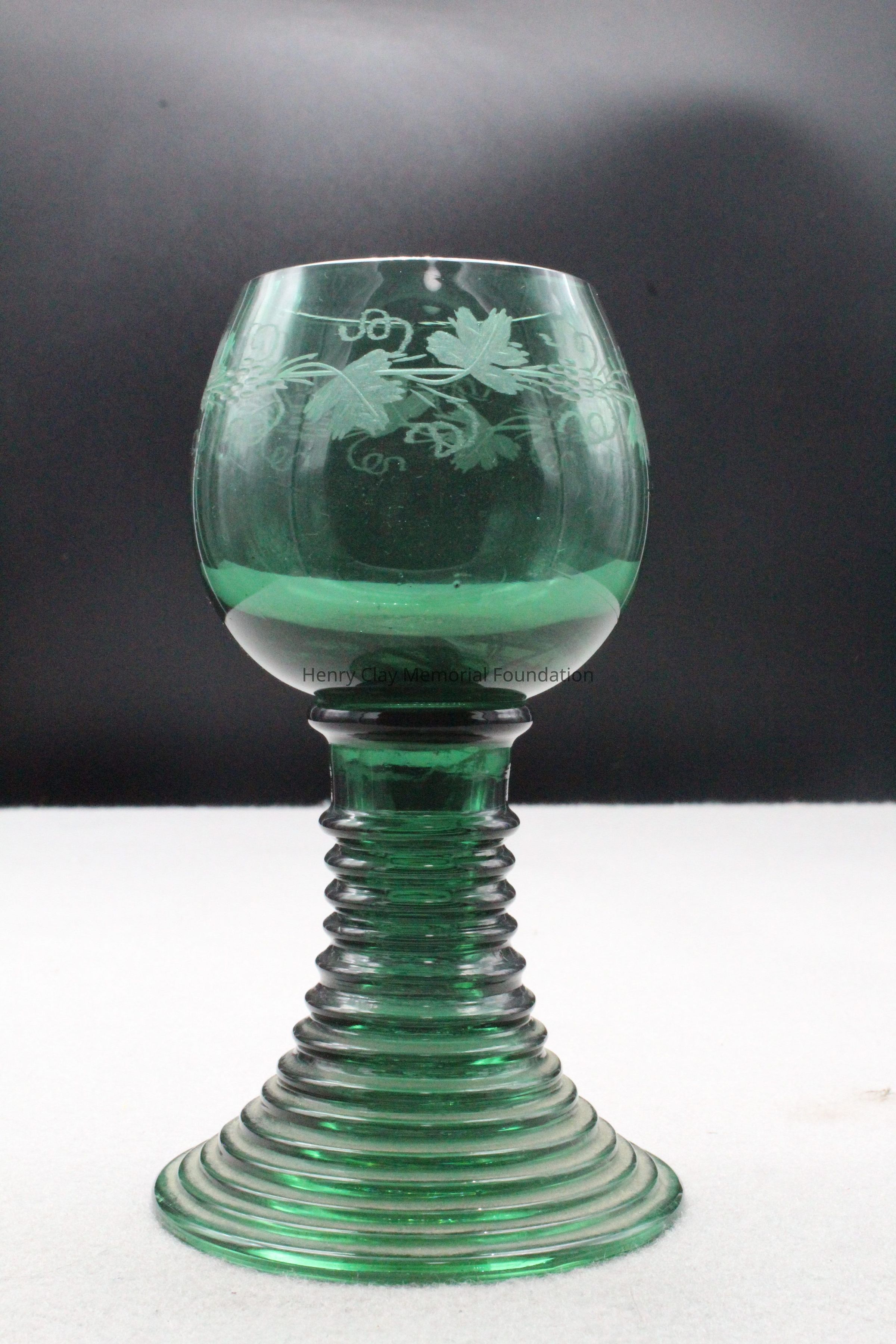 8 green glass goblets. Top is bowl shaped with an etched grapevine design. The stems are ribbed with 13 ribs and taper from the base to the bowl.Dimensions