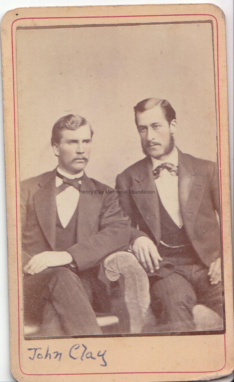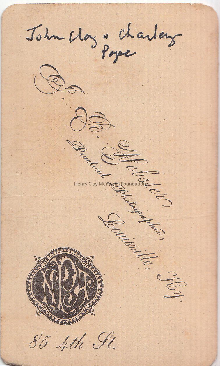 In the rear there is the name of the photographer B.Webster Practical Photographer, Louisville, Ky. 85 4th St. In pen on top "John Clay and Charley Pope"Dimensions