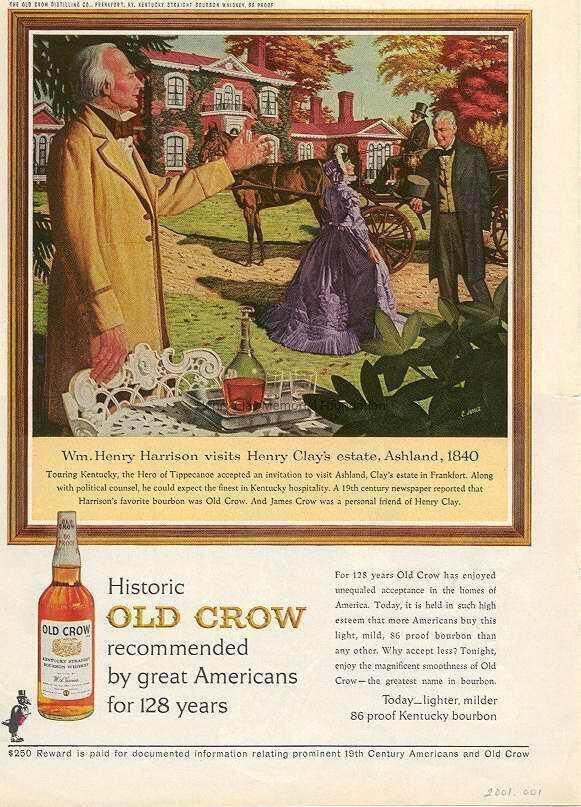Magazine ad for Old Crow Whiskey, depicting William Henry Harrison visiting Clay at Ashland in 1840. Clay is shown in a yellow tailcoat standing over a table with a bottle of whiskey welcoming Harrison. Ashland is shown in the background as a red brick building. The ad reads in part: "Wm. Henry Harrison visits Henry Clay's estate, Ashland, 1840. Touring Kentucky, the Hero of Tippecanoe accepts an invitation to visit Ashland, Clay's estate in Frankfort. Along with political counsel, he could expect the finest in Kentucky hospitality. A 19th century newspaper reported that Harrison's favorite bourbon was Old Crow. And James Crow was a personal friend of Henry Clay."