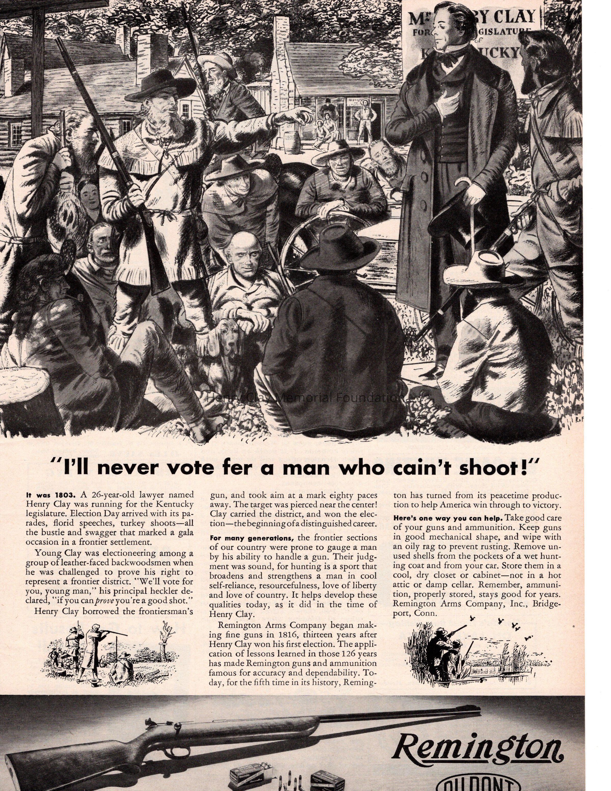 1 print advertisement fo Remington guns and ammunition featuring Henry Clay. The ad features Henry Clay speaking to a group of men several of whom have rifles. One is standing and holding his long rifle in his right handw while pointing at Clay with his left. Beneath the image is the title in bold: "I'll never vote for a man who caint shoot." Below is a story about Henry Clay responding to a man who made the previous statement buy askng for his gun and firing a perfect shot thus earing Clay his vote. The ad goes to extol Remington.