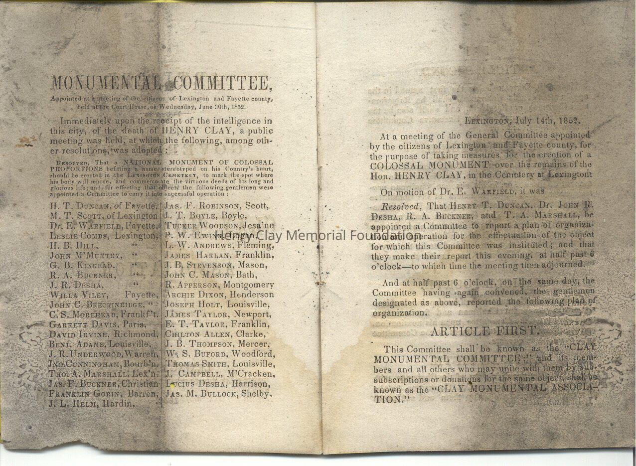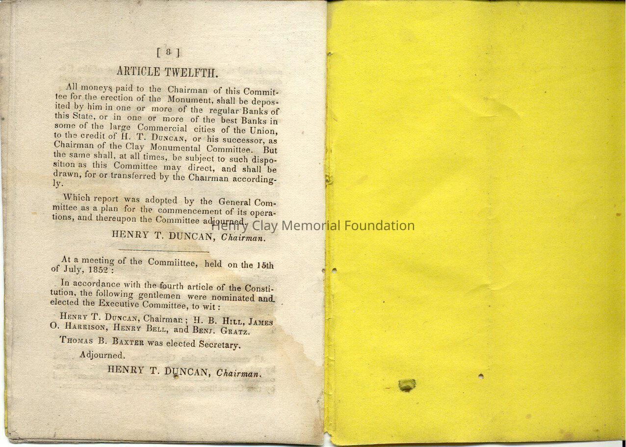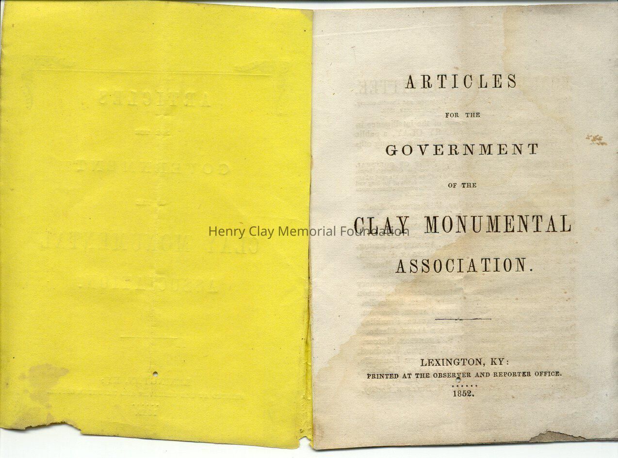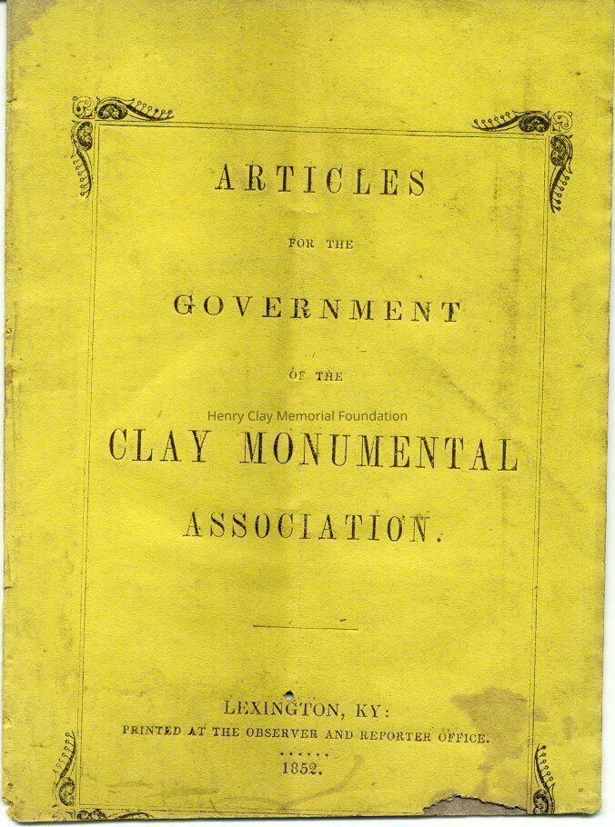 This booklet was distributed to those involved in the Clay Monument Association and laid out how they would operate to achieve the goal of constructimg the monument to Henry Clay in the Lexington Cemetery.