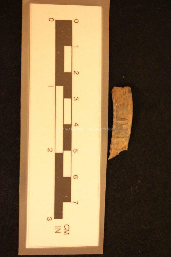 Small metal fragment, unknown material. Minor detail on edge, small raised circles