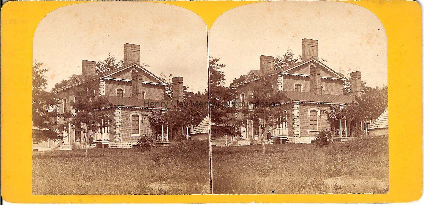 A stereoview of Ashland taken in the 1870s. It is mounted on a yellow board. The image is taken looking at the servant's wing corner.