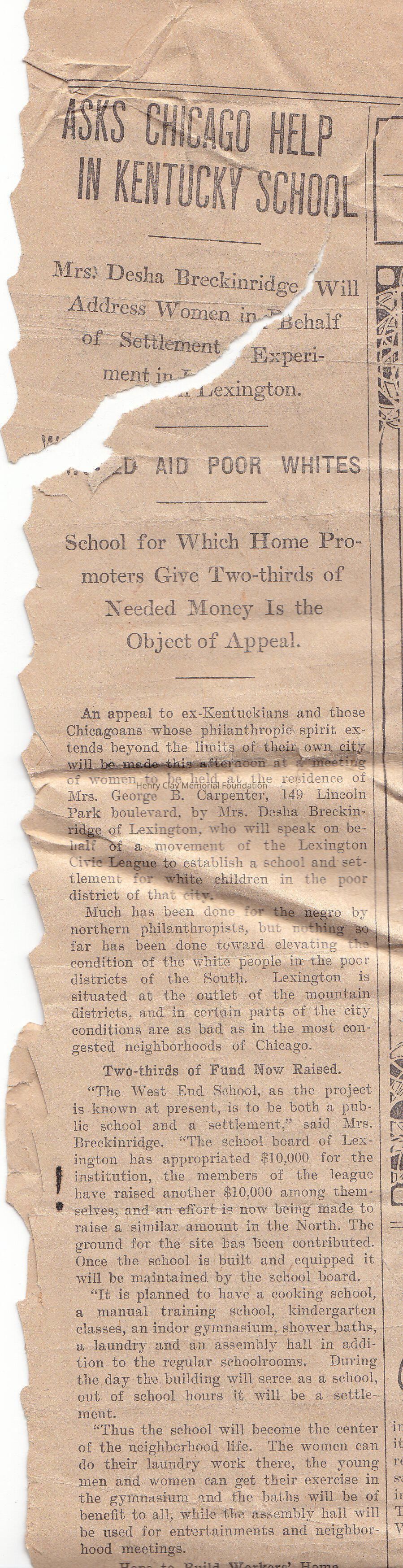A clipping about Mrs. Desha Breckinridge adress Women in behalf of settlement in Lexington, to aid poor whites.