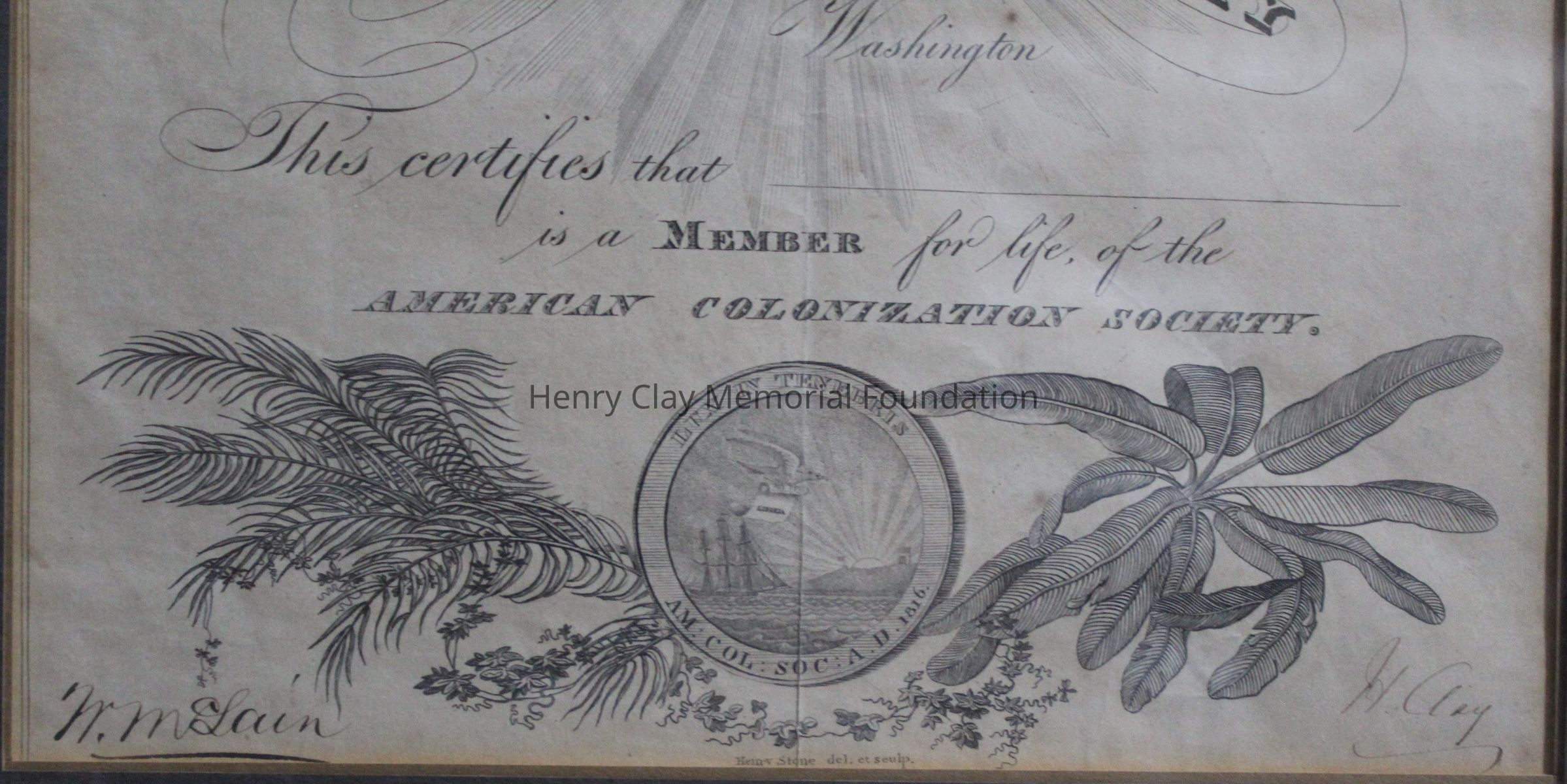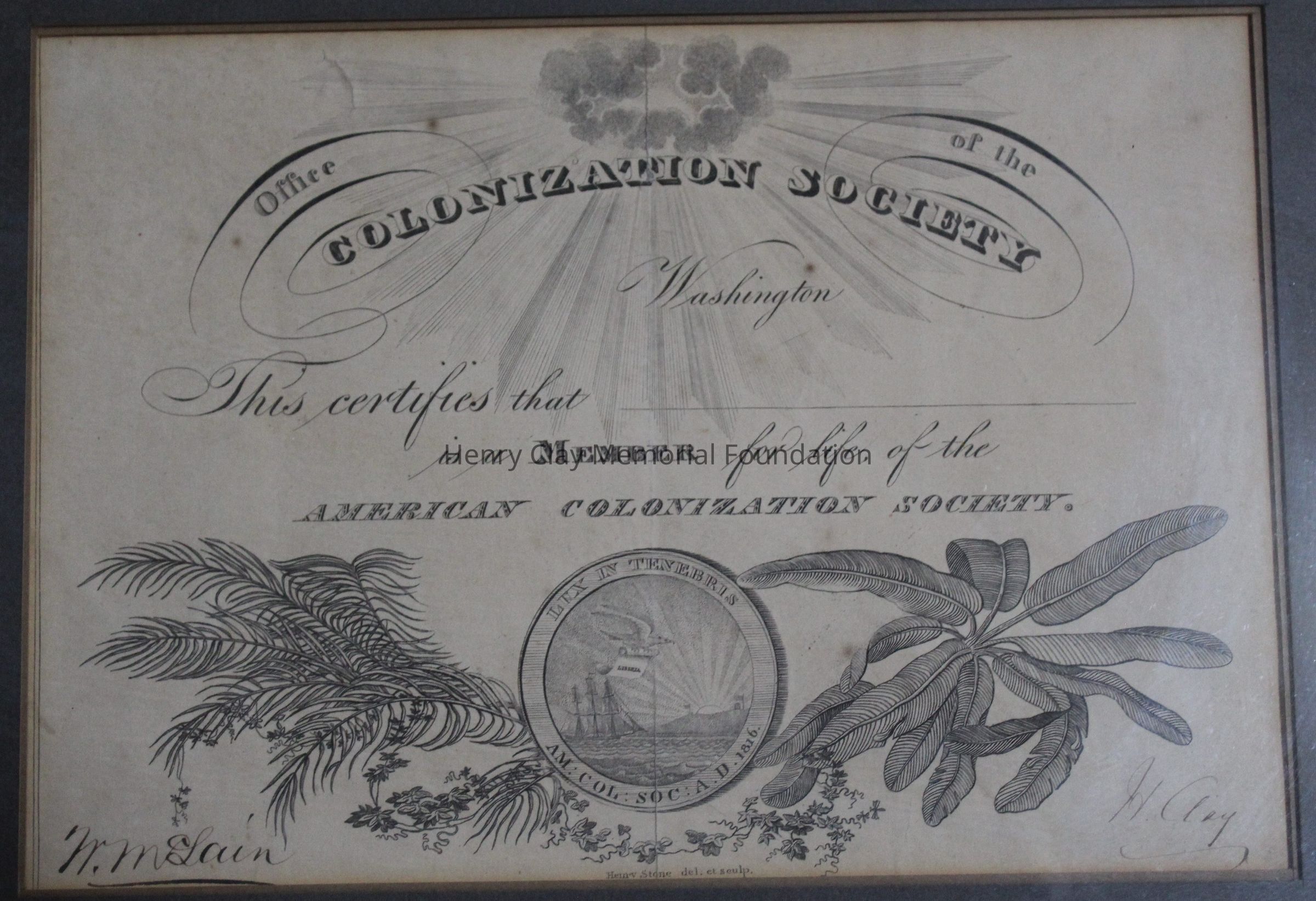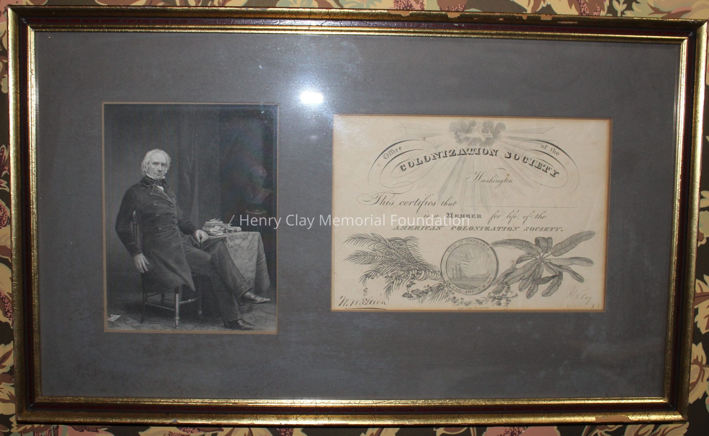 This item is a framed assemblage including a certificate of membership in the American Colonization Society and an engraving of Henry Clay mounted under a mat in a modern frame. The certificate reads, "Office of the Colonization Society Washington This certifies that ____________________ is a member for life of the American Colonization Society." Beneath the text is the seal of the ACS with a palm frond on the left and a rubber plant on the right. In the lower left corner is the signature W. McLain and in the right is the signature H. Clay. At the very bottom in the center is printed Henry Stone del. et sculpt. The engraving shows Henry Clay seated in a chair at a table on which are piled books and an inkwell. His legs are crossed, and his right arm hangs across the back splat of the chair. His left arm rests on the table. Clay is wearing a long black coat, a white shirt, a black cravat, black pants, and black shoes. The frame is a modern frame with a gilt outer edge, black painted middle, and gilt inner edge.Dimensions