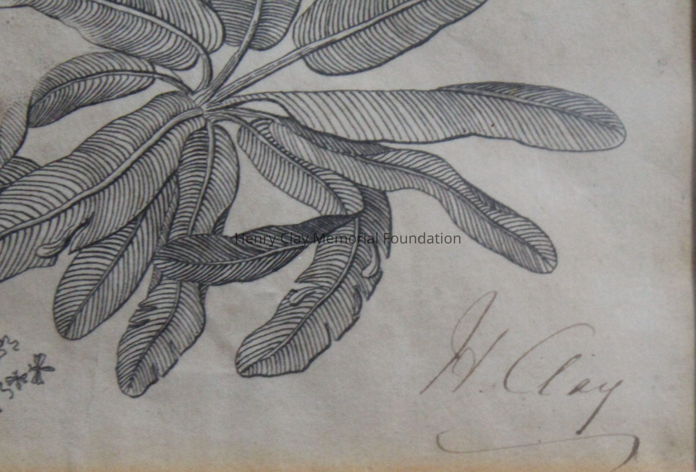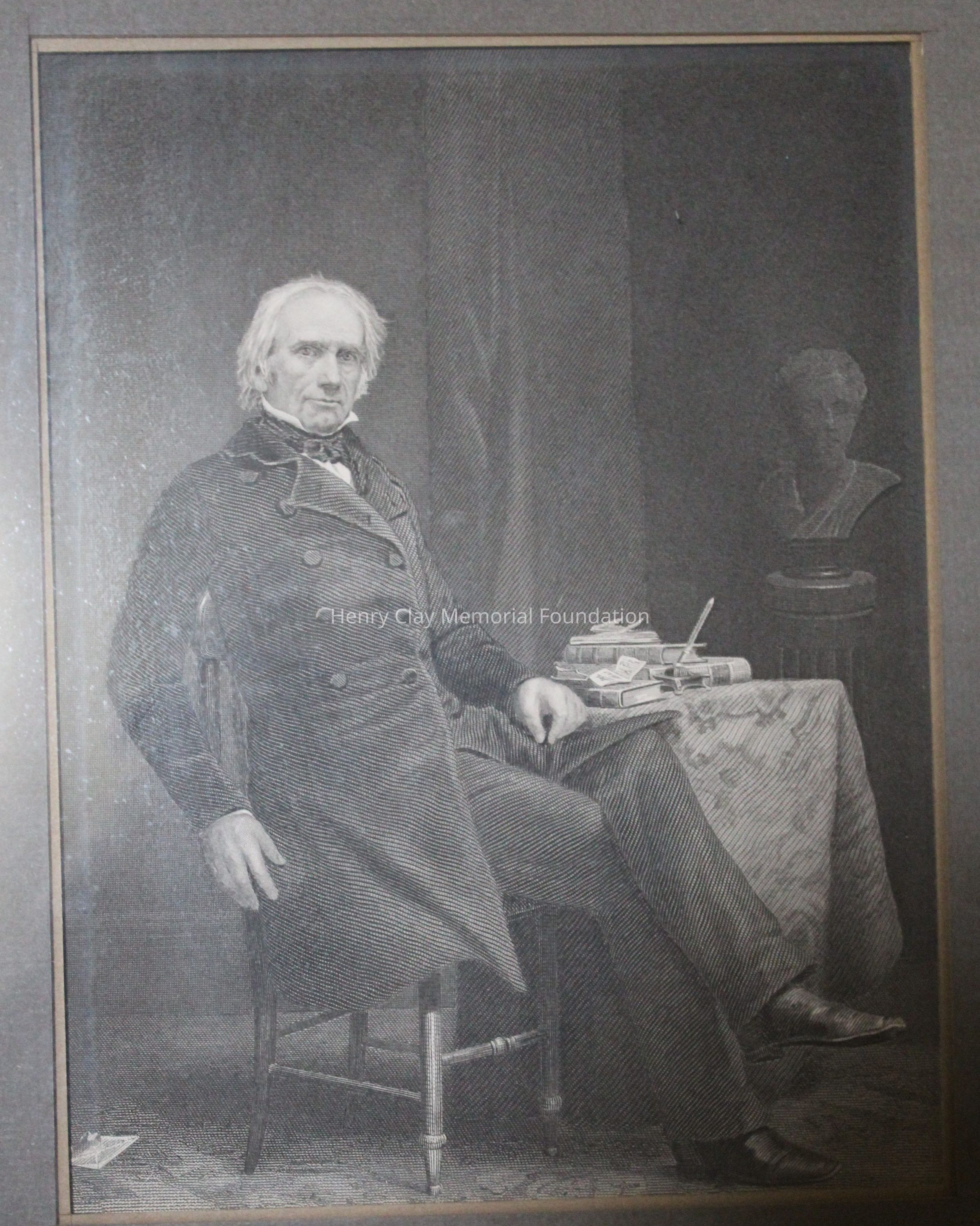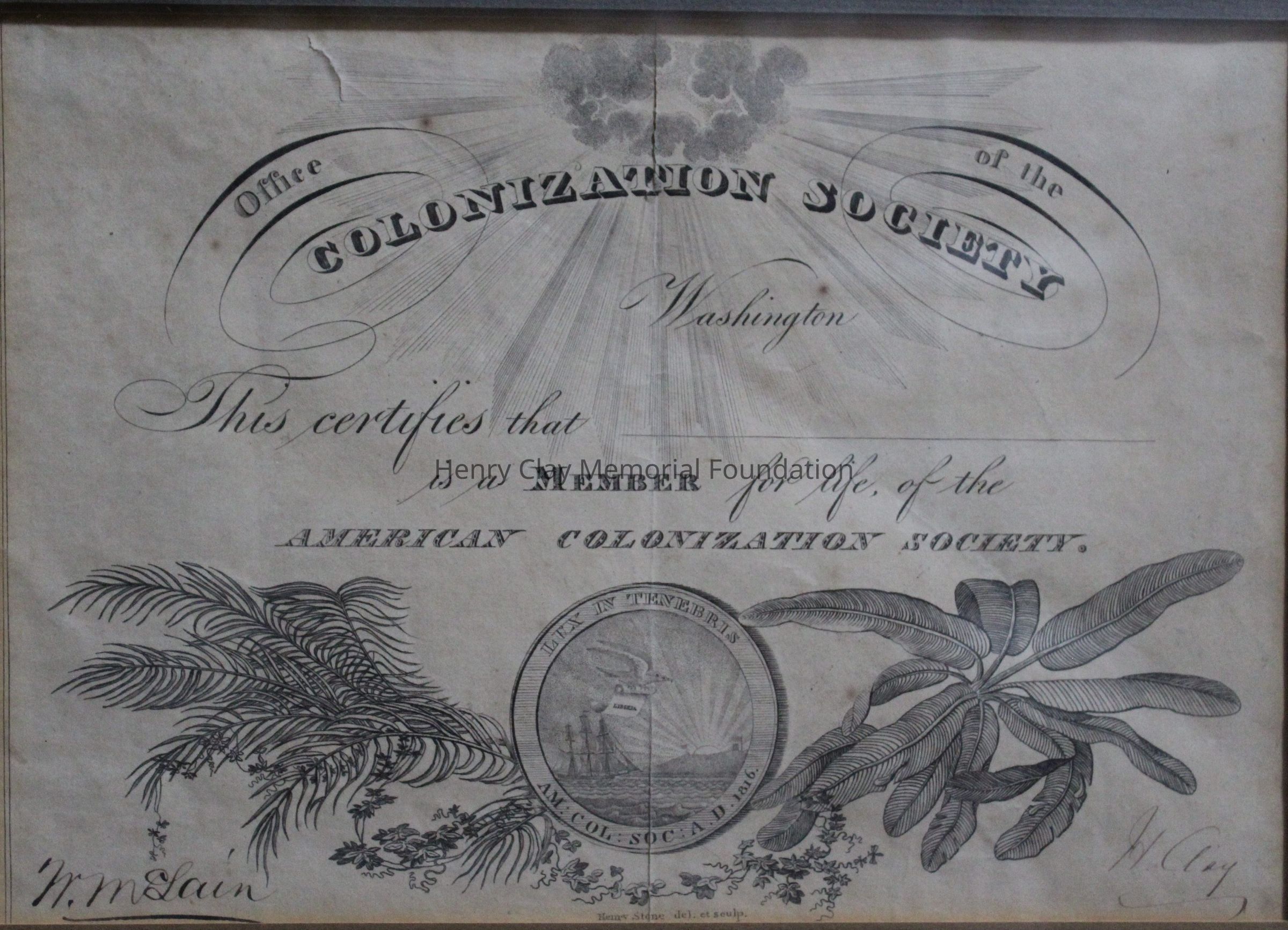 This item is a framed assemblage including a certificate of membership in the American Colonization Society and an engraving of Henry Clay mounted under a mat in a modern frame. The certificate reads, "Office of the Colonization Society Washington This certifies that ____________________ is a member for life of the American Colonization Society." Beneath the text is the seal of the ACS with a palm frond on the left and a rubber plant on the right. In the lower left corner is the signature W. McLain and in the right is the signature H. Clay. At the very bottom in the center is printed Henry Stone del. et sculpt. The engraving shows Henry Clay seated in a chair at a table on which are piled books and an inkwell. His legs are crossed, and his right arm hangs across the back splat of the chair. His left arm rests on the table. Clay is wearing a long black coat, a white shirt, a black cravat, black pants, and black shoes. The frame is a modern frame with a gilt outer edge, black painted middle, and gilt inner edge.Dimensions