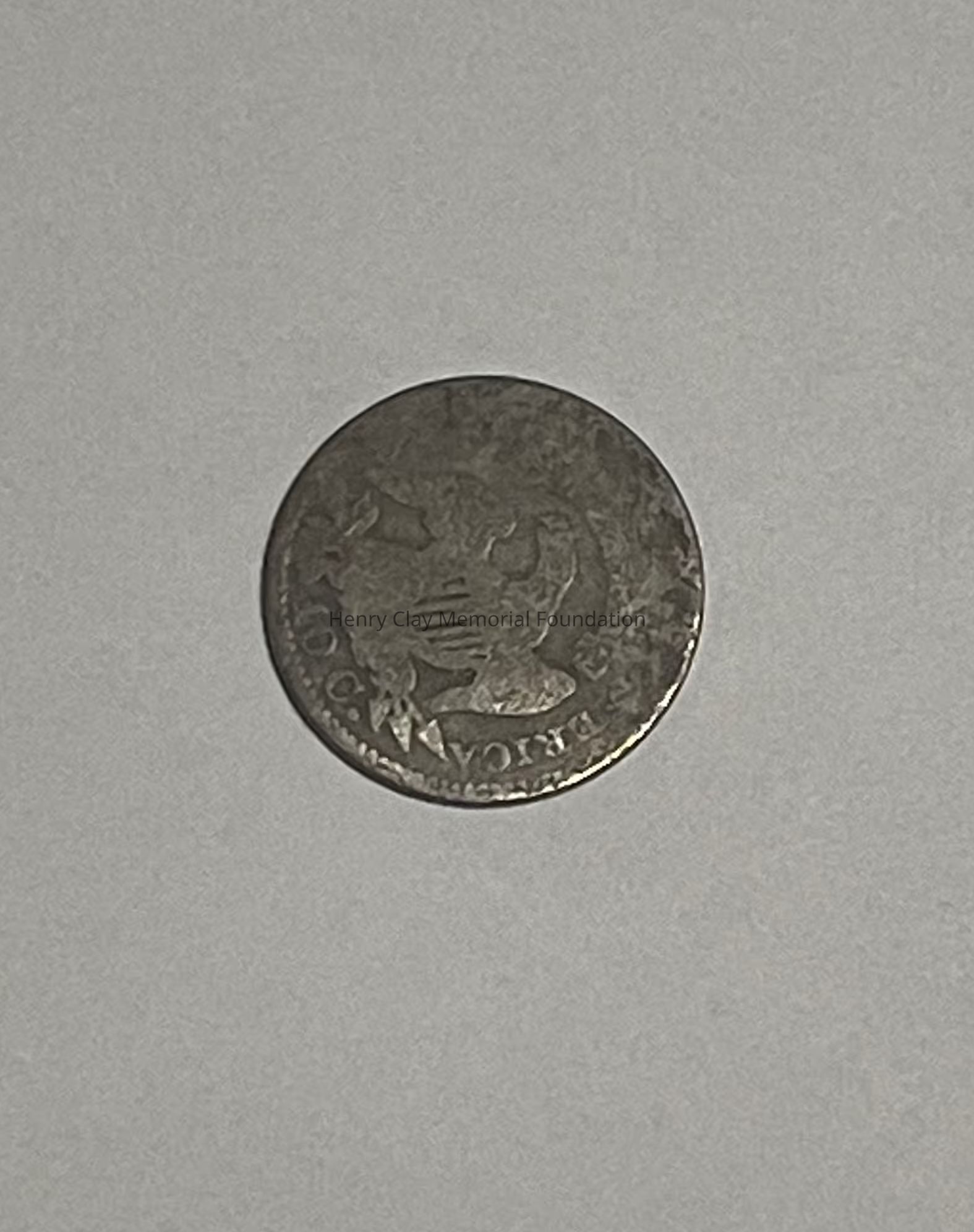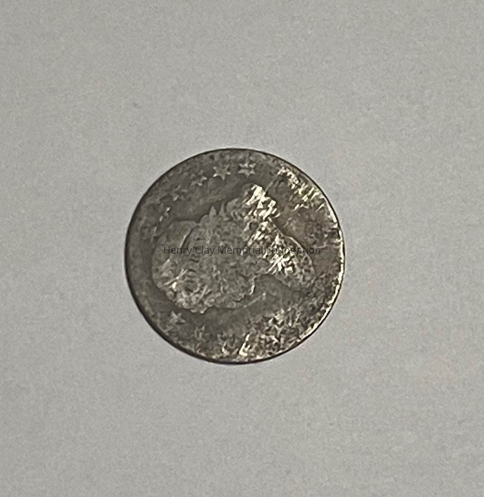 Small silver american coin with stars, the bust of a man, and an inscription reading "Liberty" and the date 1821on one side, on the other a carving on an eagle and the words "america" and "10 C"
