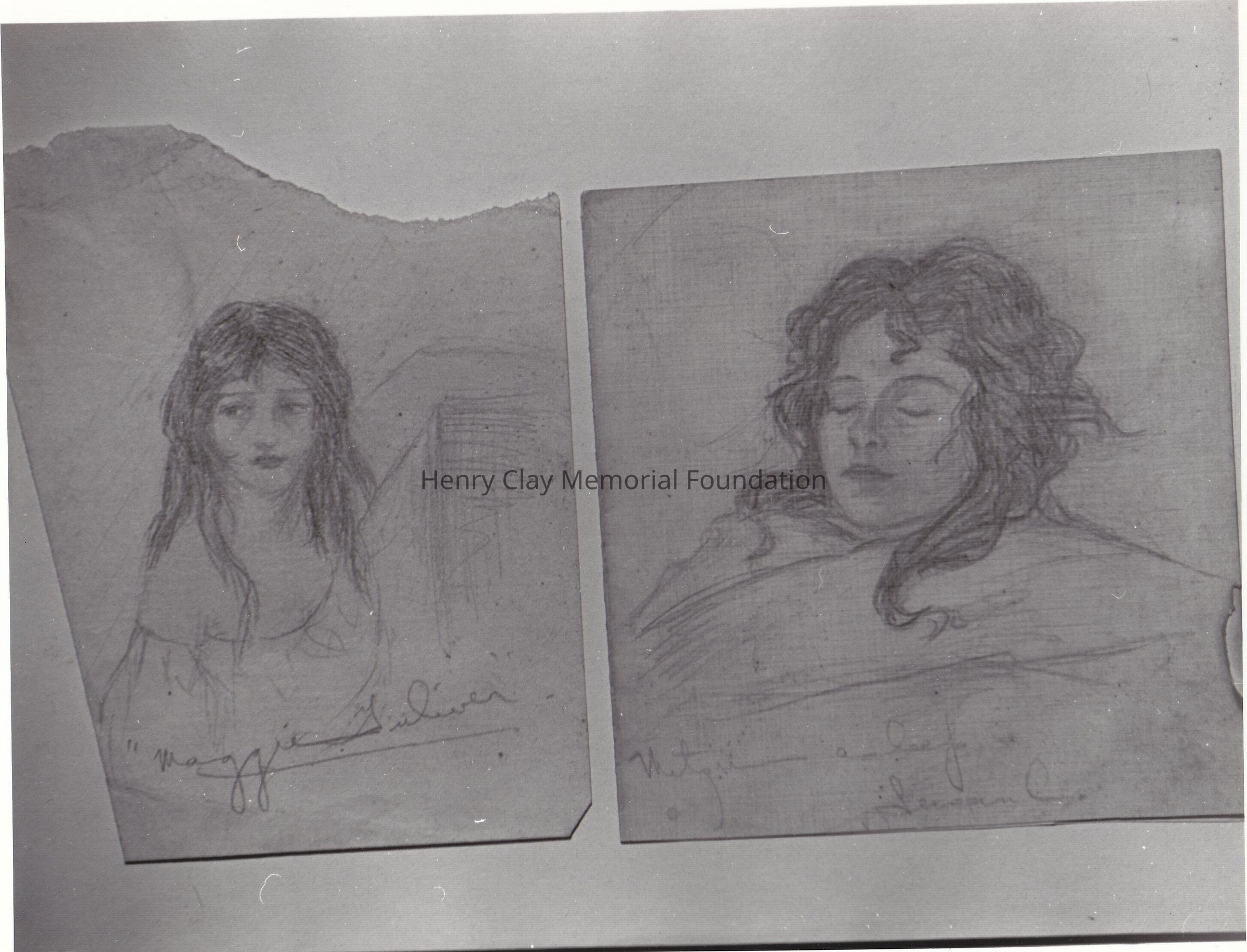 A photograph of two drawings made by Susan Clay Sawitzky. It depicts a woman with long hair on the left and beneath there is the name of Maggie, the second is depicting a woman sleeping, and beneath a name Metzie asleep.Dimensions