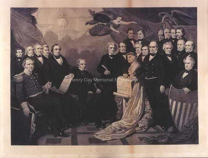 Print of 22 men with bust of George Washington above scroll of US Constitution, female figure flying above them all. Printed below image: "Painted by T.H. Matteson. Engraving by H.S. Sadd, 1852 / UNION / Engraved by W. Pate." In mahogany frame with gilt inner lip.Dimensions