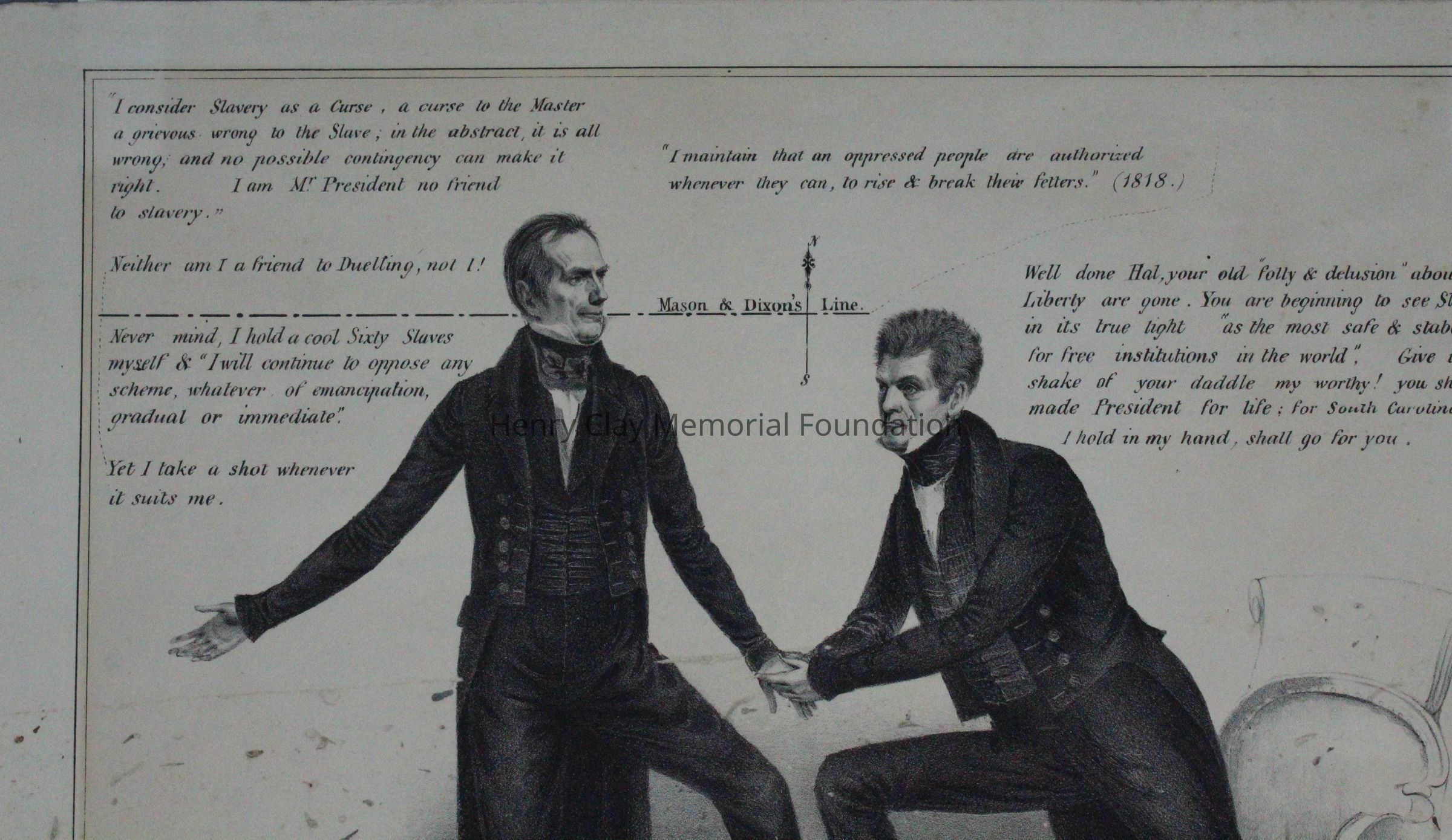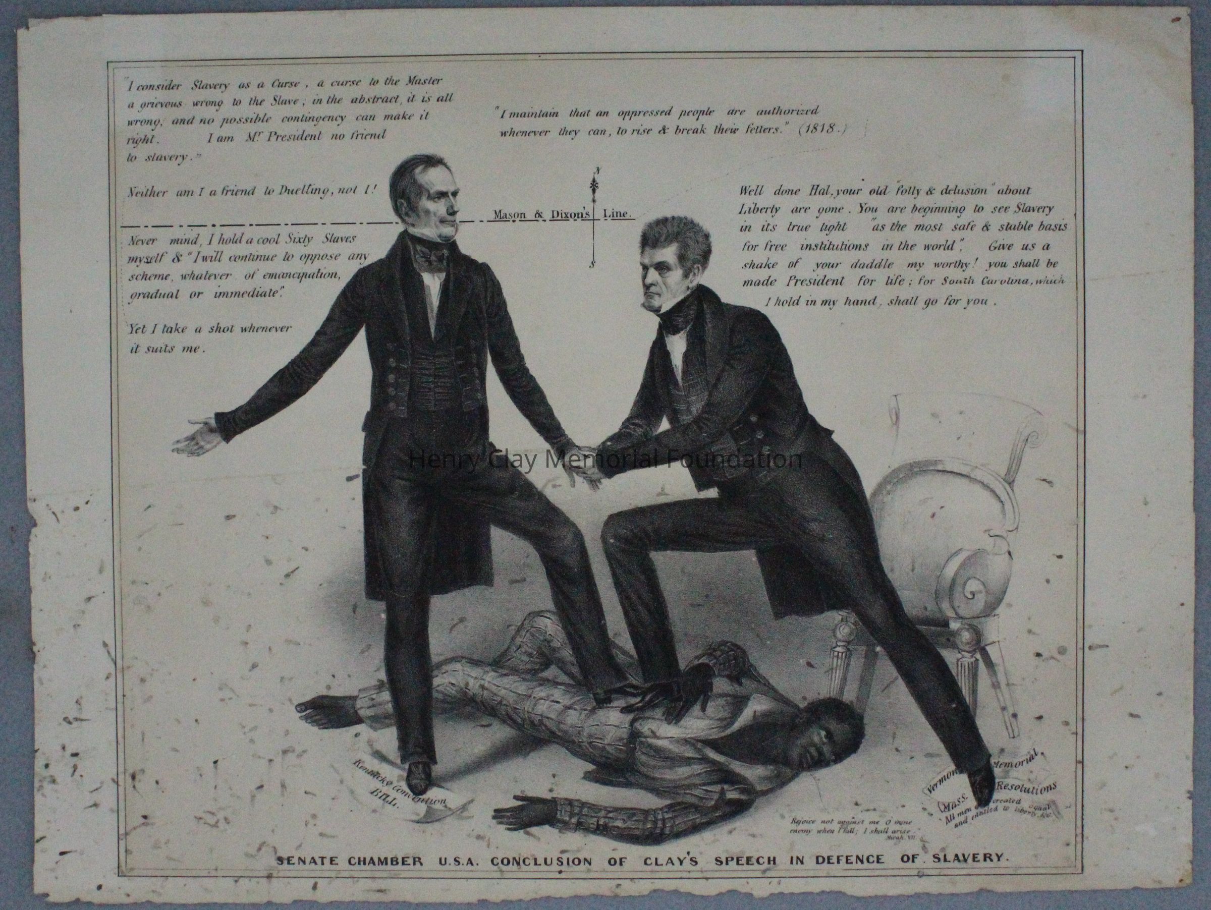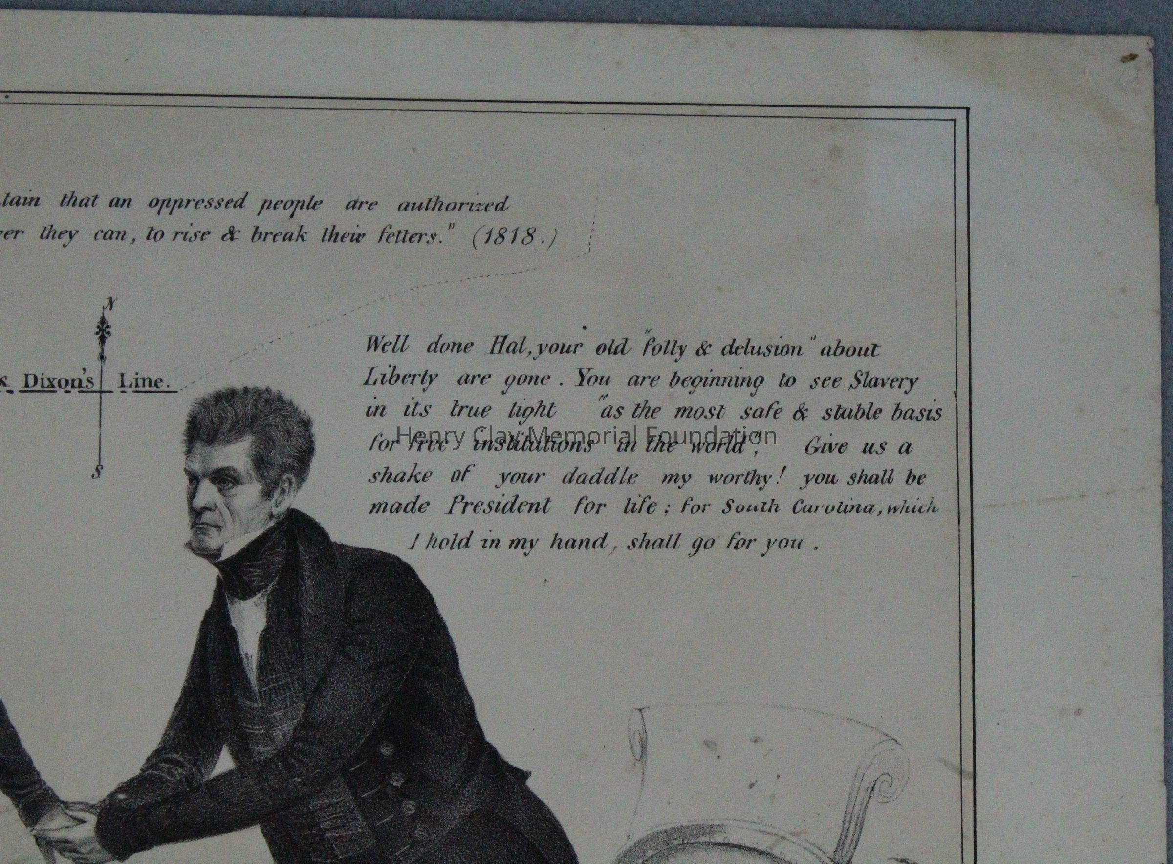 This cartoon depicts Henry Clay and John C. Calhoun standing on an enslaved man who is laying on the ground on his back. In the upper right Hnery Clay says "I consider Slavery as a curse, a curse to the master a greivous wrong to the Slave; in the abstract, it is all wrong and no possible contingency can make it right. I am Mr. President no friend to slavery." Bensath that Clay says "Neither am I a friend to duelling, not I." In the middle is aquote from Clay that says "I maintain that an oppressed people are authorized whenever they can, to rise and break their fetters." Underneath these quotes is a line labelled Mason & Dixon Line with a vertical line ending in arrows pointing north and south. Below the line next to Clay it says Never mind, I hold a cool sixty slaves myself & "I will continue to oppose any scheme of emancipation, gradual or otherwise." Below that it says Yet, I take a shot whenever it suits me. Next to Calhoun it says Well done Hal, your old "folly & delusion" about liberty are over. You are beginning to see Slavery in its true light "as the most safe & stable basis for free institutions in the world." Give us a shake of your daddle my worthy! You shall be made president for life; for South Carolina, which I hold in my hand, shall go for you. Under Clay's right foor is a piece of paper that reads Kentucky Compromise Bill. Calhoun's left foot is on a piece of paper that reads Vermont Memorial Mass. Resolutions All menare created equal and entitled to liberty, etc. Clay and Cahoun both have one foot on a prostrate enslaved man who is saying Rejoice not against me O enemy mine for when I fall I shall arise. Micah VII. Behind Calhoun is a chair from whihc he has arisen.Dimensions