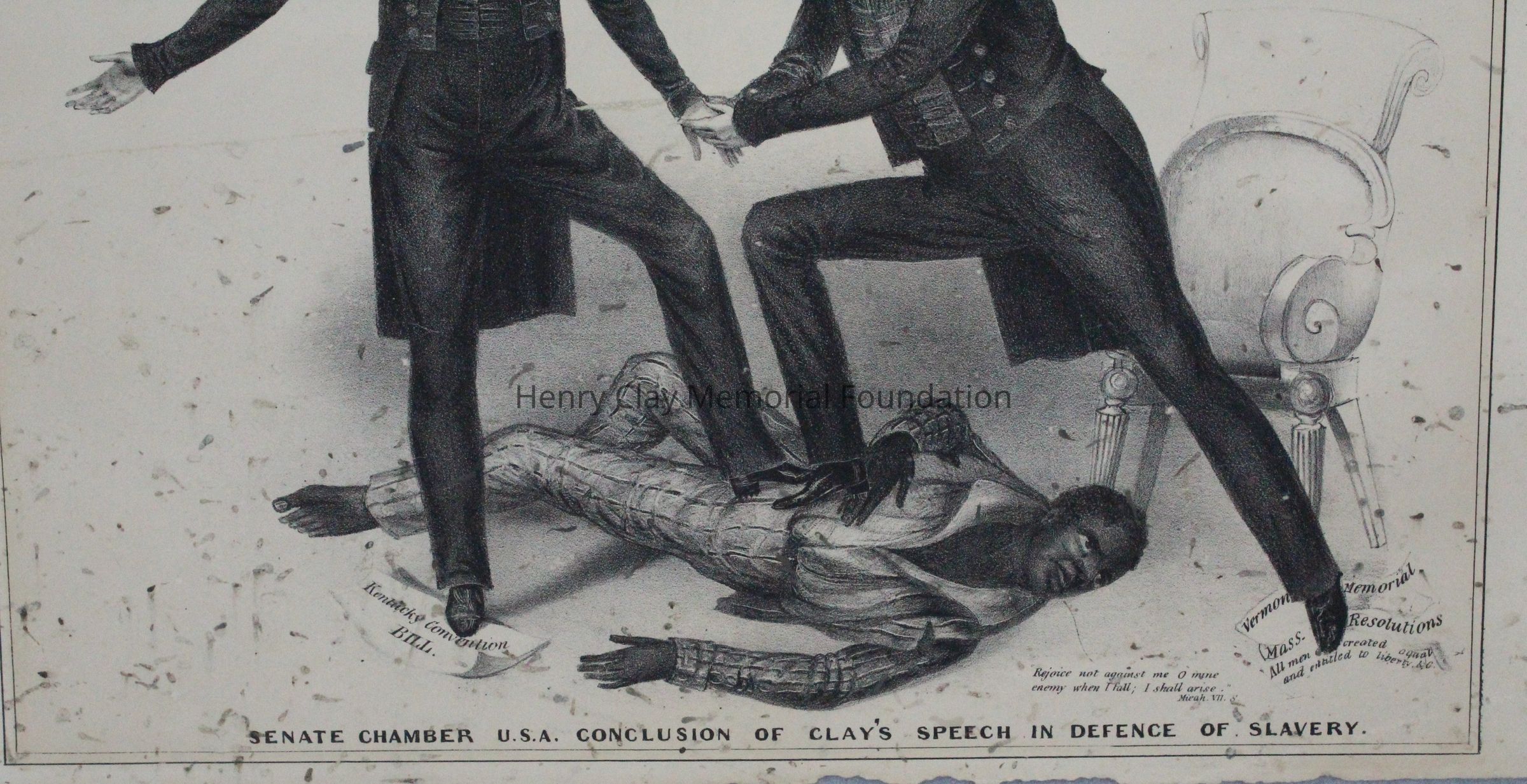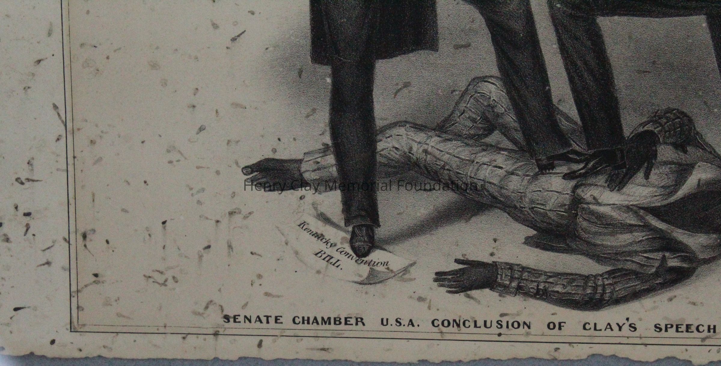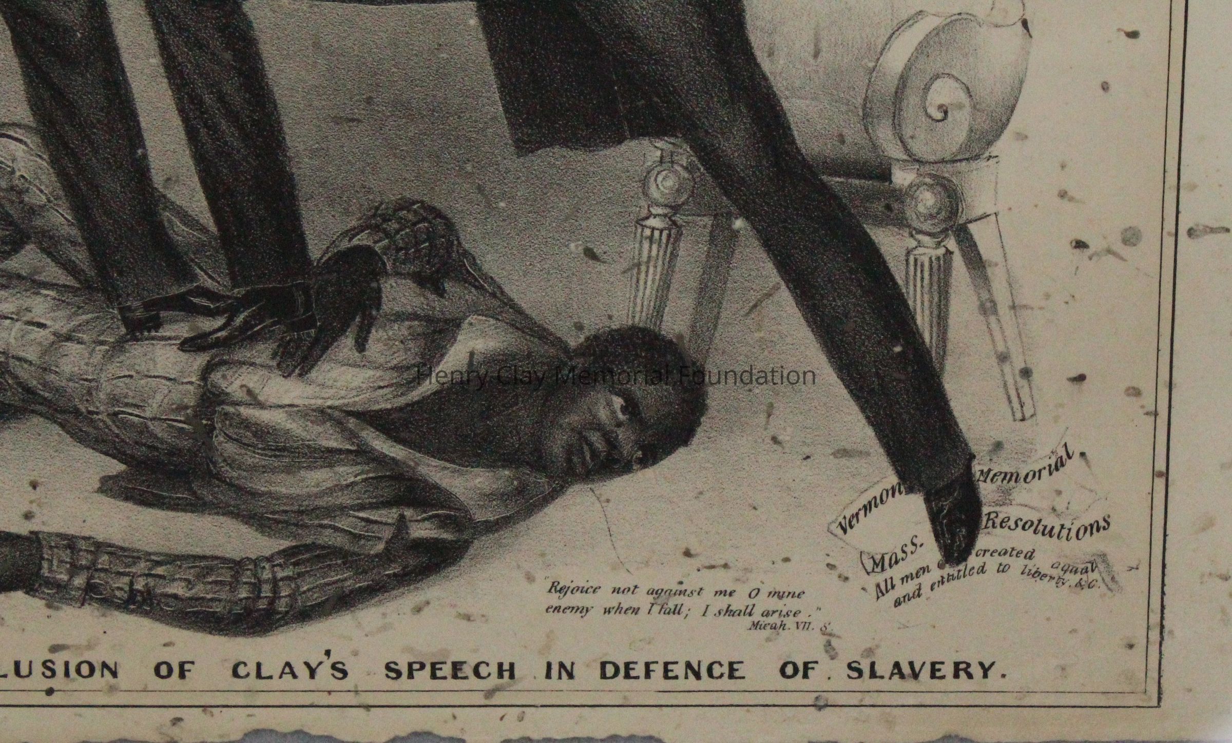 This cartoon depicts Henry Clay and John C. Calhoun standing on an enslaved man who is laying on the ground on his back. In the upper right Hnery Clay says "I consider Slavery as a curse, a curse to the master a greivous wrong to the Slave; in the abstract, it is all wrong and no possible contingency can make it right. I am Mr. President no friend to slavery." Bensath that Clay says "Neither am I a friend to duelling, not I." In the middle is aquote from Clay that says "I maintain that an oppressed people are authorized whenever they can, to rise and break their fetters." Underneath these quotes is a line labelled Mason & Dixon Line with a vertical line ending in arrows pointing north and south. Below the line next to Clay it says Never mind, I hold a cool sixty slaves myself & "I will continue to oppose any scheme of emancipation, gradual or otherwise." Below that it says Yet, I take a shot whenever it suits me. Next to Calhoun it says Well done Hal, your old "folly & delusion" about liberty are over. You are beginning to see Slavery in its true light "as the most safe & stable basis for free institutions in the world." Give us a shake of your daddle my worthy! You shall be made president for life; for South Carolina, which I hold in my hand, shall go for you. Under Clay's right foor is a piece of paper that reads Kentucky Compromise Bill. Calhoun's left foot is on a piece of paper that reads Vermont Memorial Mass. Resolutions All menare created equal and entitled to liberty, etc. Clay and Cahoun both have one foot on a prostrate enslaved man who is saying Rejoice not against me O enemy mine for when I fall I shall arise. Micah VII. Behind Calhoun is a chair from whihc he has arisen.Dimensions