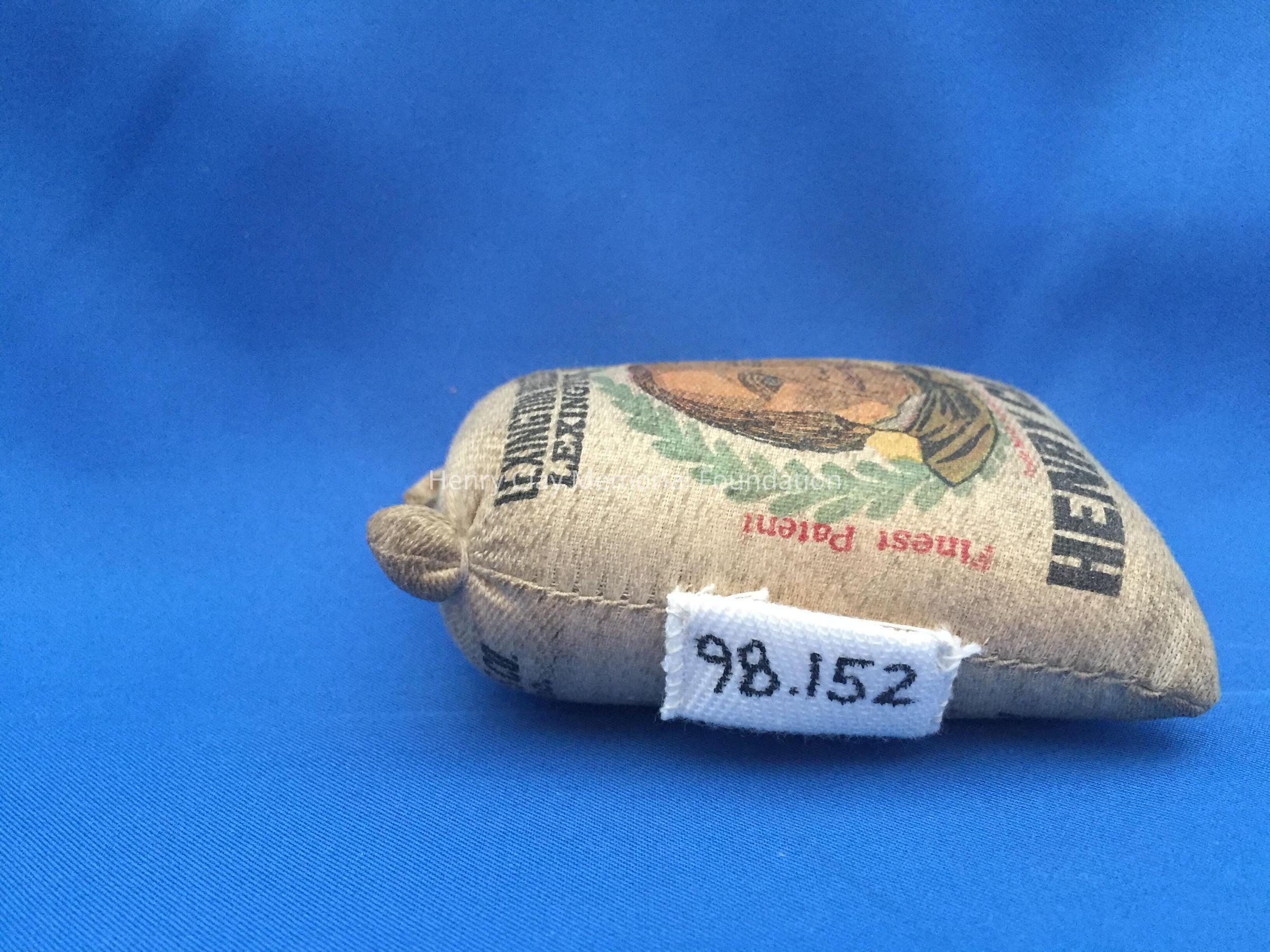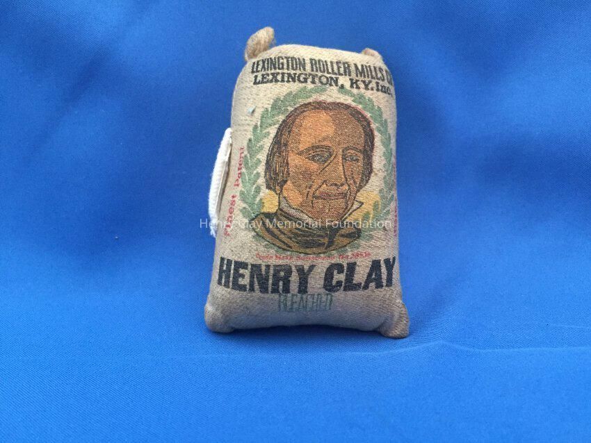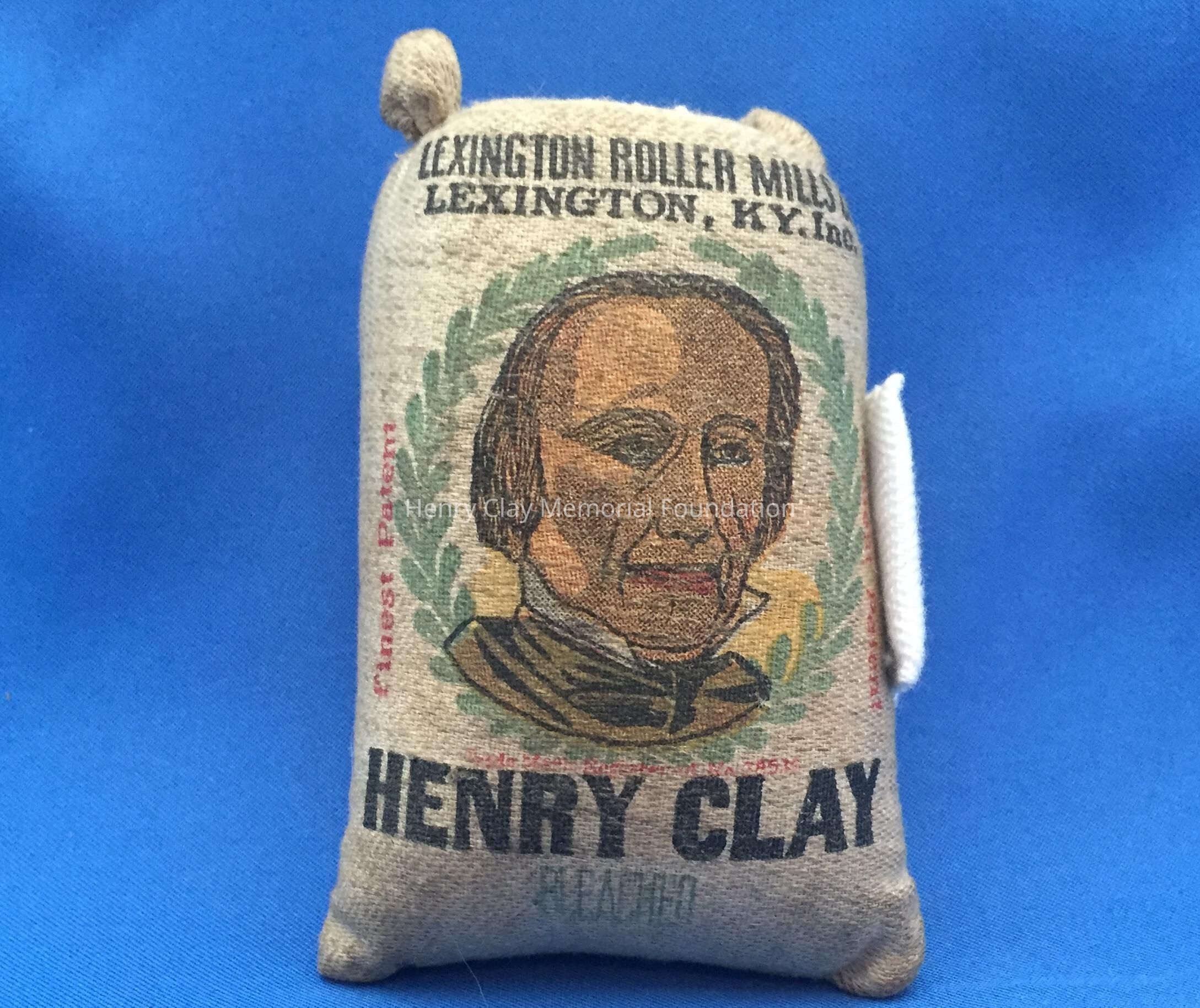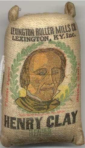 Miniature white flour bag with corners tied and stuffed. Image of Henry Clay enclosed in wreath. Lettering on bag in black, red and green colors, "Lexington Roller Mills Co. / Lexington, Ky. Inc. / Henry Clay / Bleached / Finest Patent [printed vertically on sides]." There is a fine line of red lettering just beneath image of Clay, but it is too small to read.