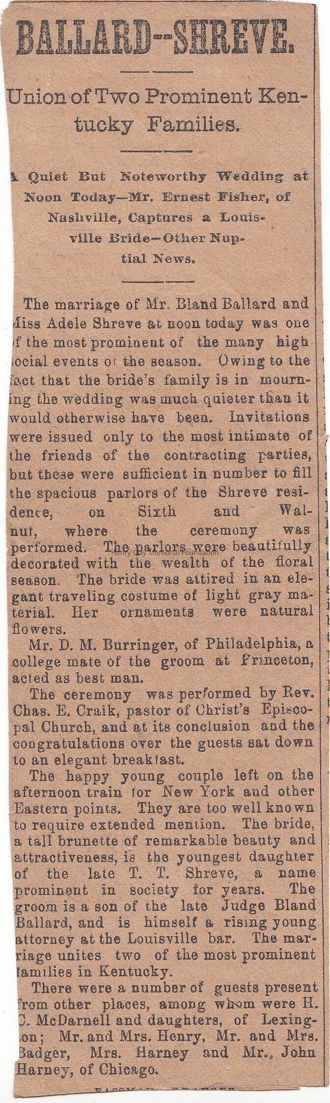 A small clipping about the marriage of Mr. Bland Ballard and Miss Adele Shreve. Two of the most prominent Kentucky families.