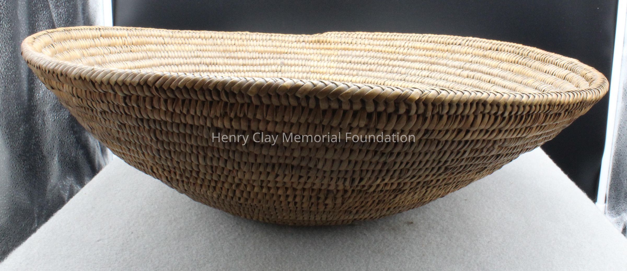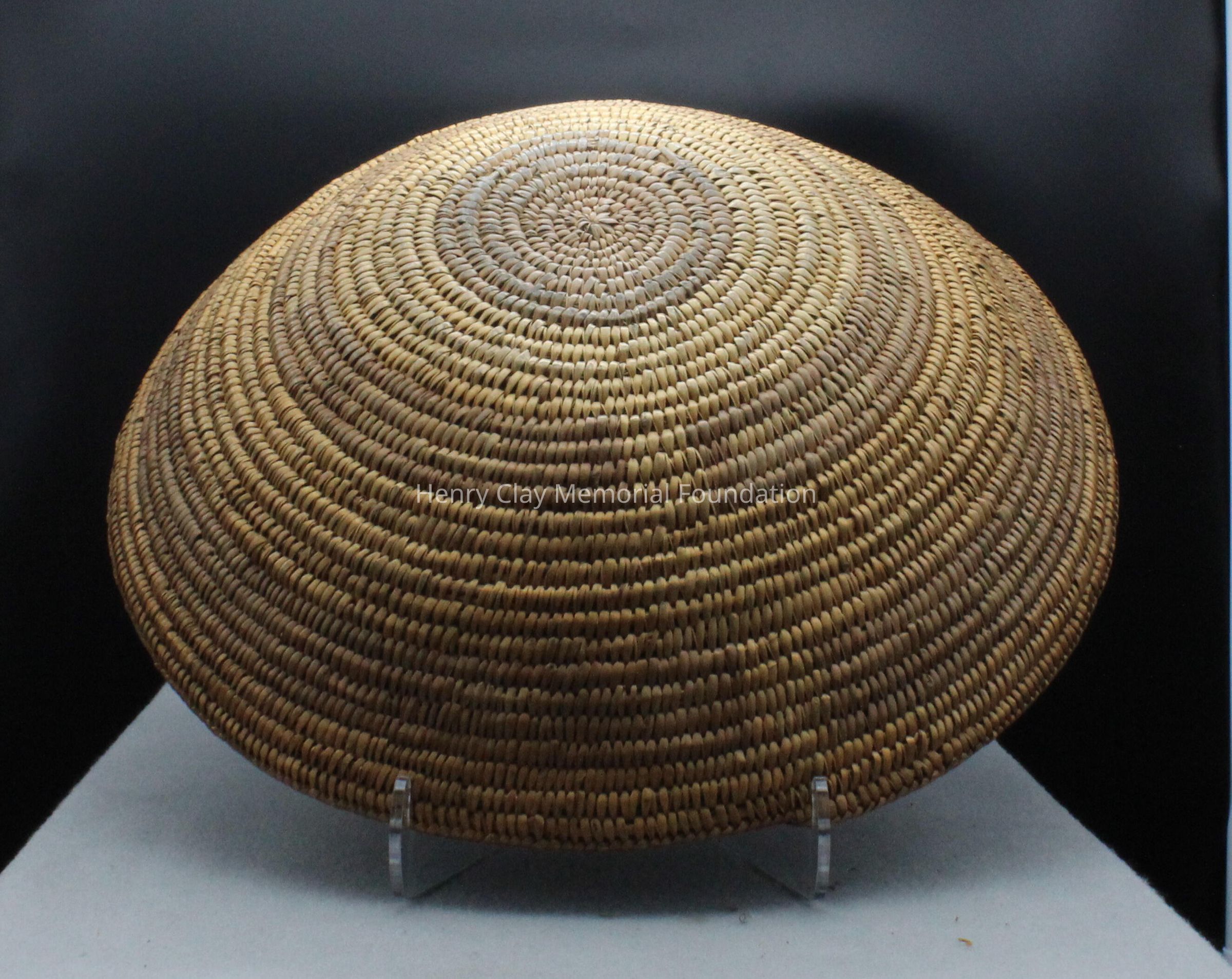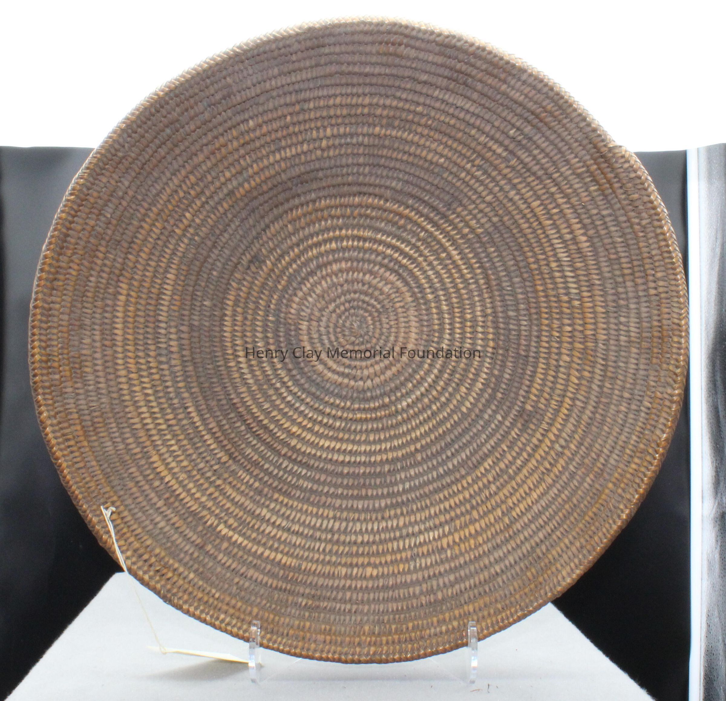Large round shallow bowl tightly woven with strips of grass, reed, or other organic material. Dark brown interior, two-toned exterior of light and dark brown.