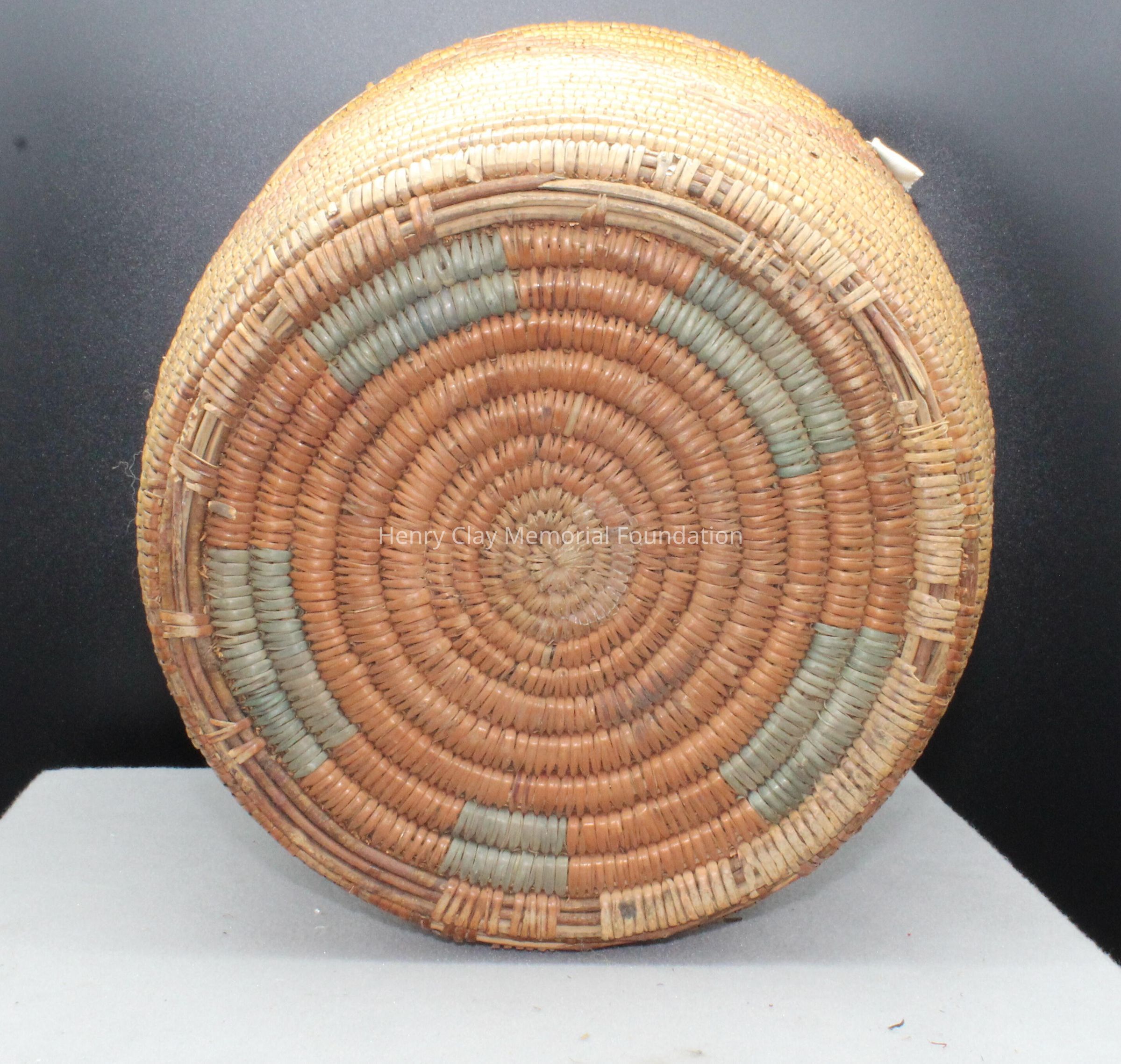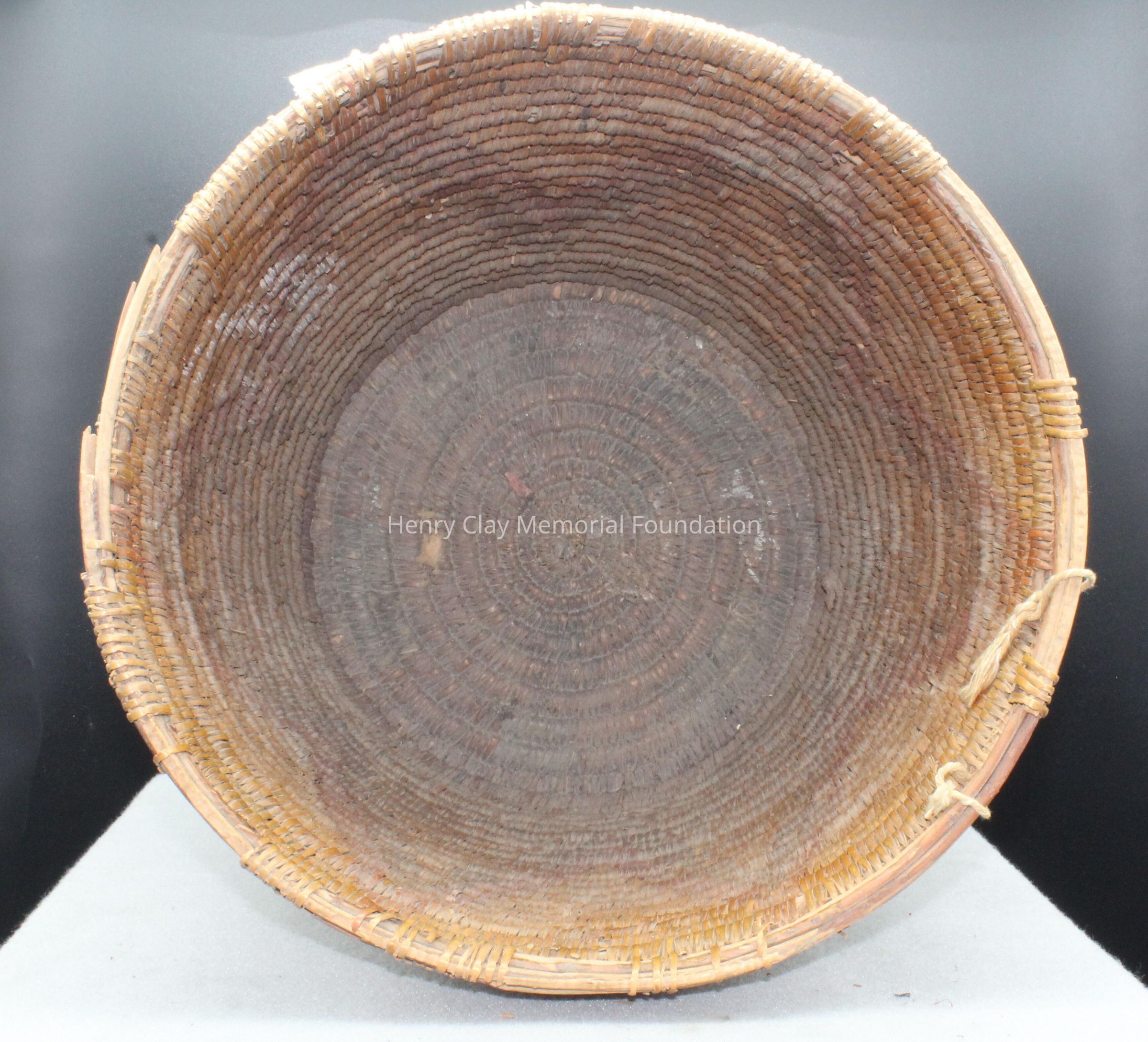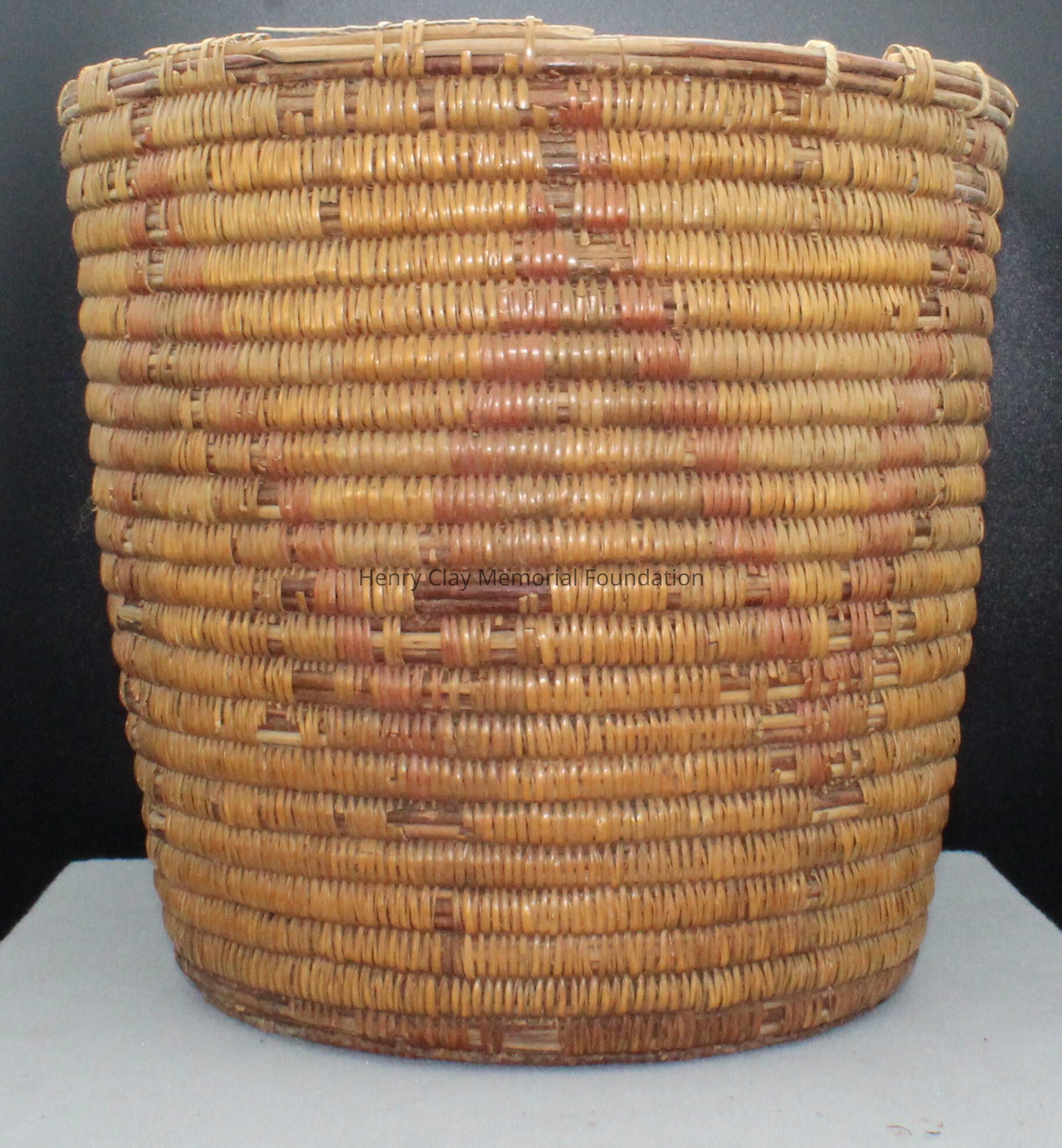 Large cylindrical basket woven with strips of reed or other organic material and long thinbrances. The predominant color of the basket is tan brown with orange zig-zag design around the circumference. The bottom of the basket is orange with green sections.