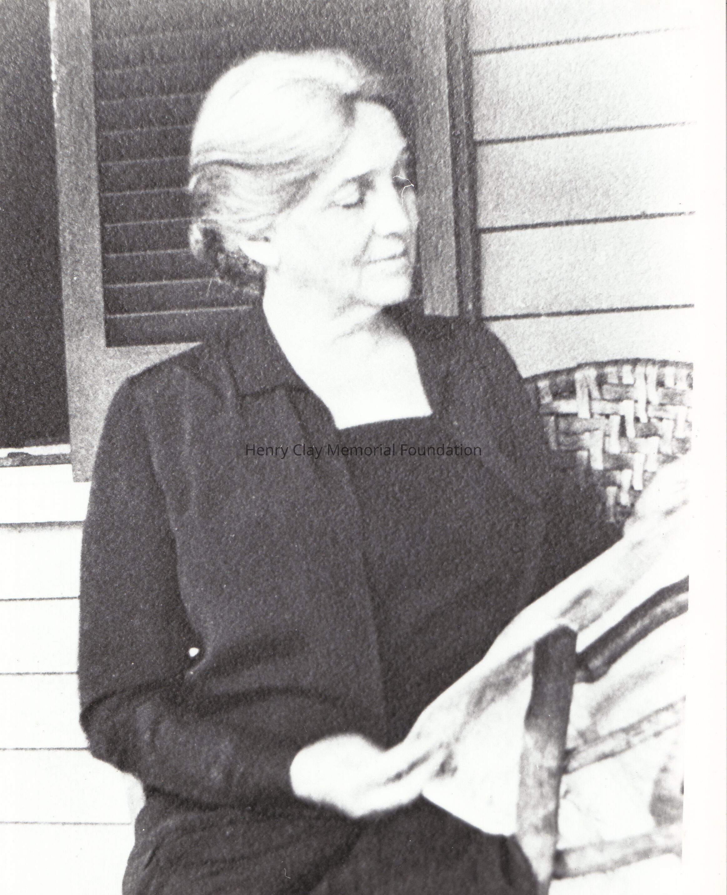 A copy of a balck and white photograph of Mariah Pepper Clay, reading a newspaper sitting on a chair, in what seems a front porch.