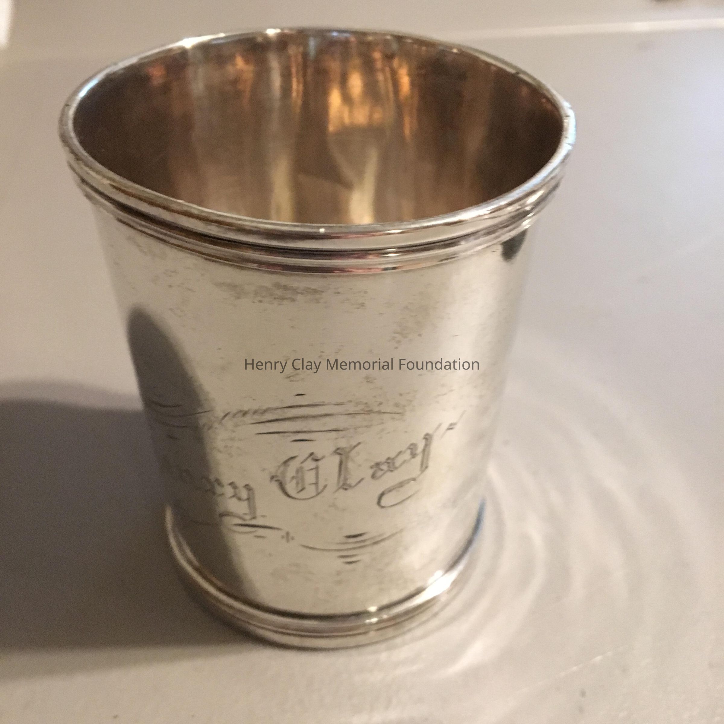 I coin silver julep cup. It tapers from top top to bottom and has applied lip and foot. The cup is engraved "Henry Clay and the engraving runs diagonally from bottom to top on one side. The botton of the cup is stamped "Garner & Winchester" Lex KY" and a third illegible mark.