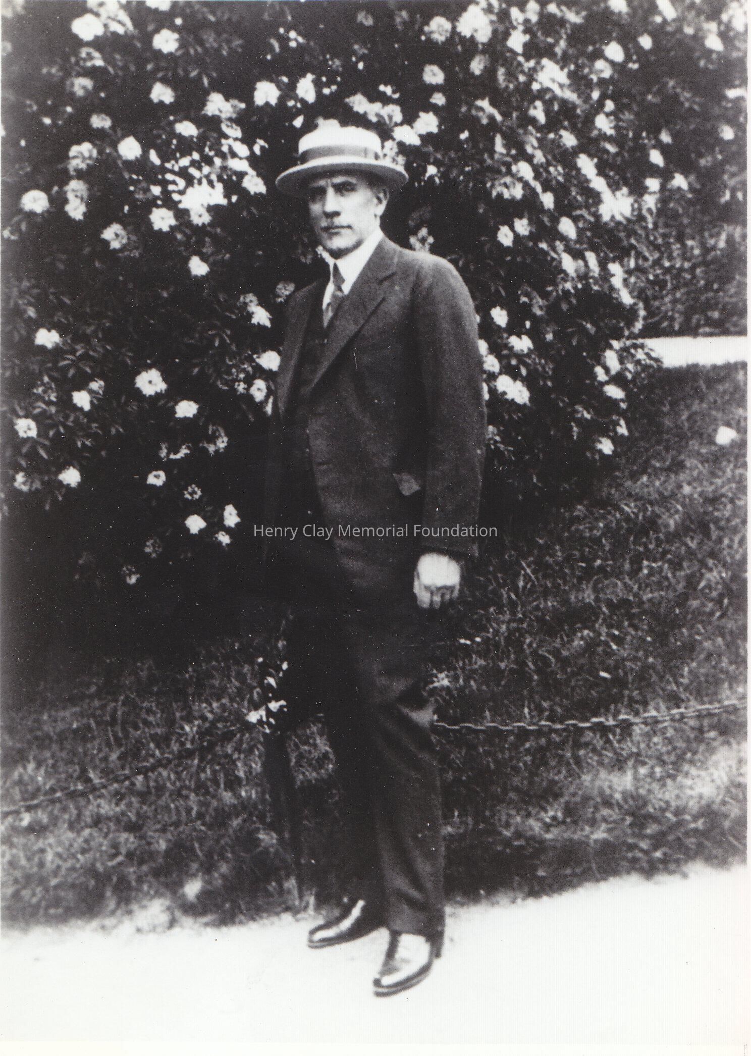 A copy of a black and white photograph of Vassili Sawitzky standing in a park. He is wearing a dark suit, a dark tie, white shirt and a straw hat.Dimensions