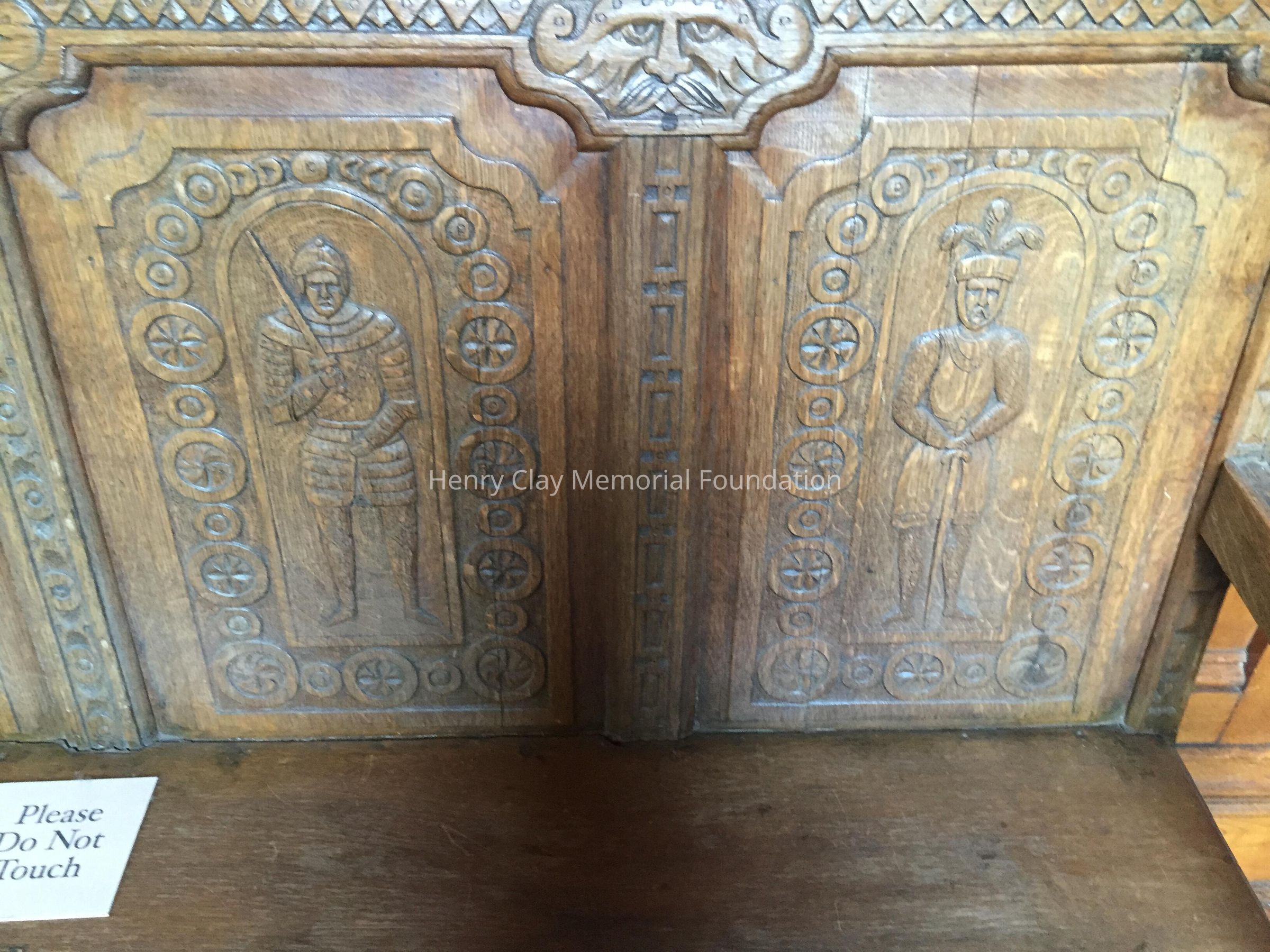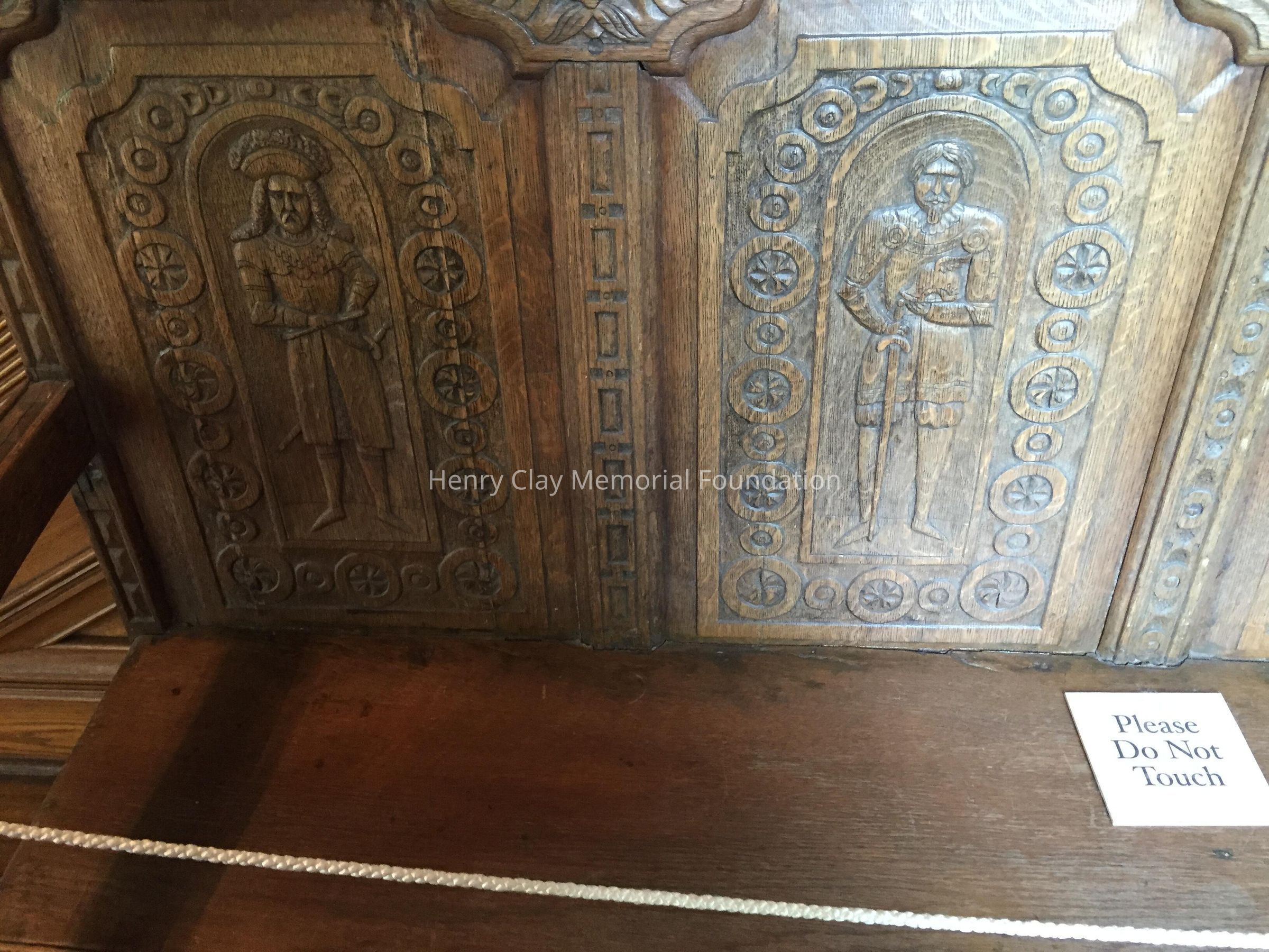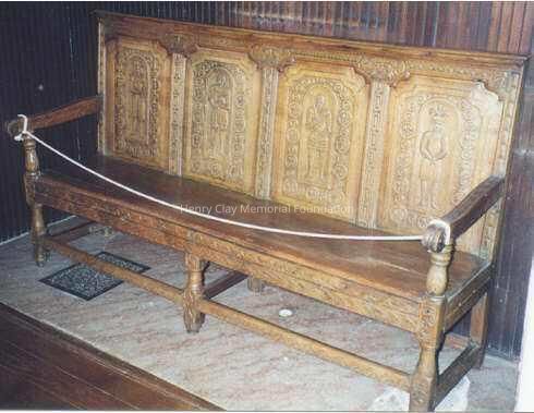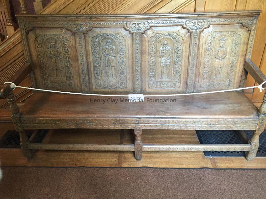 Carved oak bench. Back is comprised of four panels carved with standing medieval figures. Scrolled arms at both ends. Rails on legs.