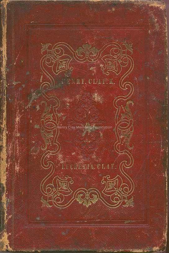Large red, hardback bible. Matching decorative gold detail on front and back covers. Gold embossed on spine, "COTTAGE BIBLE VOLUME 1." Gold embossed on front cover, "HENRY CLAY. K. / & / LUCRETIA CLAY." Signed in pencil on one of the front flyleafs, "Susan M. Clay / Ashland 1844," and below that in ink, "A present from my dear / Father in Law Hon. Henry Clay / & my Mother in Law Mrs. Lucretia / Clay in 1844." "The 1st year of my married life." Signed on next page in ink, "Susan M. J. Clay / Ashland 1844" and below that in pencil, "Susan M. J. Clay / Ashland July 1844." Publisher's information: "The Cottage Bible" edited by Rev. William Patton, embellished with engravings and maps, Volume 1 [Old Testament], (Hartford: Case, Tiffany & Burnham, 1842).Dimensions