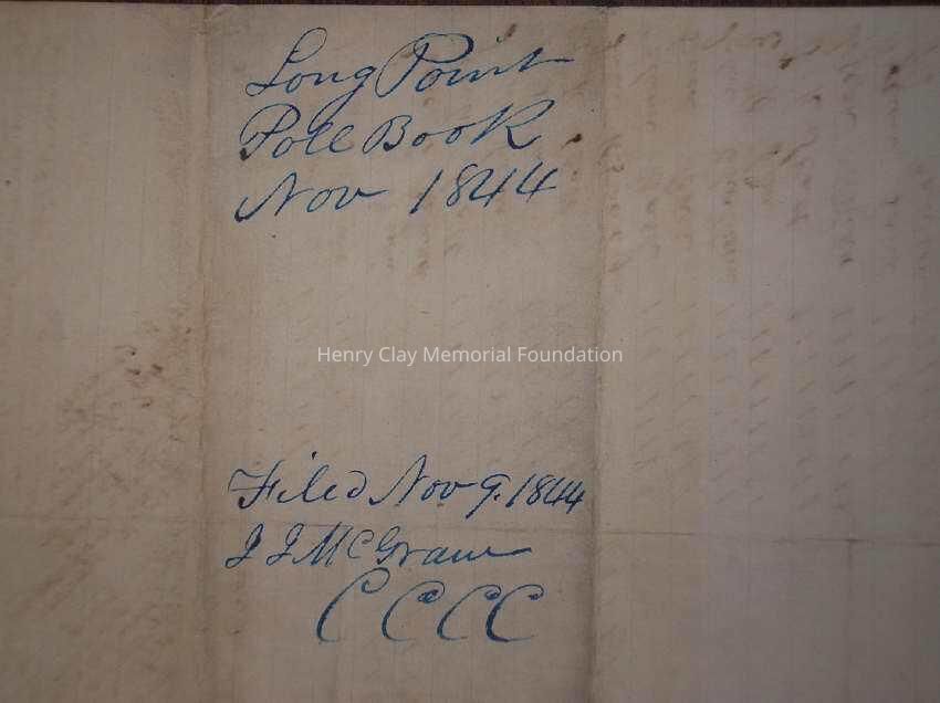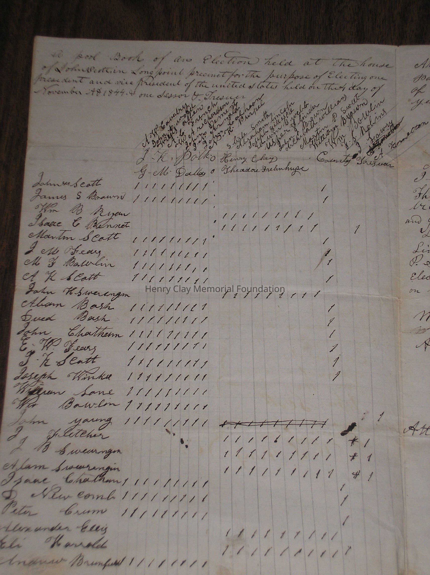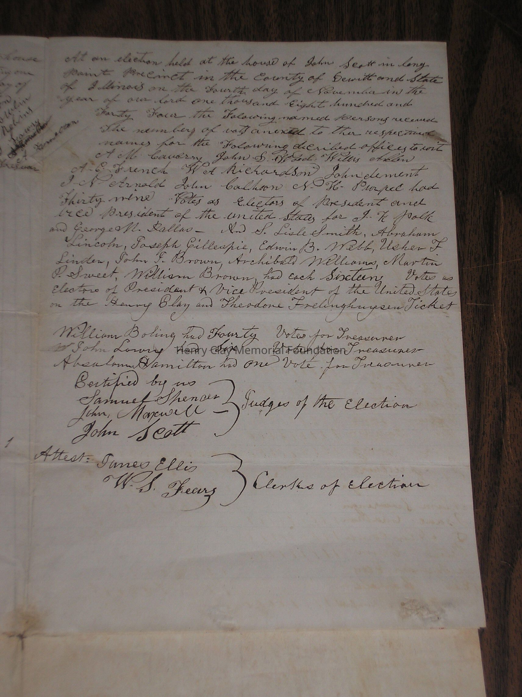 An 1844 Presidential Campaign Precinct document from Dewit County, Illinois showing Abraham Lincoln as an elector and Henry Clay as a presidential candidate.