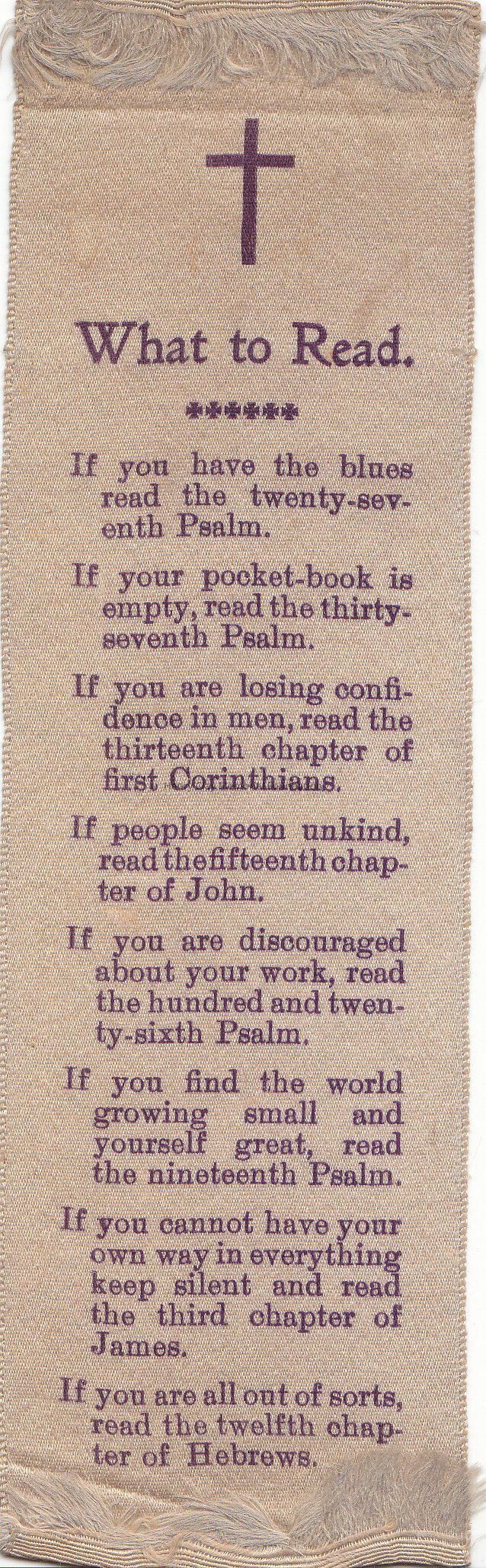A bookmark with fringes at both ends, a cross on top and a written psalm.