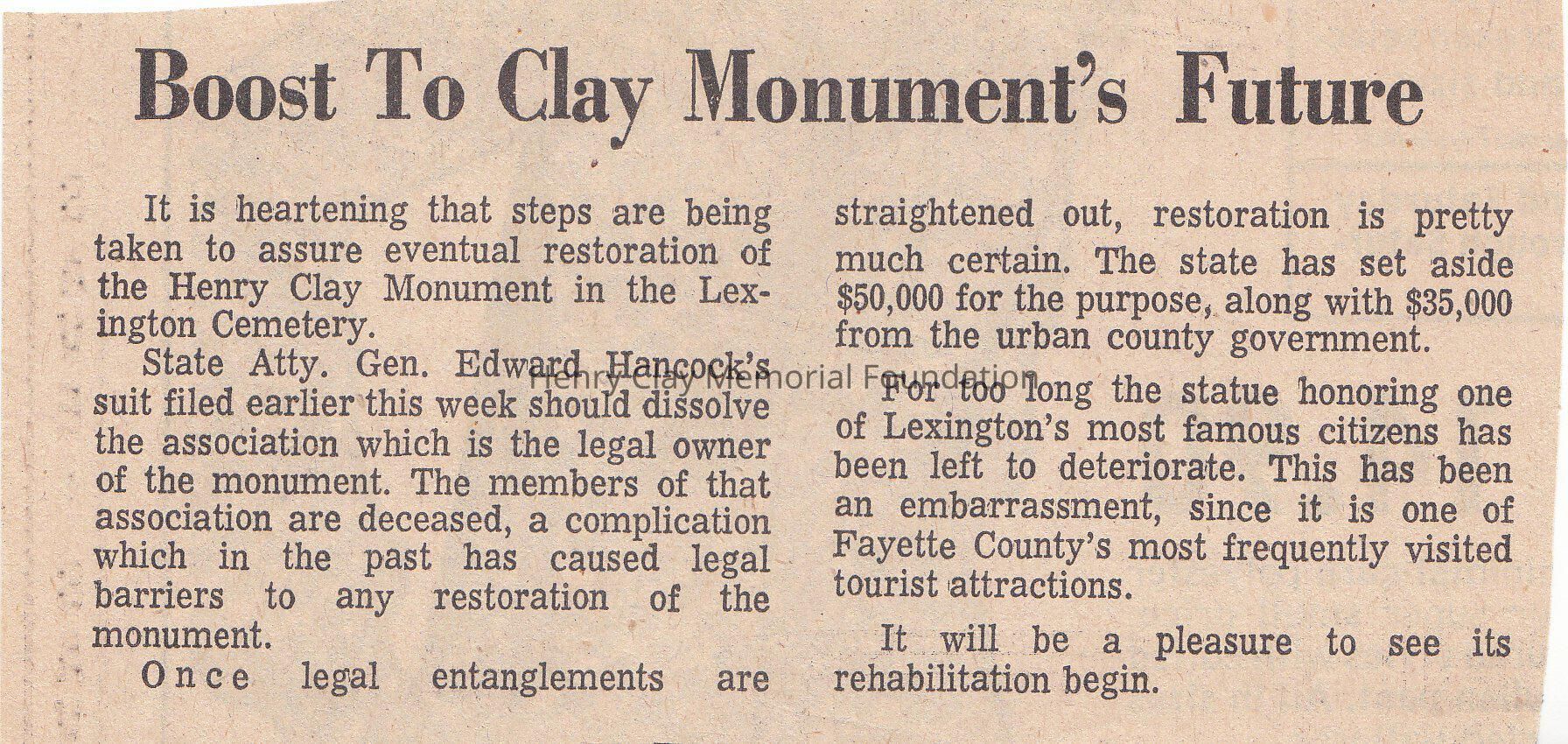 A small article that talks about the need of the Henry Clay monument to be restored, and the amount of $50000 set aside for that purpose, along with $35000 from the county government.