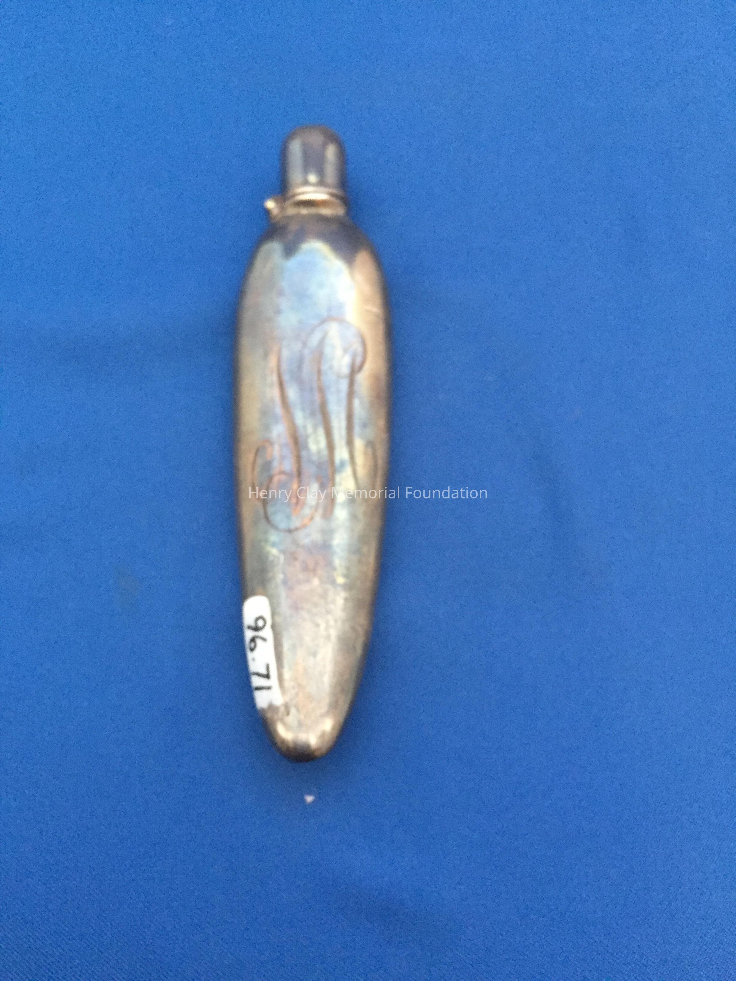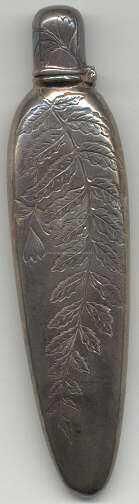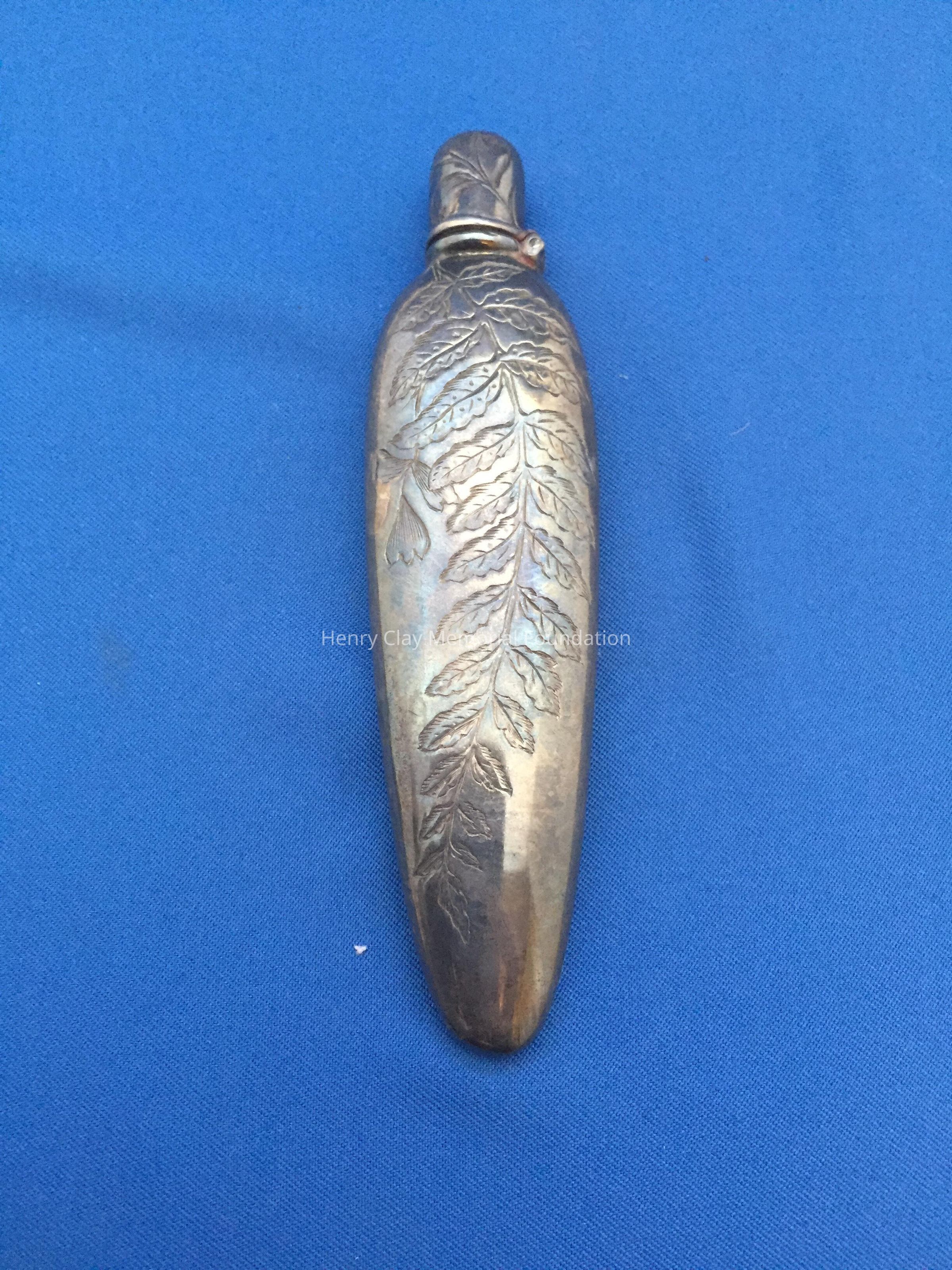 Sterling tear-drop shaped bottle with flip cap. Engraved on one side with fern leaf and opposite side with "NM."
