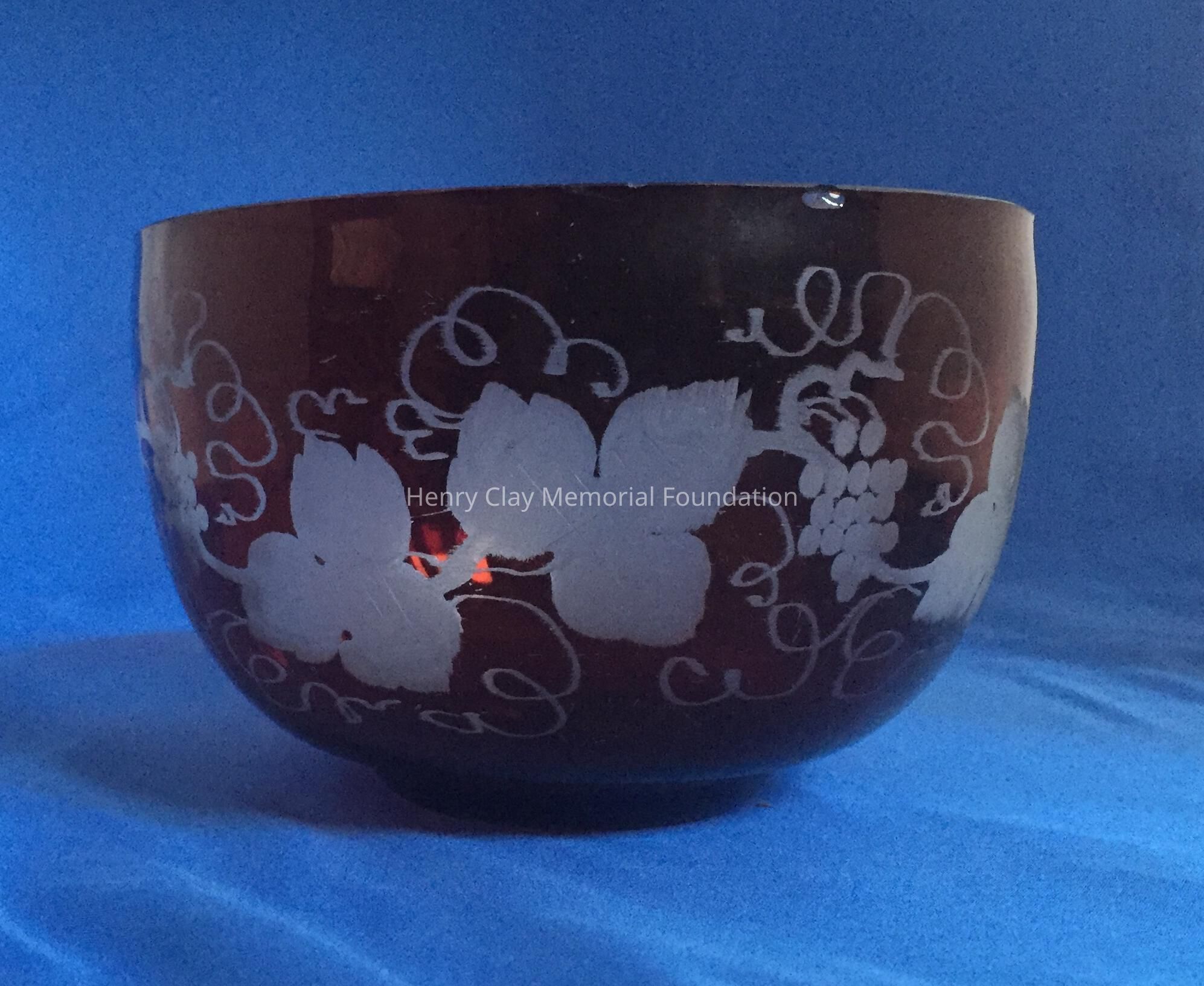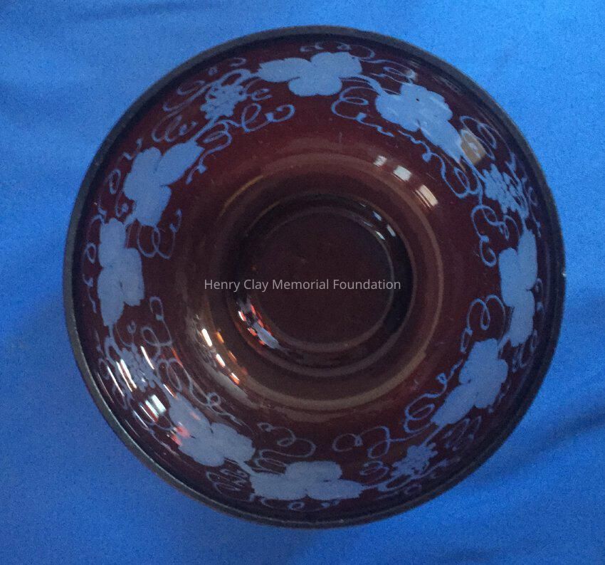 Bohemian glass bowl, red with etched leaves and grapes.