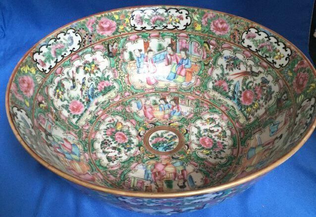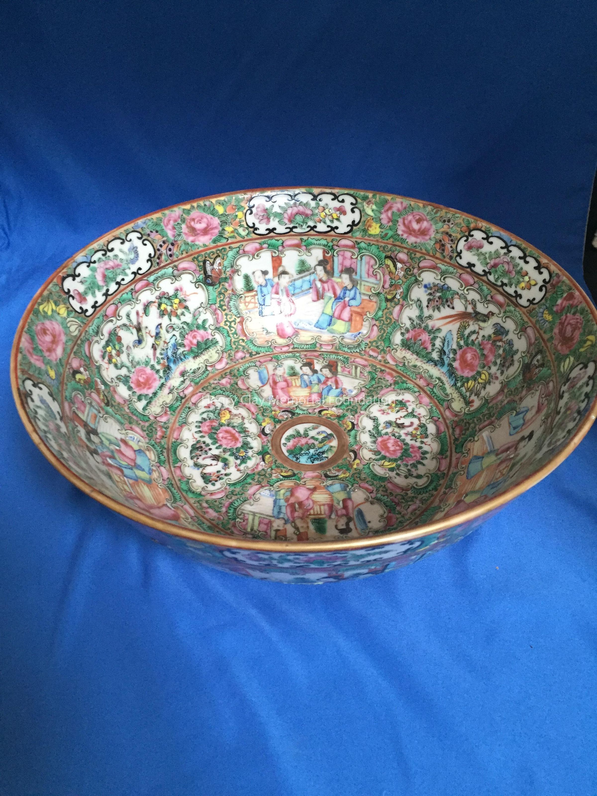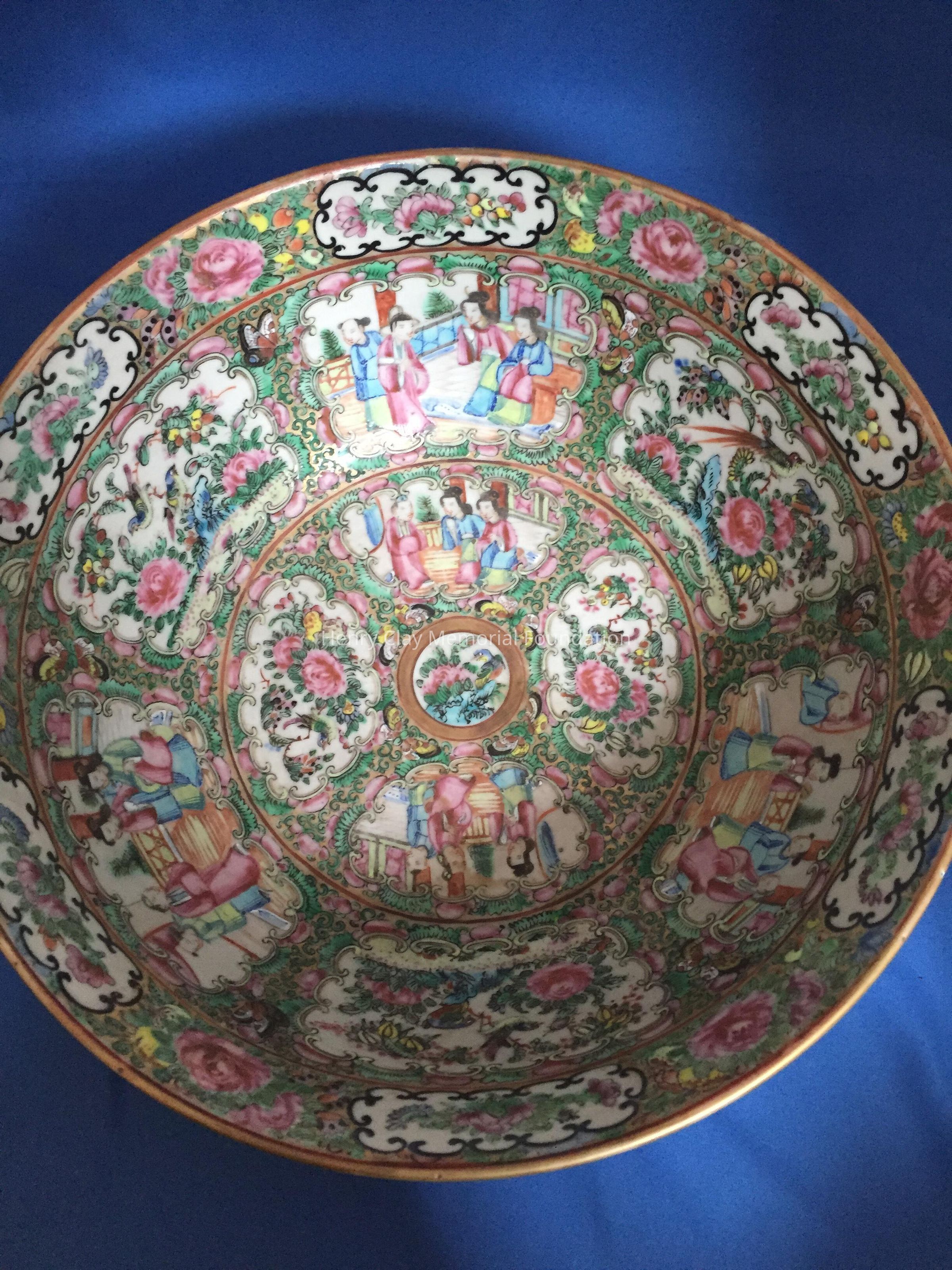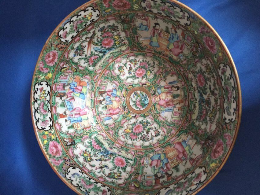 Multi-colored enameled bowl with Asian themes and art. Center medallion in bottom of bowl shows red flowers and blue bird. No china marks.