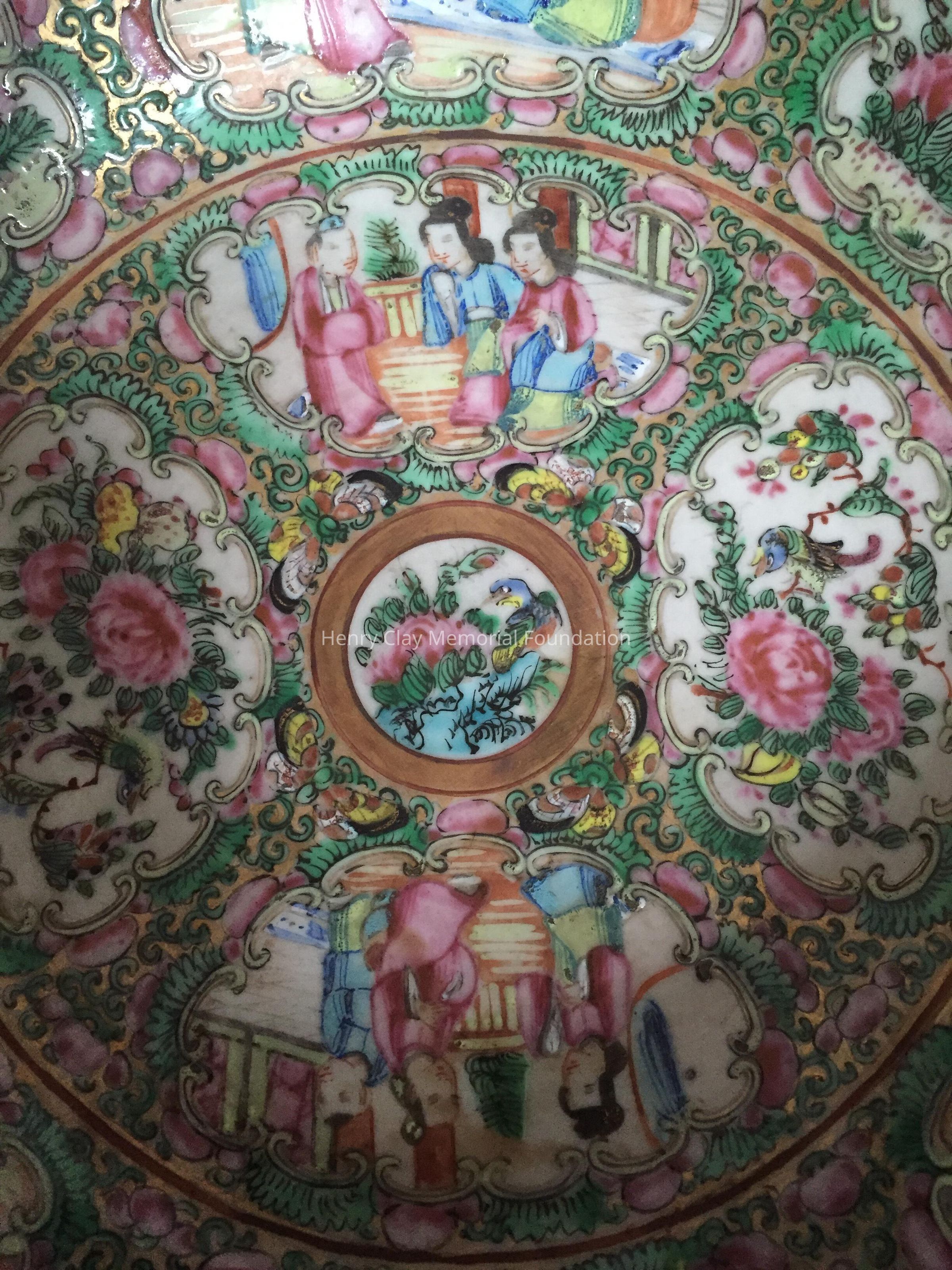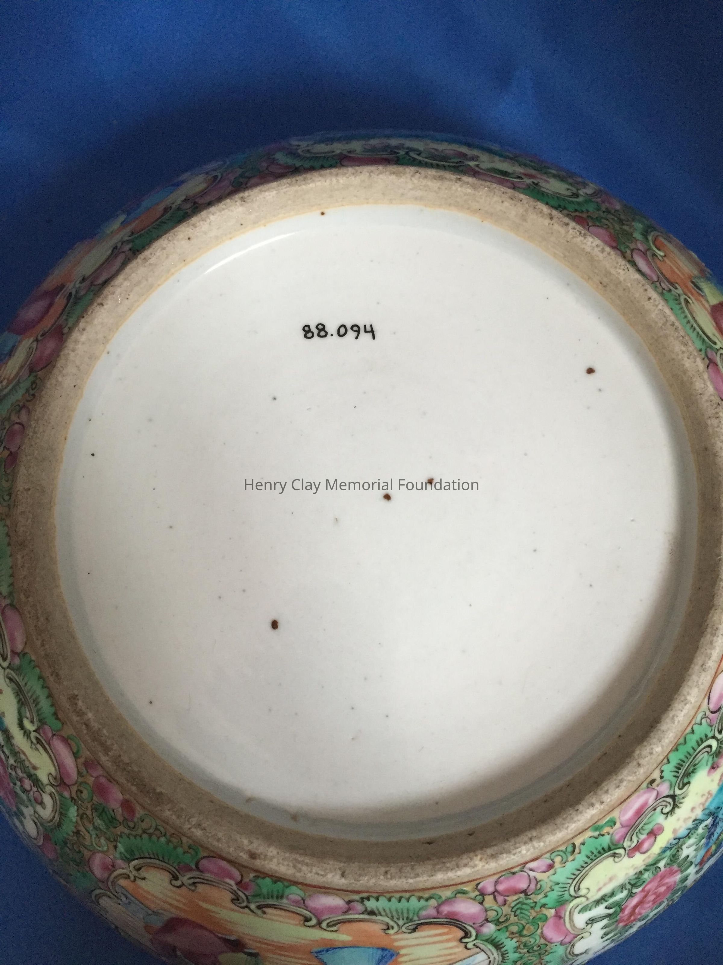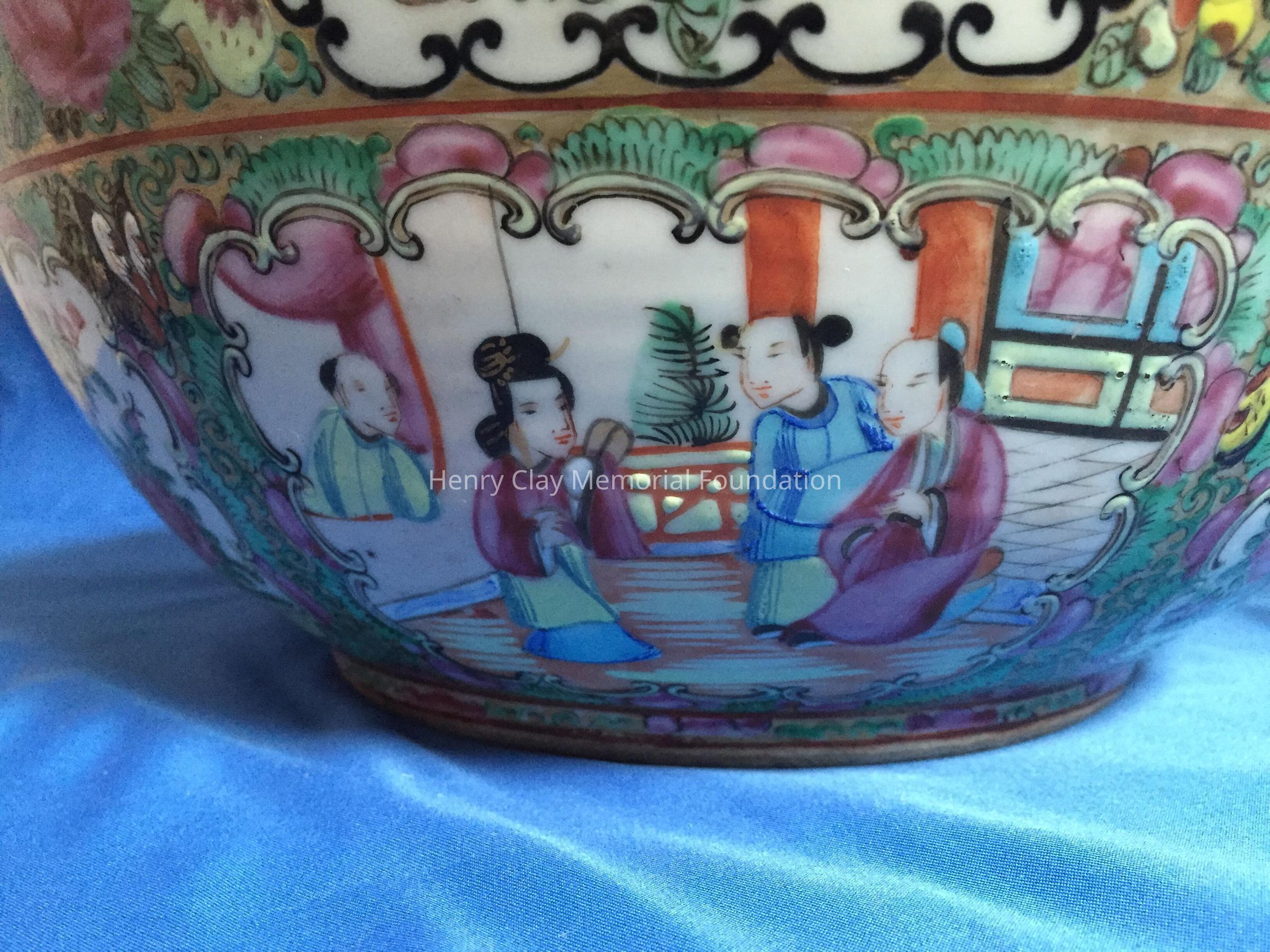 Multi-colored enameled bowl with Asian themes and art. Center medallion in bottom of bowl shows red flowers and blue bird. No china marks.