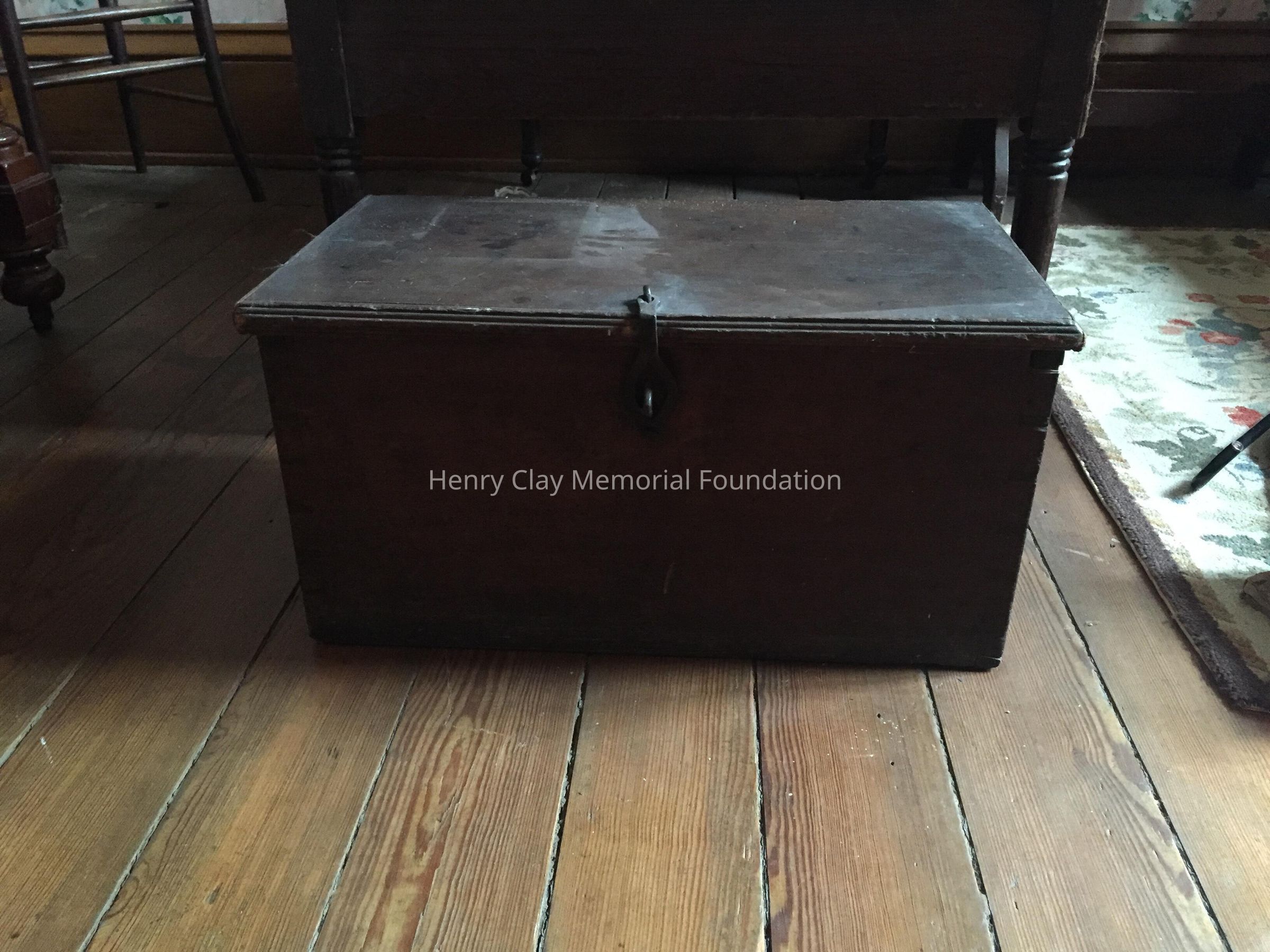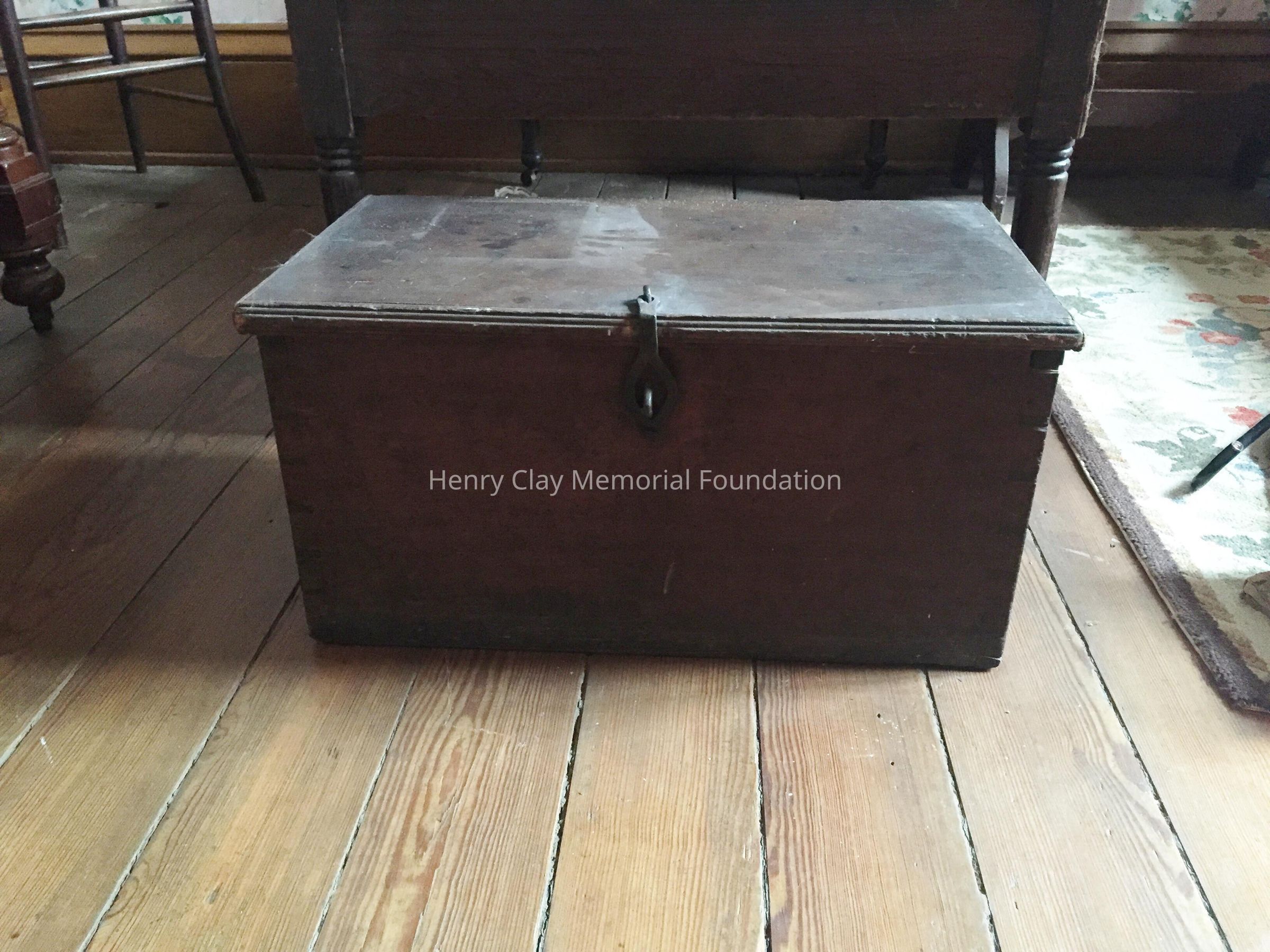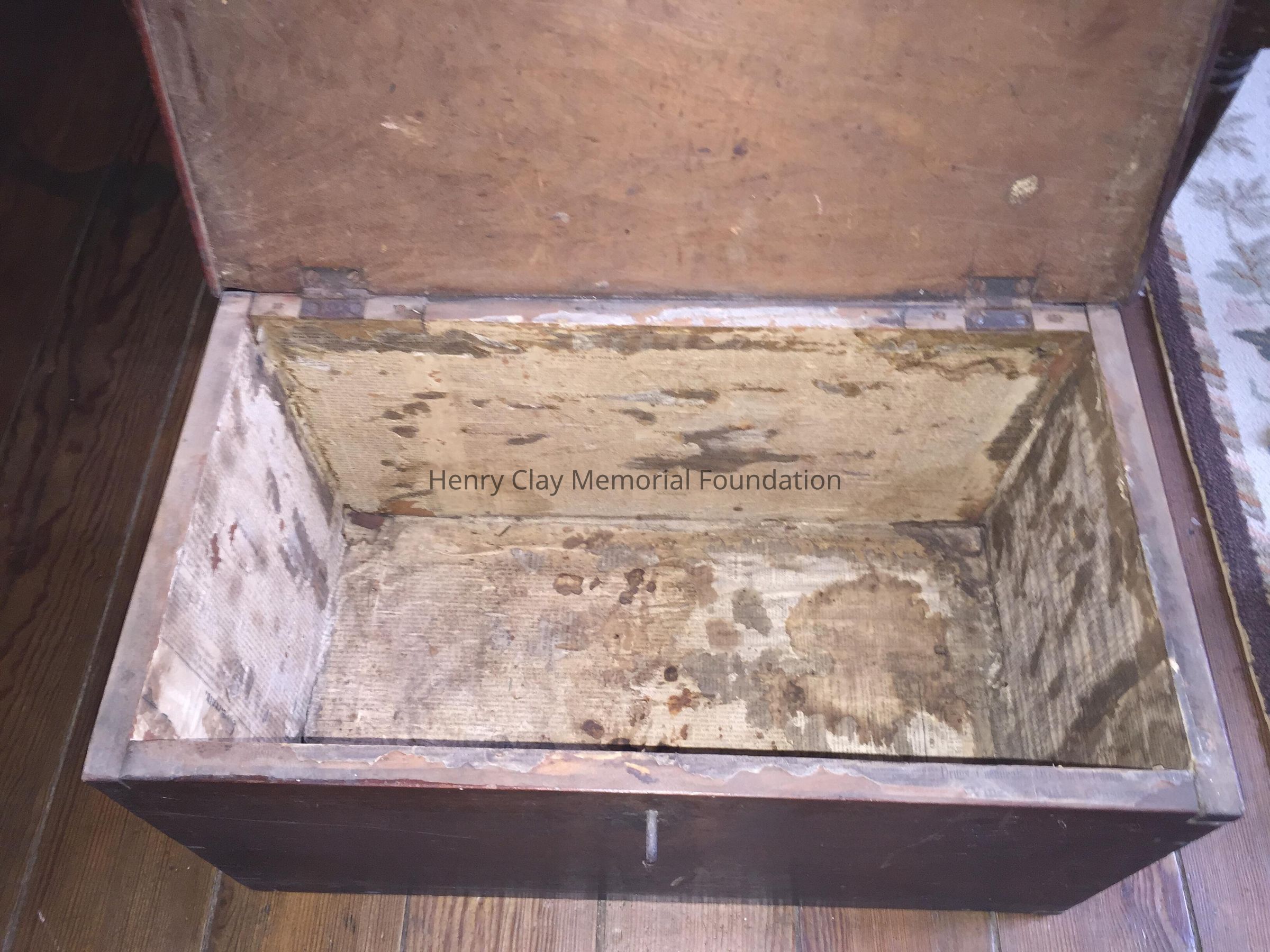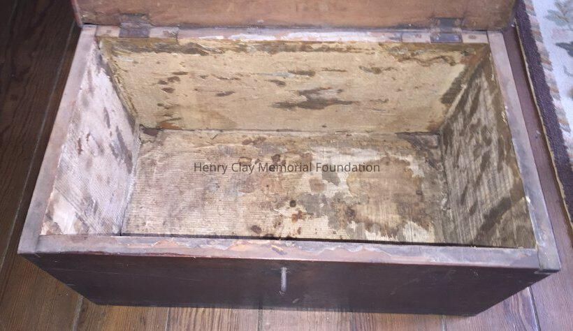 Wooden box, hinged lid, metal clasp, lined with newspaper.