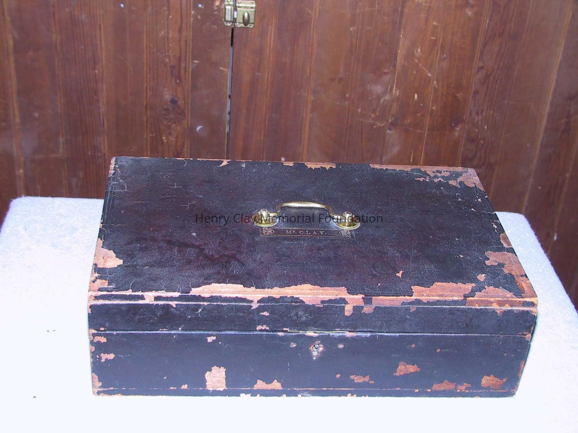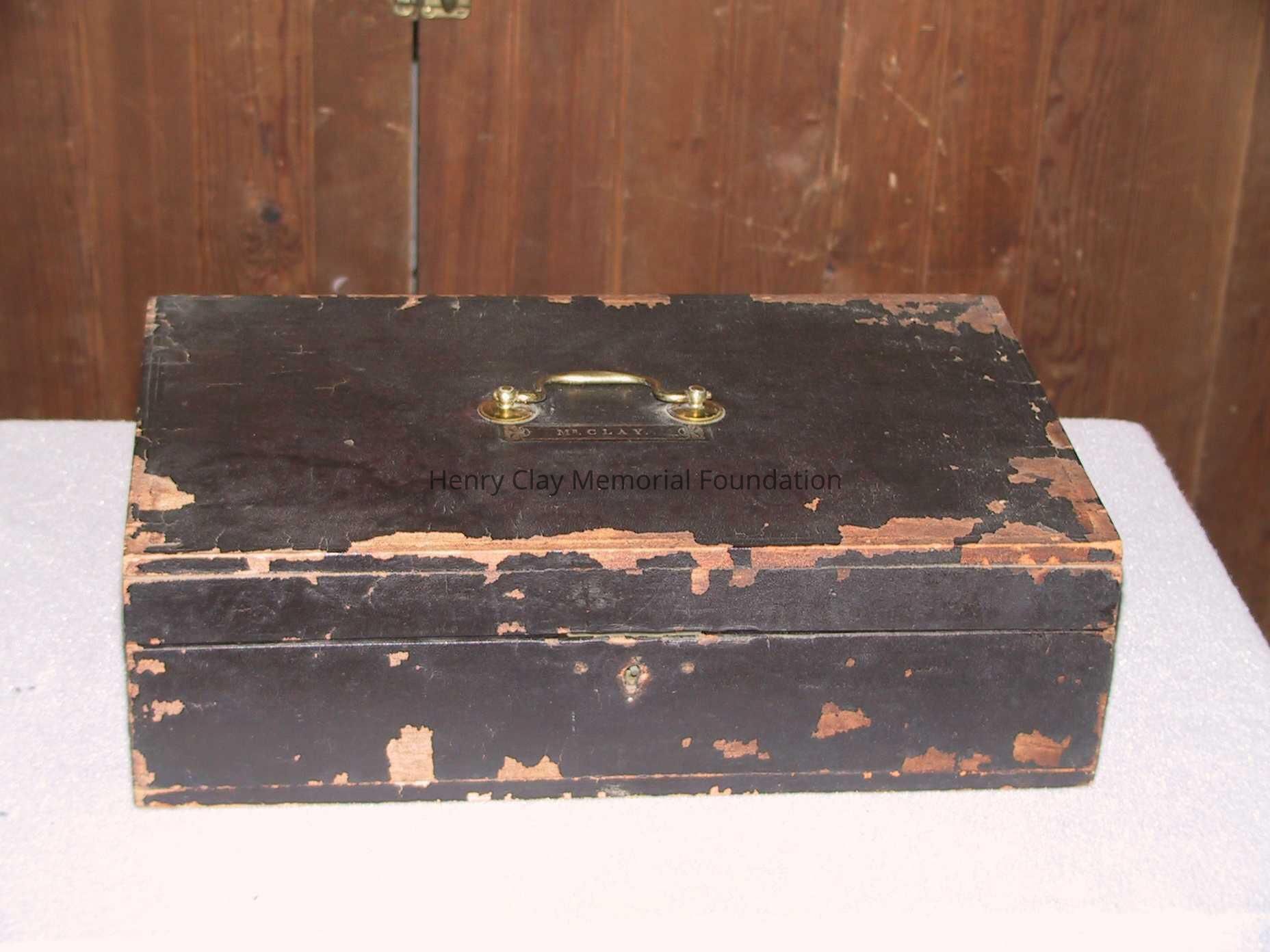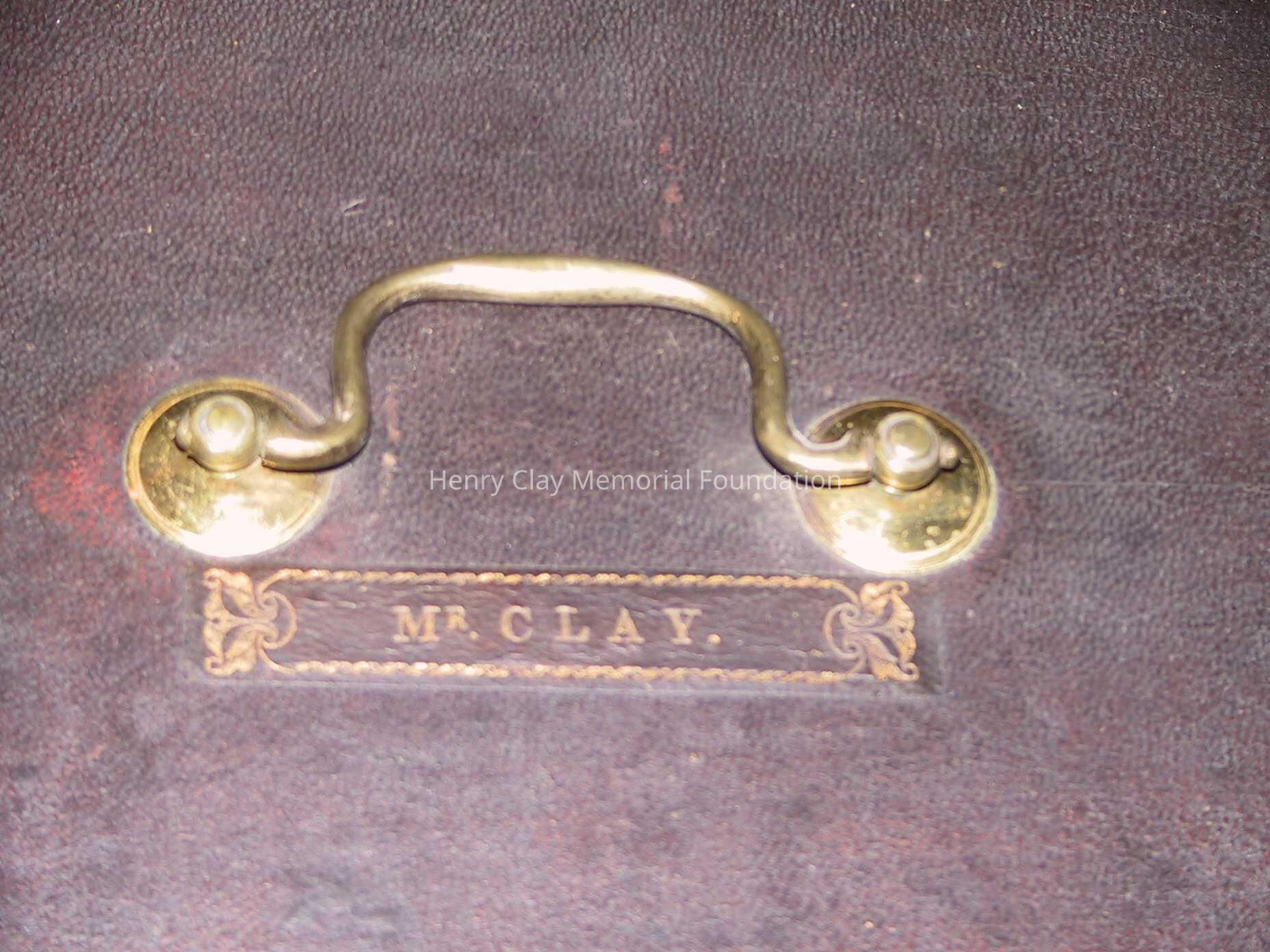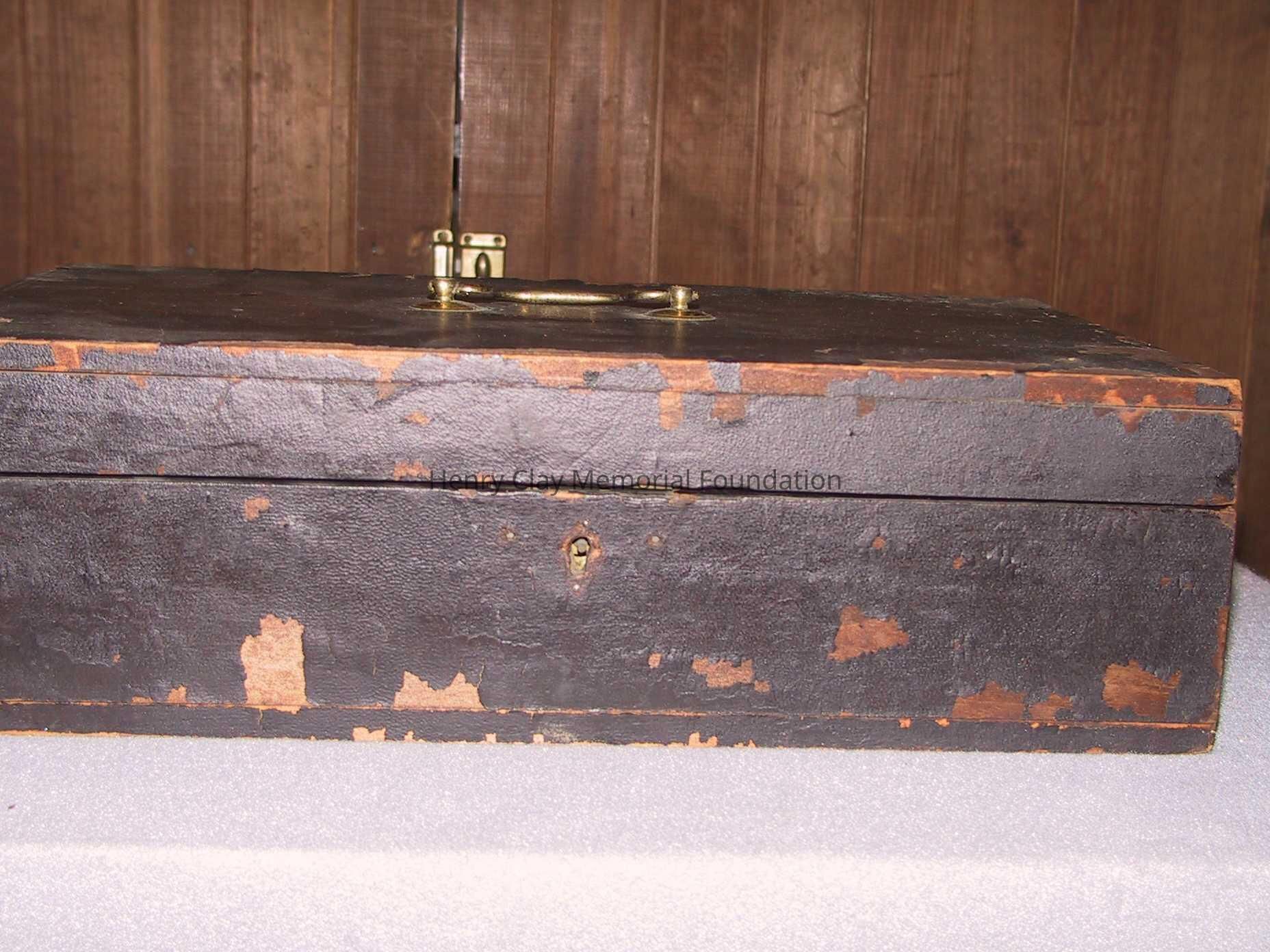 Wooden box covered in black leather with brass baila handle in center of lid and cartouche bearing the imprint "Mr. Clay." Box has lock on front but is missing lockplate. Box is lined with pink striped paper.Dimensions