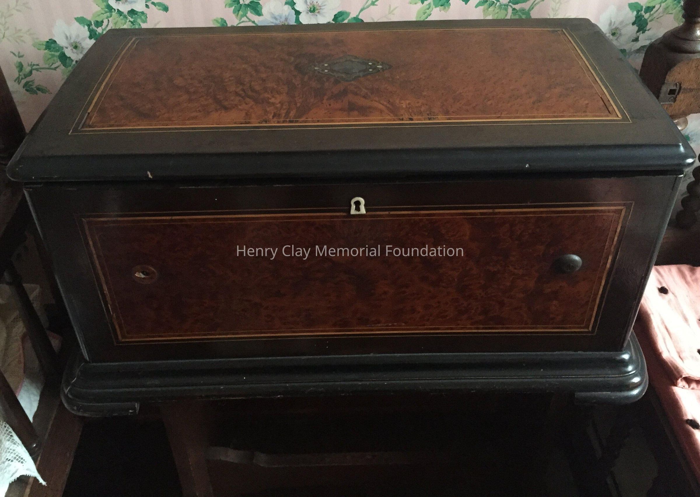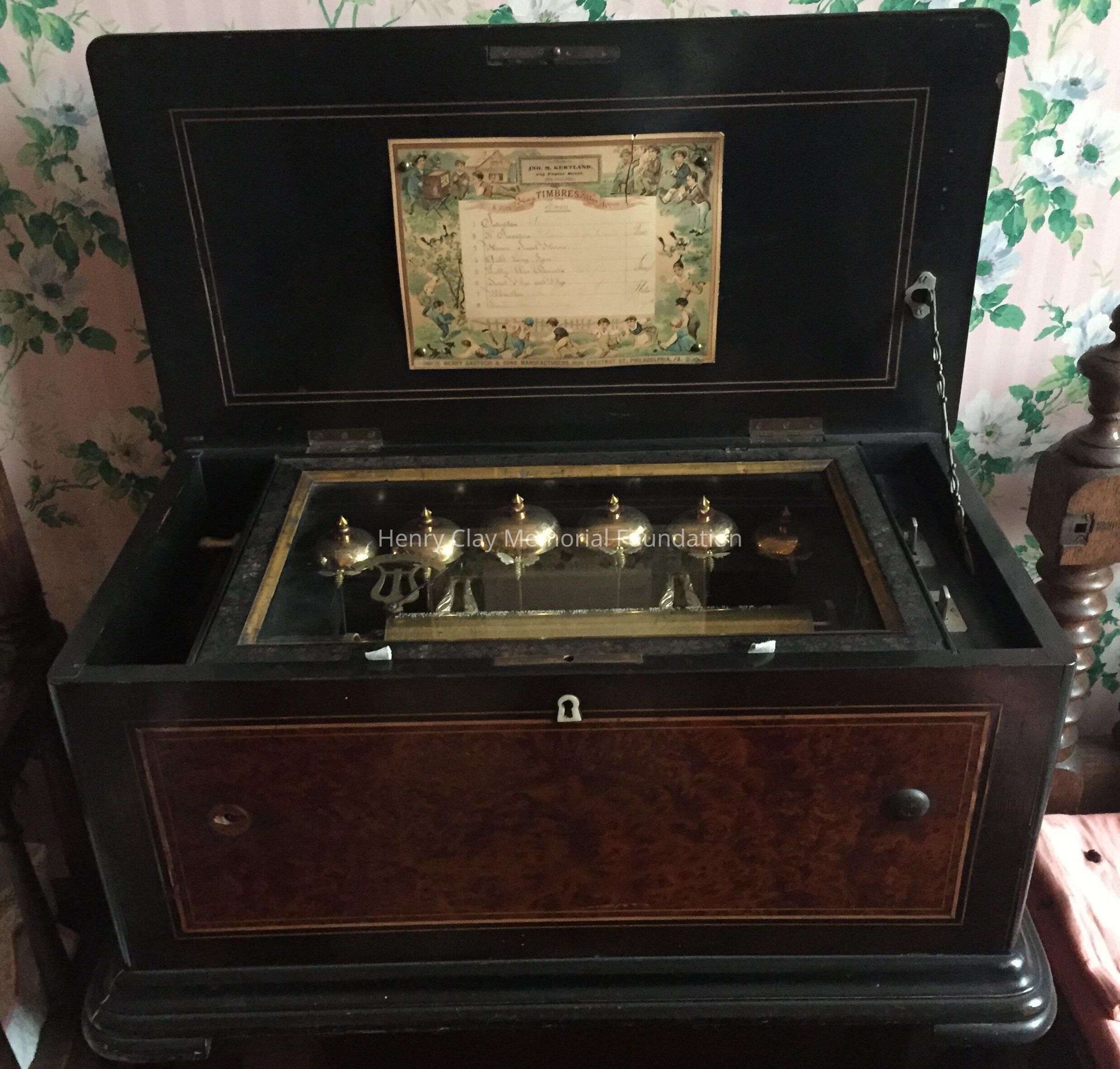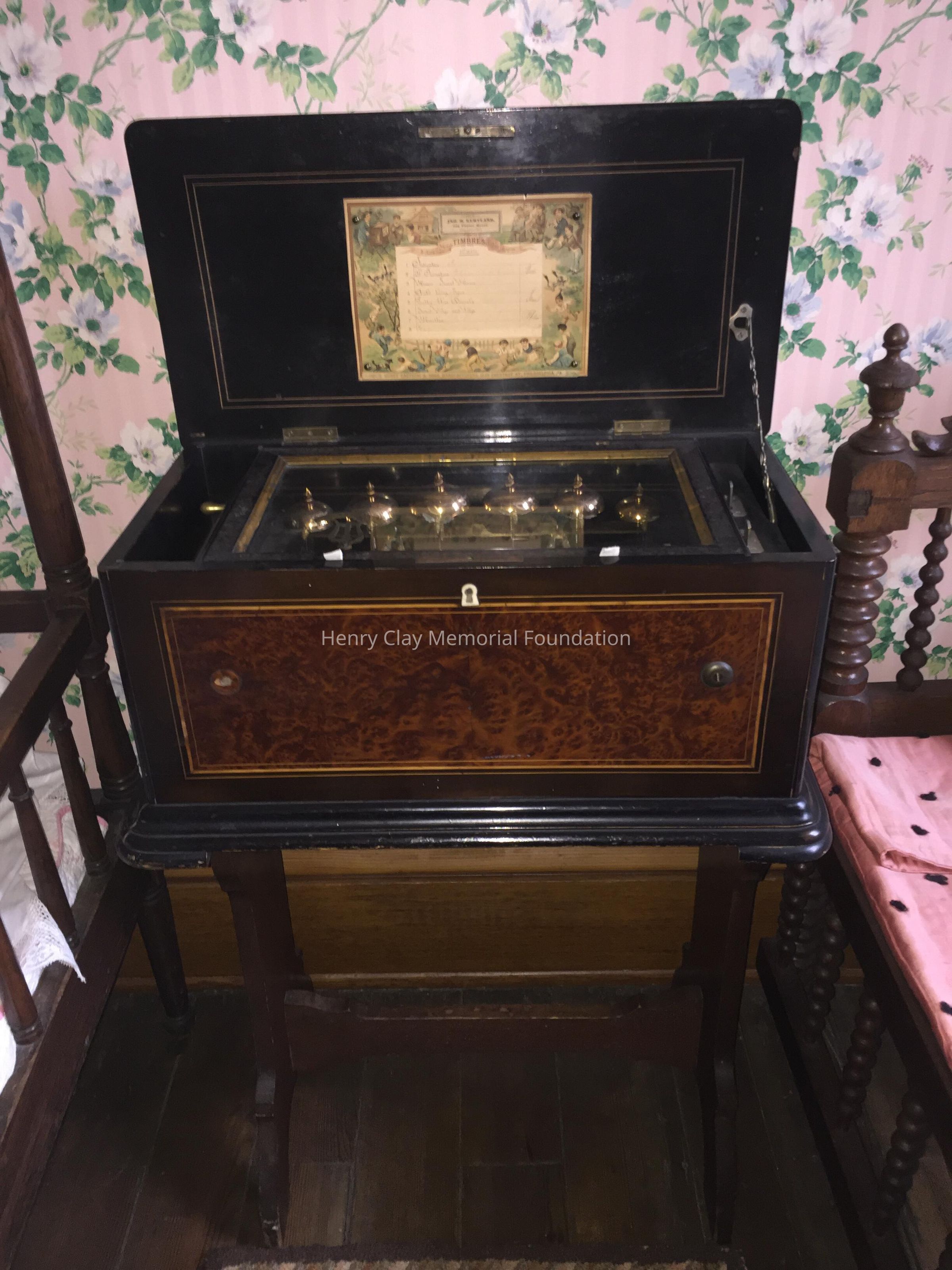 Large wooden music box, black, with veneer centers on each side. Top opens to reveal interior works viewed through a glass door. Mechanism has bell strikers shaped like bees. Six bells. An original card on inside of lid lists 8 tunes that can be played, including "Home Sweet Home," "Auld Lang Syne," & "Pretty Blue Danube."Dimensions