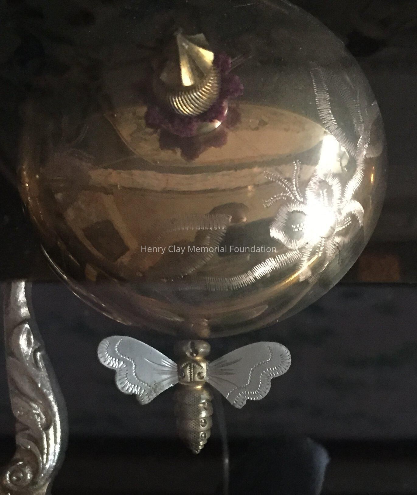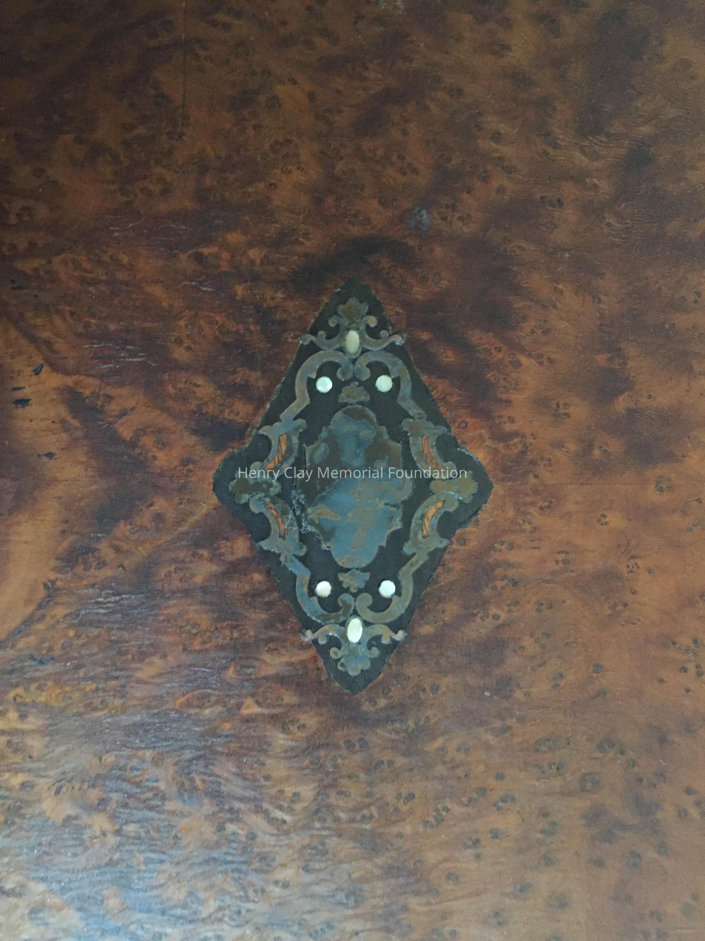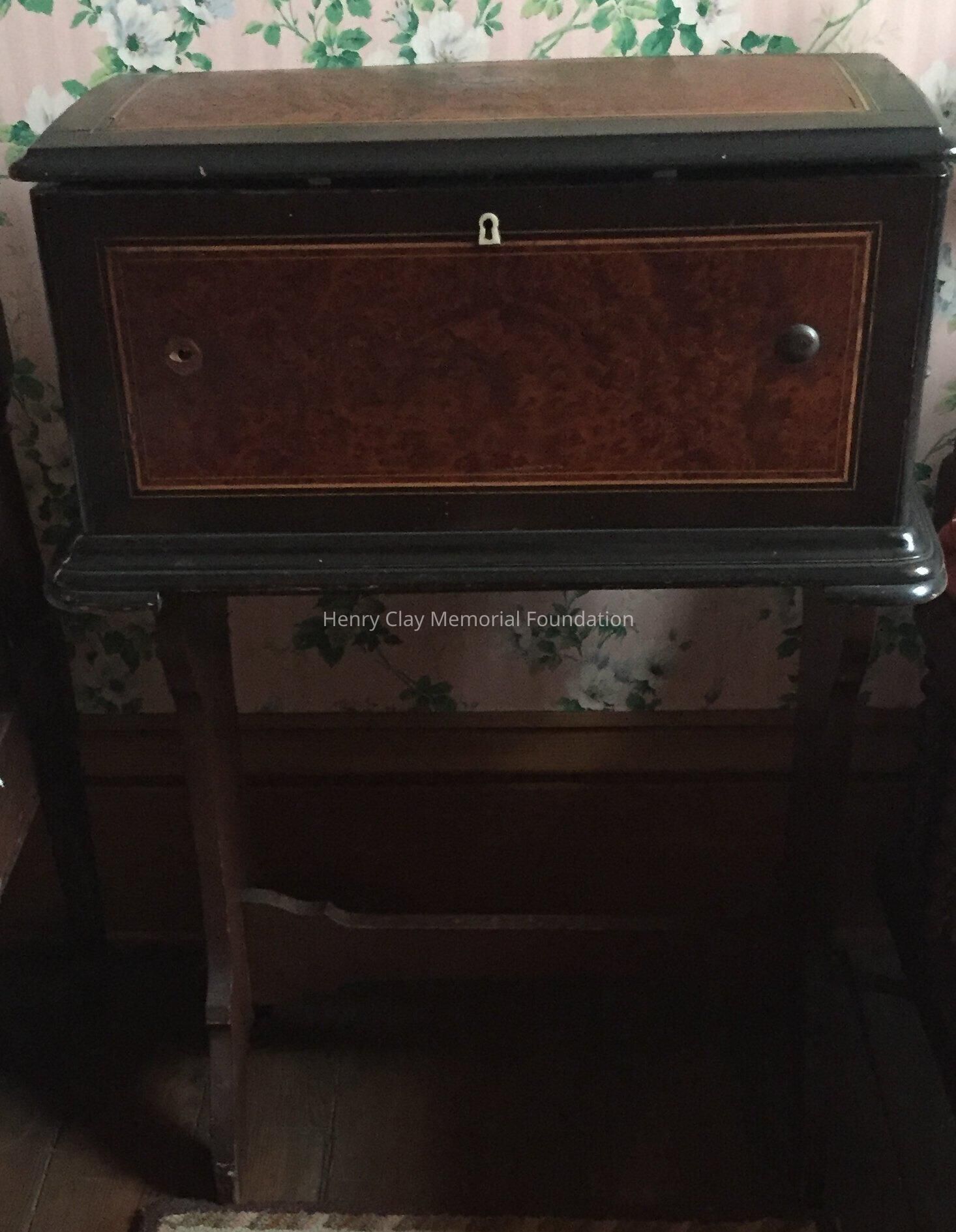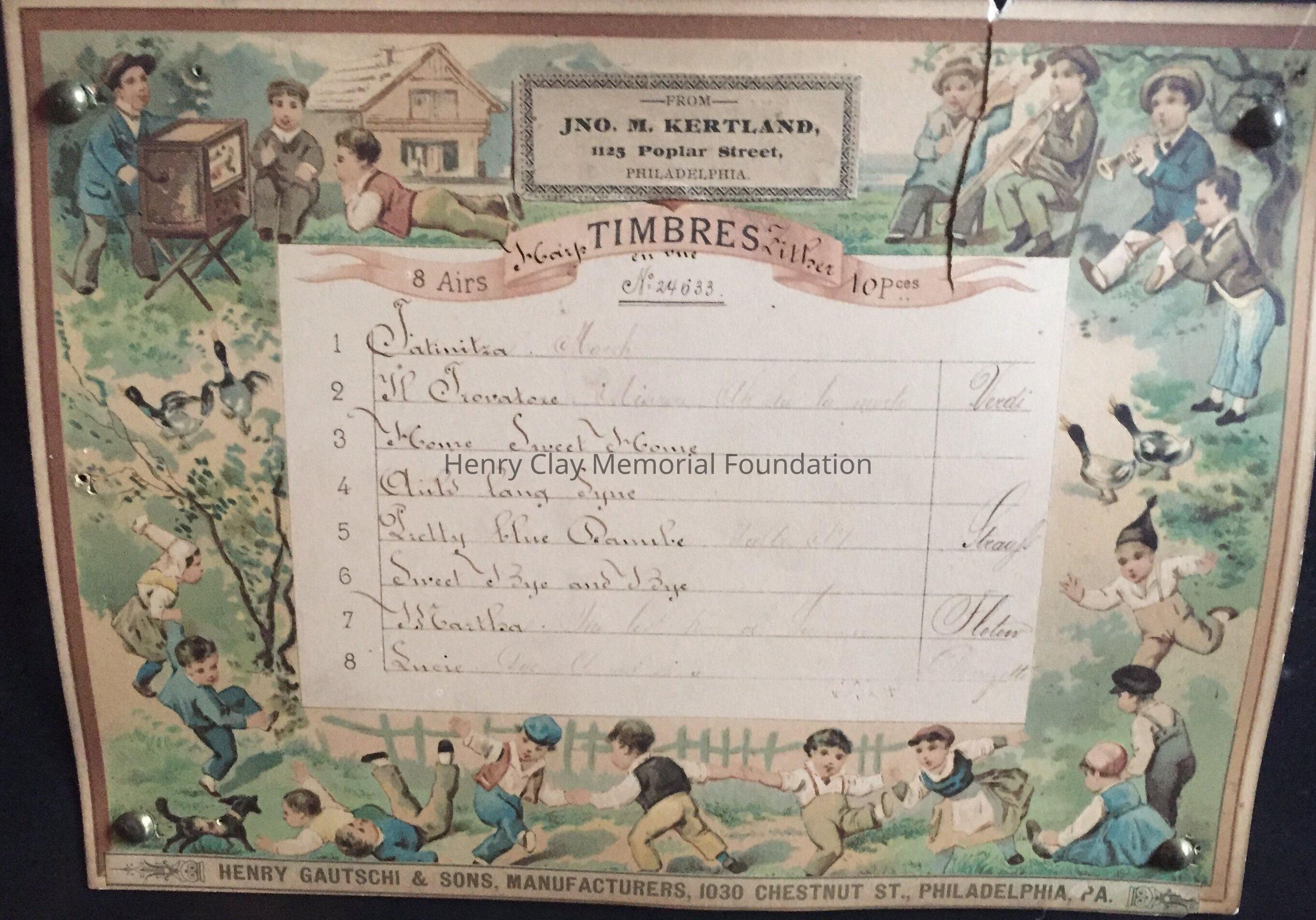 Large wooden music box, black, with veneer centers on each side. Top opens to reveal interior works viewed through a glass door. Mechanism has bell strikers shaped like bees. Six bells. An original card on inside of lid lists 8 tunes that can be played, including "Home Sweet Home," "Auld Lang Syne," & "Pretty Blue Danube."Dimensions
