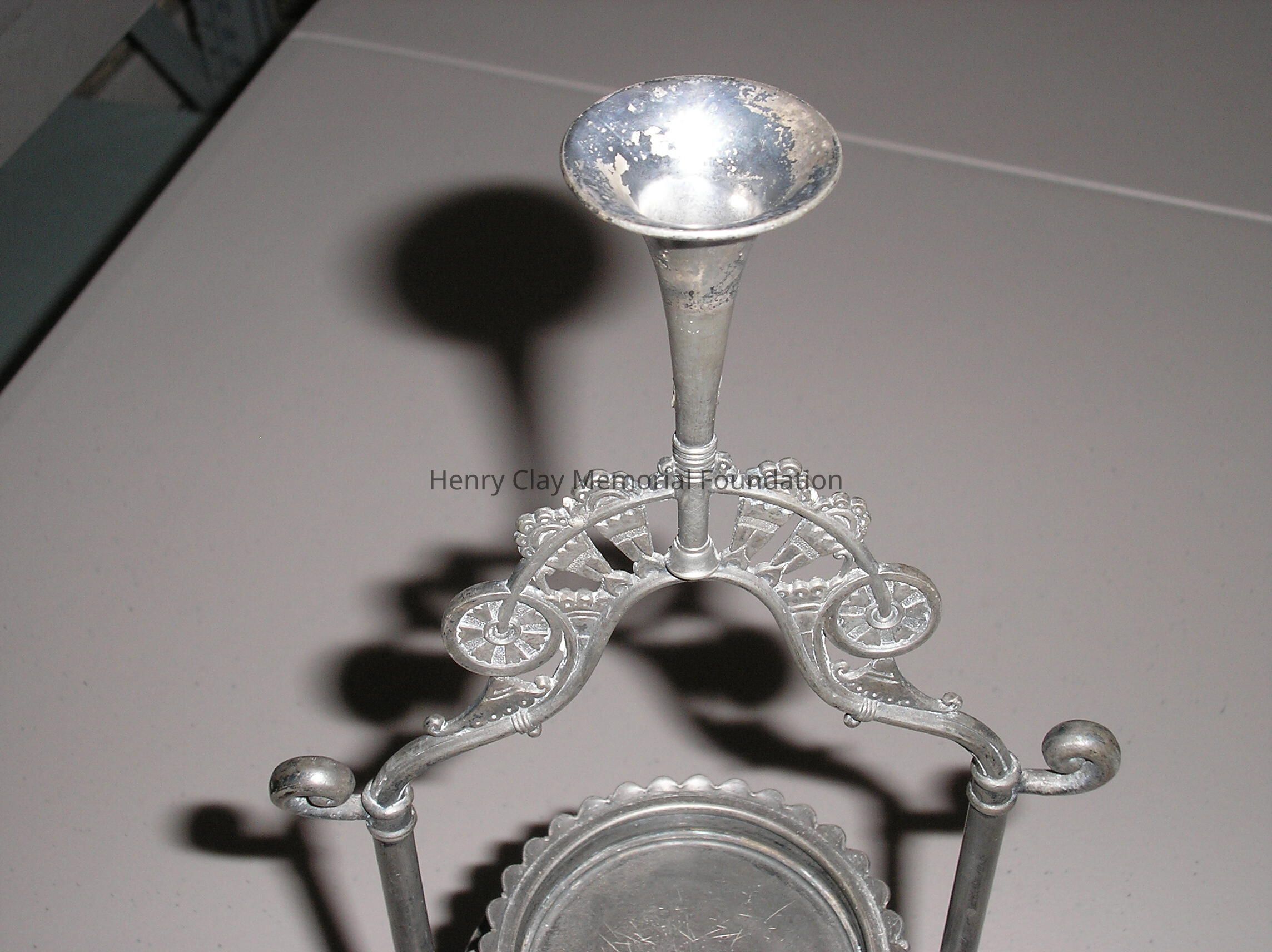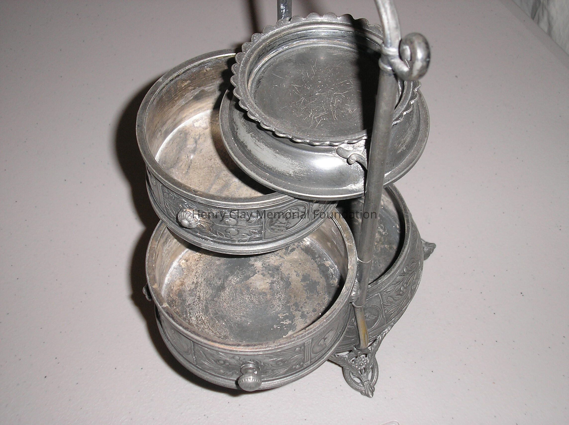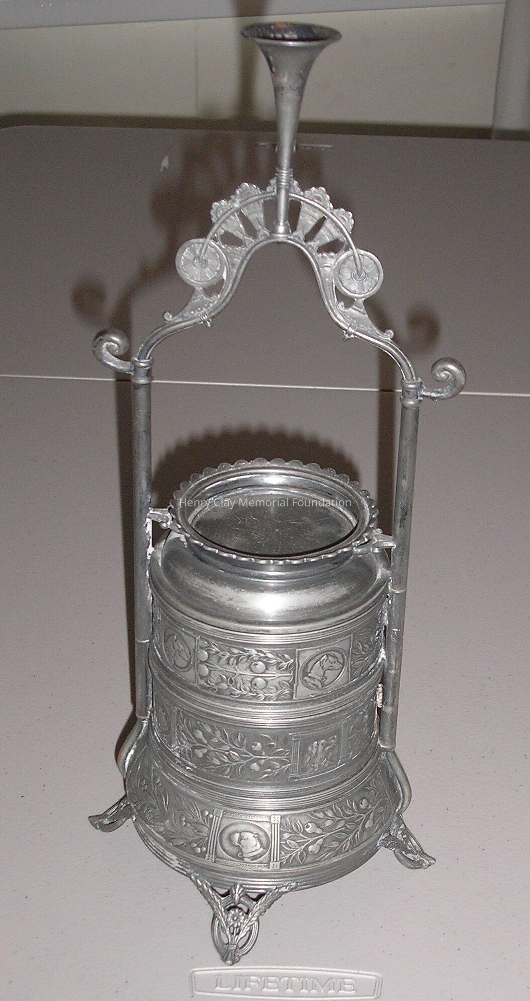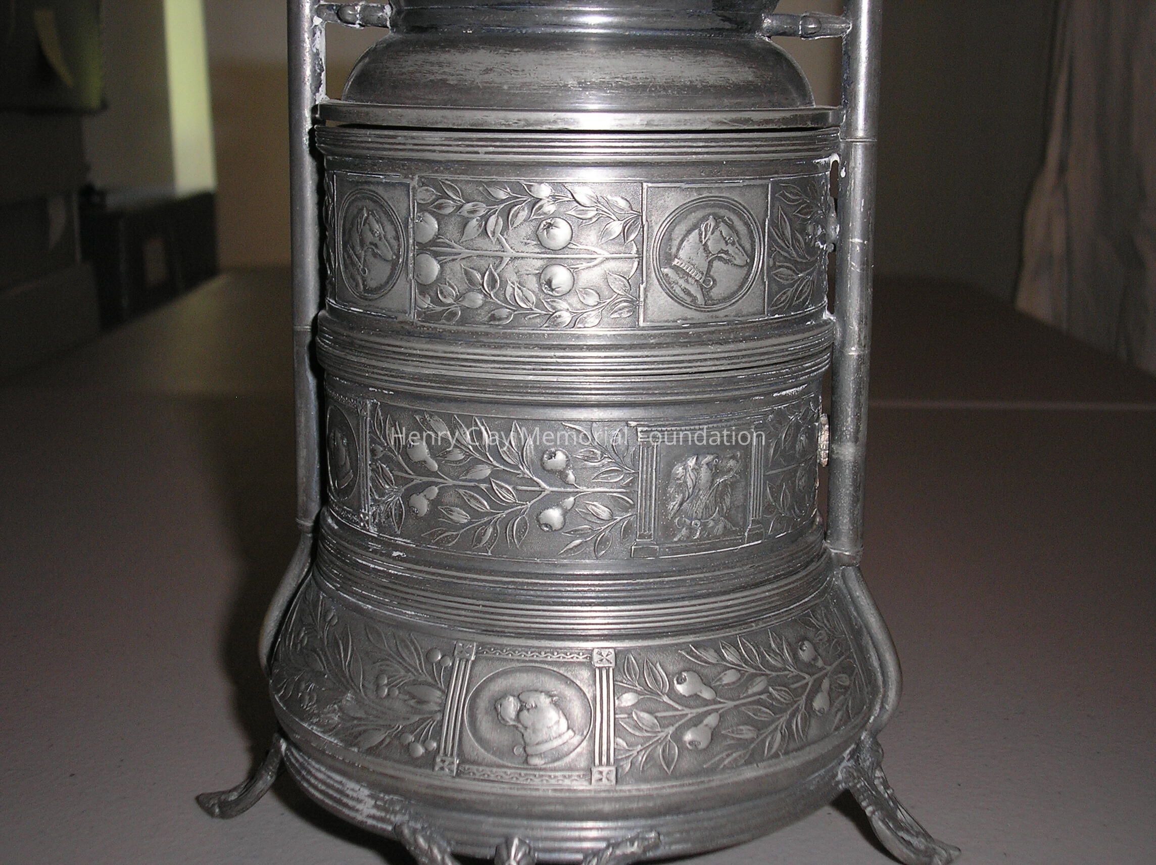 A sterling silver tobbaco box on a stand. The Box is cylindrical with two posts that form an arch over the top. It has two drawers with pulls that rotate out from the center. On top of the drawers is a small tray with lip. The piece is decorated with pictures of dogs including greyhounds, boxers, and setters. In between the dogs are floral decorations. The piece has four feet made up of crossed feathers in loops. At the top of the arch is a trumpet. Piece is stamped: "Reed and Barton Pat Mar __ 188 __."