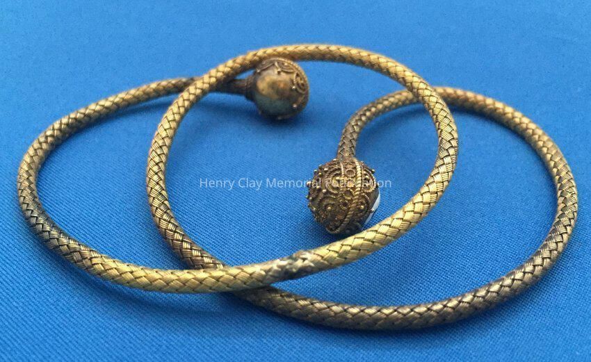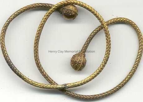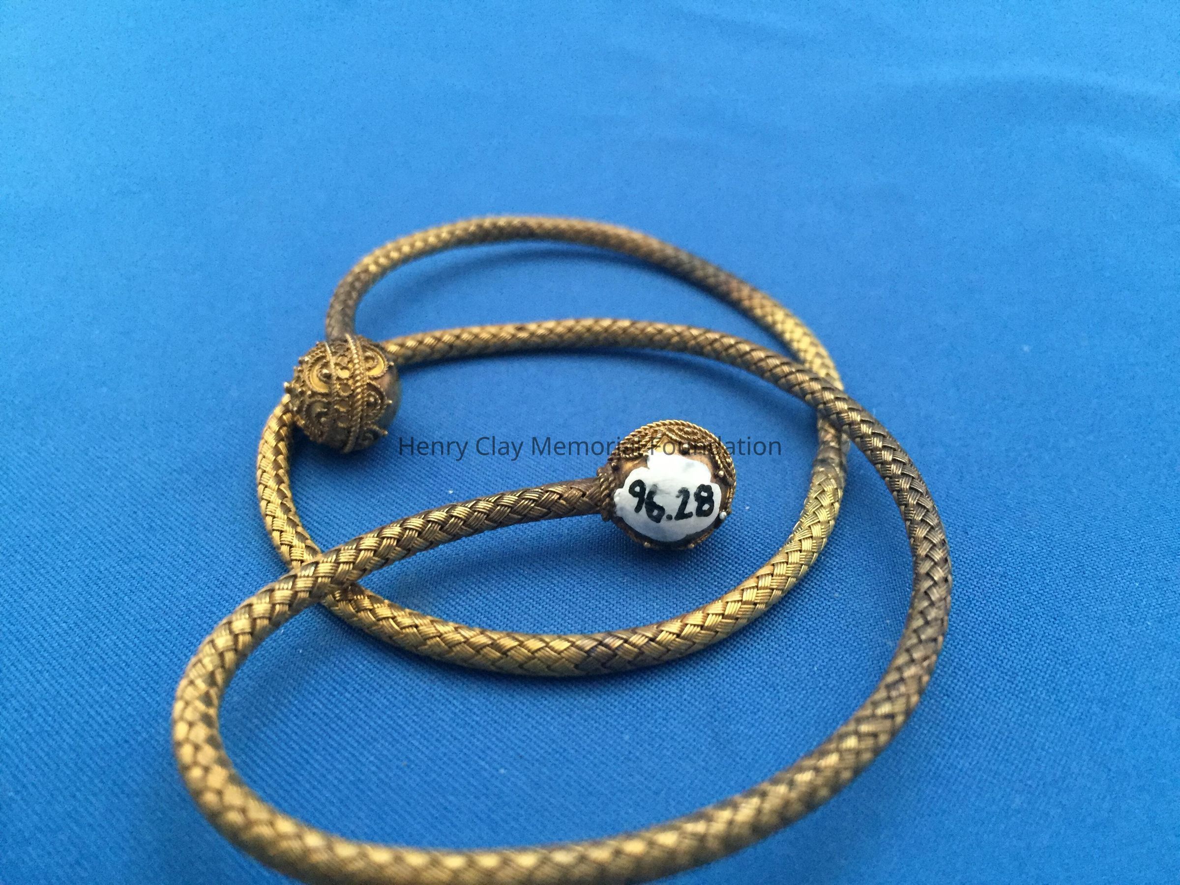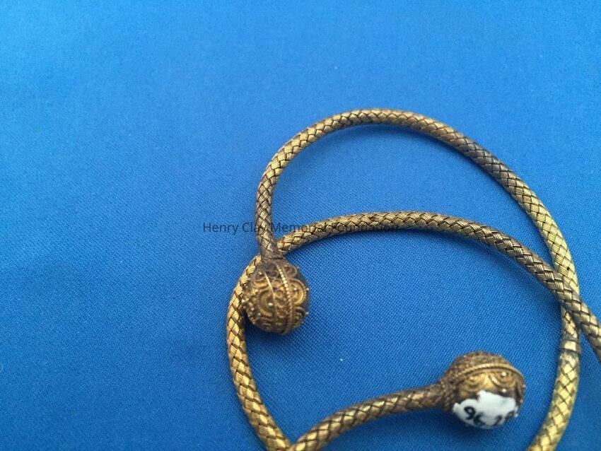 Gold woven bracelet with decorative gold balls on each end. Bracelet is of 'Moorish' design, popular in late 19th century. Bracelet is in curled position.