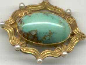 Oval marbled mint green stone set in a ring of gold. Ring has eight points on it, each set with a seed pearl, though one is missing.
