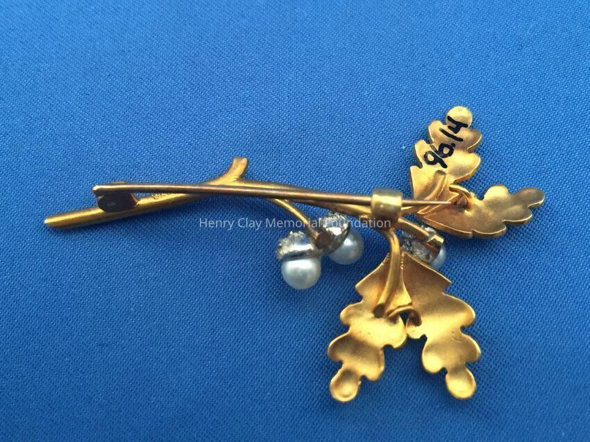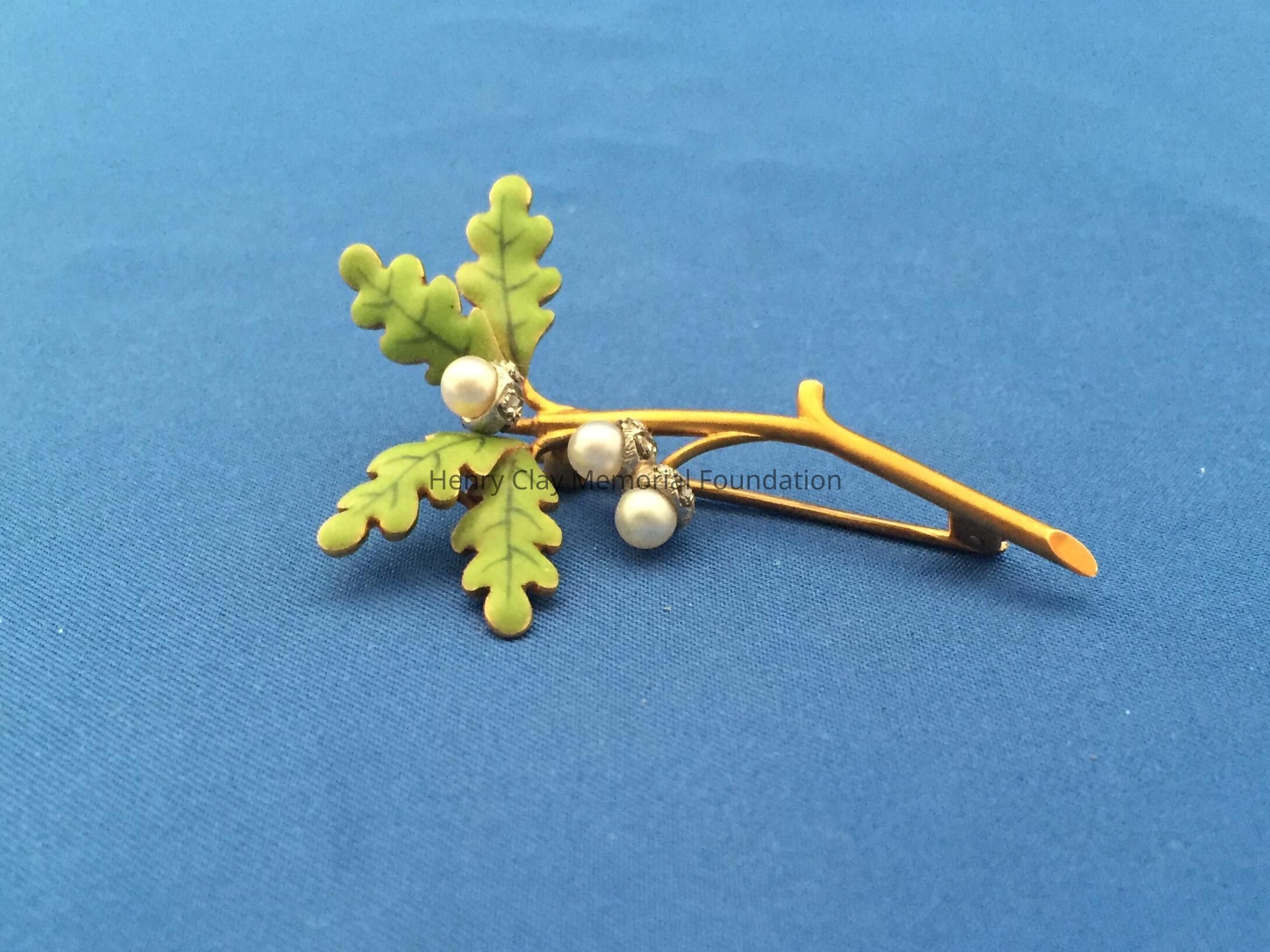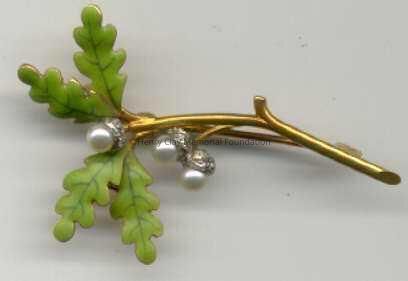 Ladies' brooch fashioned in 18k gold depicting oak tree branch, stamped on back of stem: "I.B. Starr." Set with three round pearls set on diamond pave designed as acorns. There are 12 rose-cut diamonds, total weight is approximately 0.15 carats; leaves are painted or enamelled green.Pin clasp on back.Dimensions