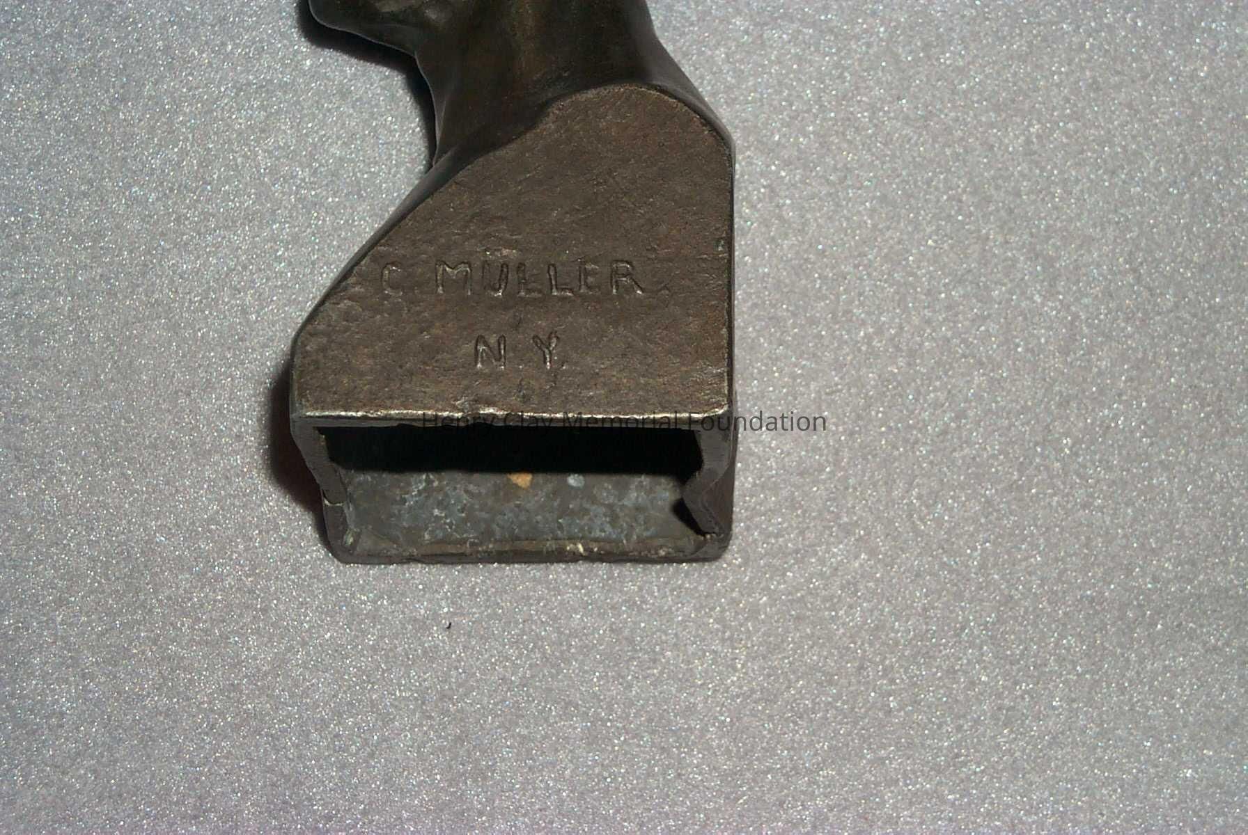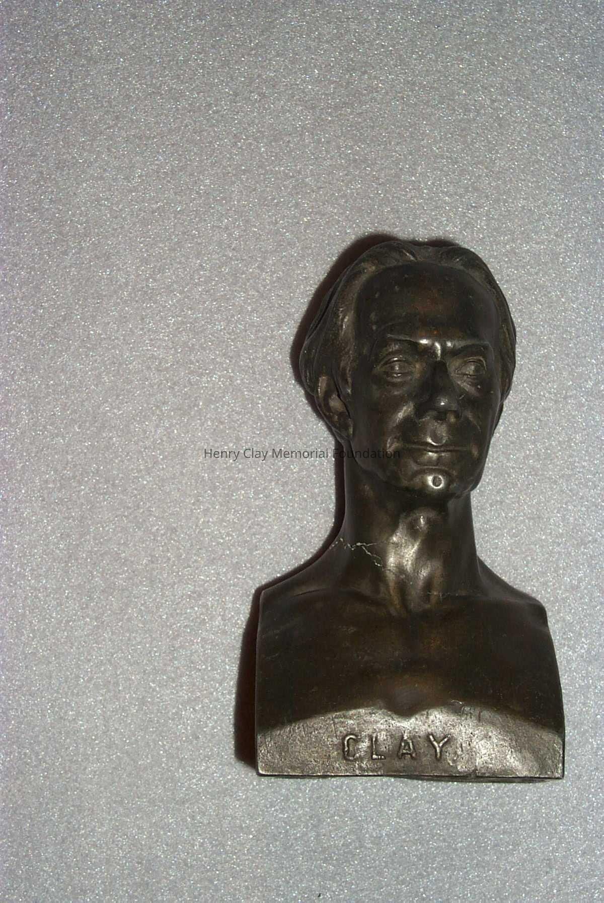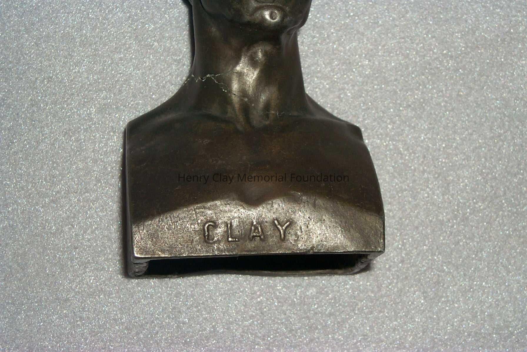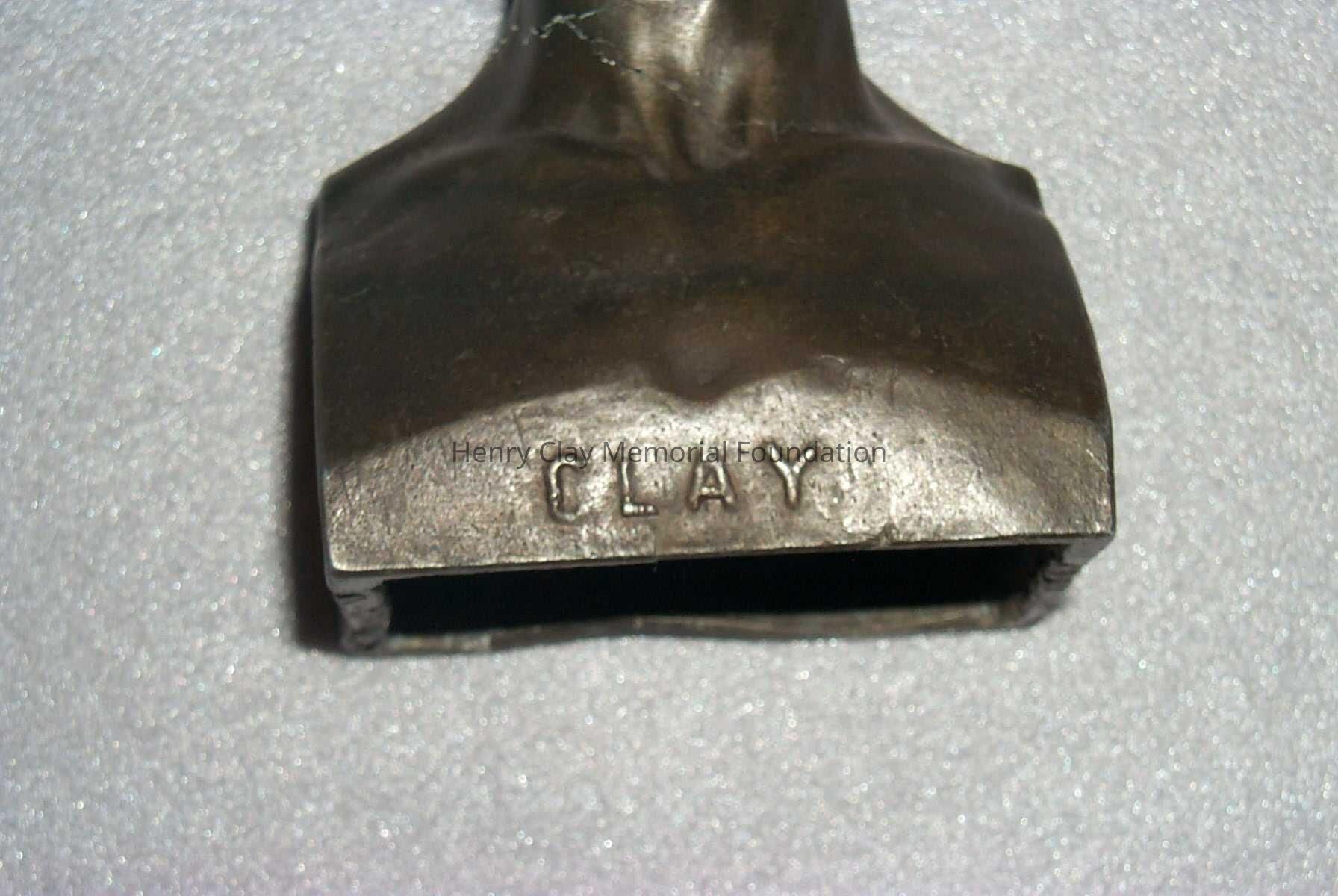 Metal head and shoulders bust of Henry Clay. Has word "Clay" embossed on front at bottom and "C. Muller NY" embossed on right side (facing bust).Dimensions