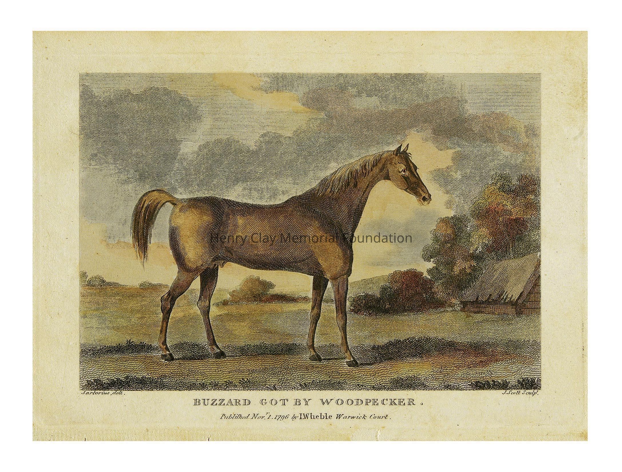 An engraving of the Thoroughbred stallion Buzzard Engraving has been colored and framed in a modern gilt frame.