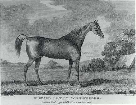 Black and white photographic reproduction of an engraving of a horse, identified at the bottom as "BUZZARD GOT BY WOODPECKER." In fine print just below image to the left, "Sartorius, delt." and to the right, "J. Scott, Sculpt." Below the horses' name, "Published Novr. 1, 1796 by I. Wheble Warwick Court."