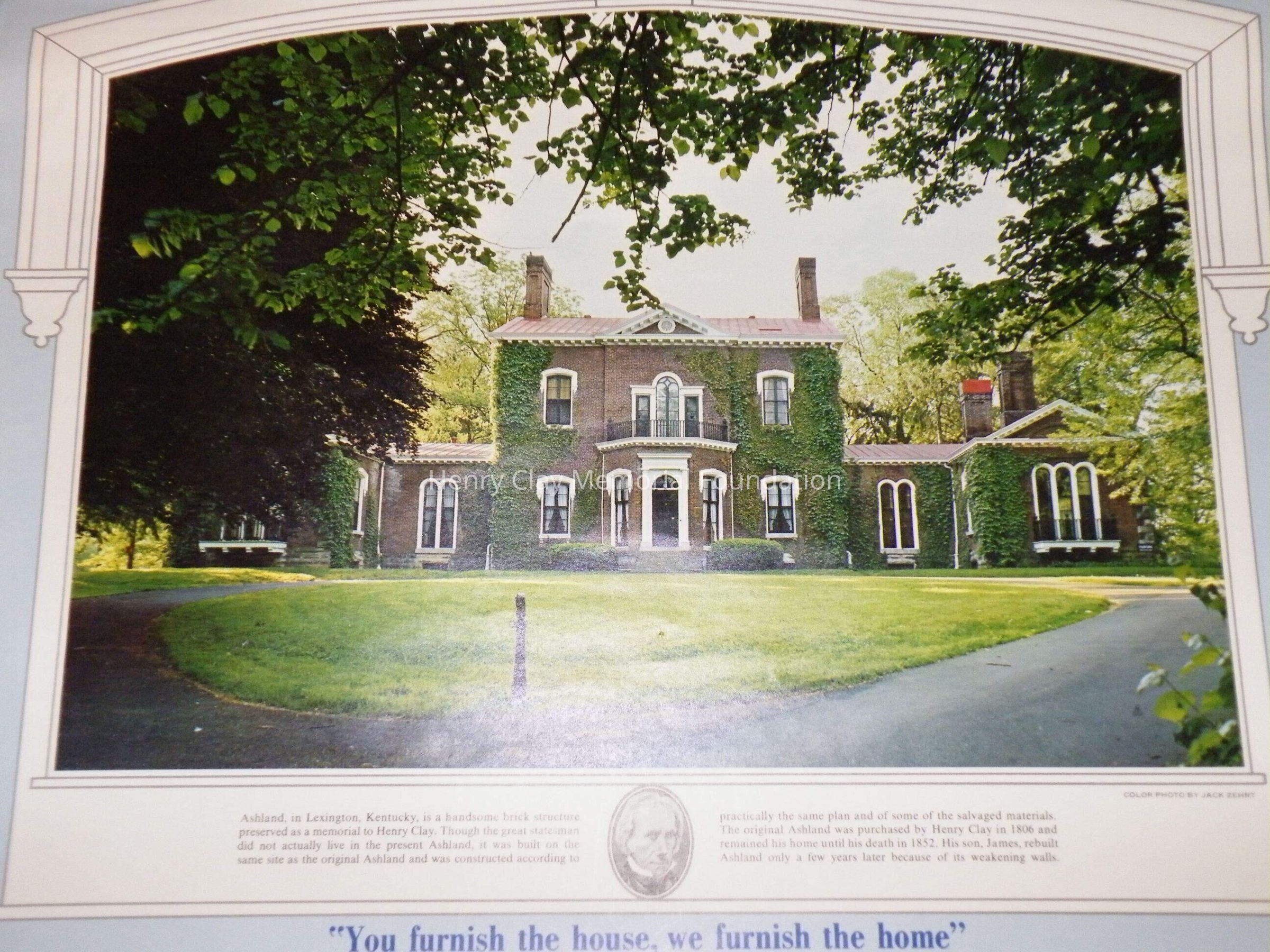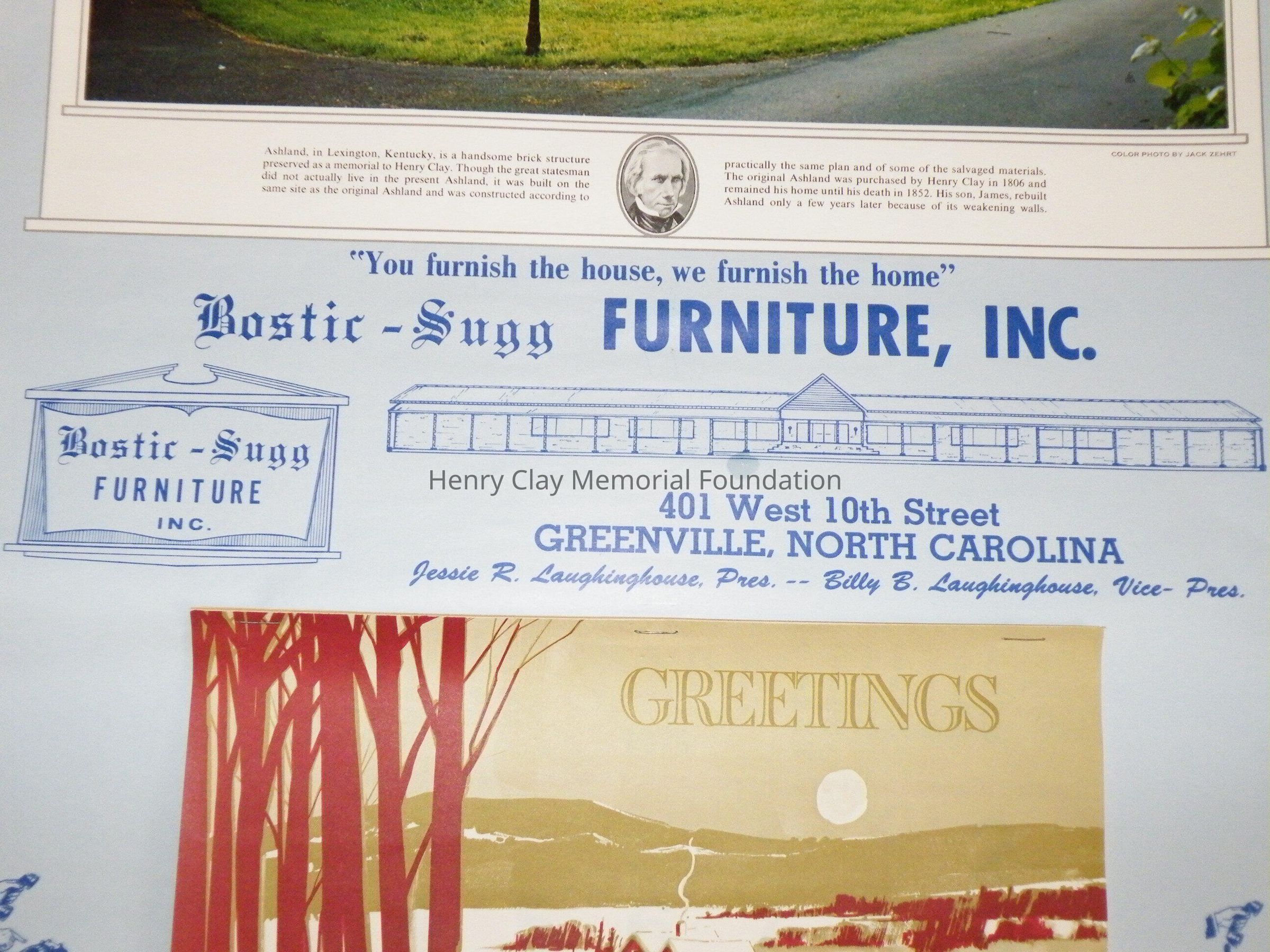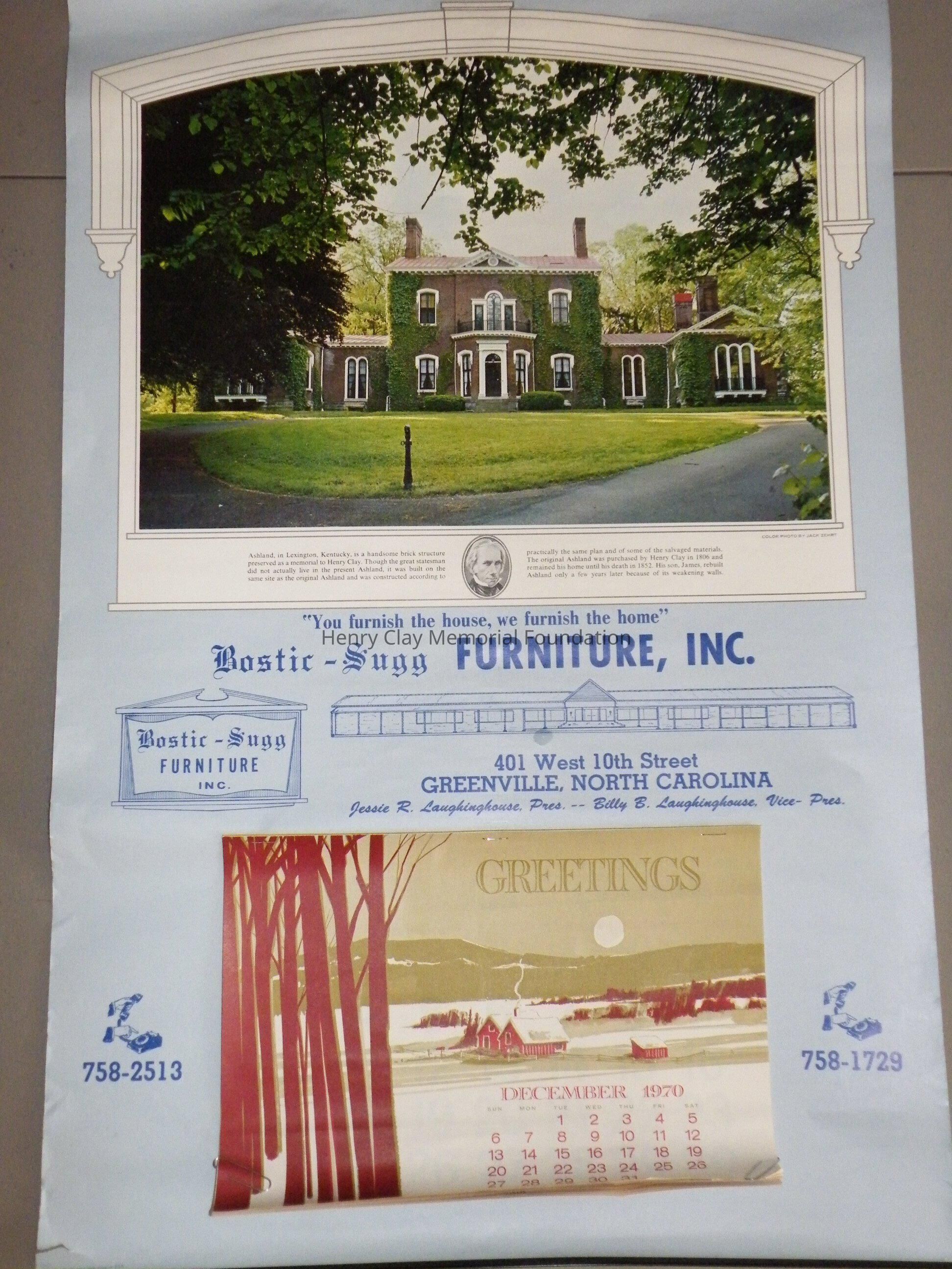 1 wall calendar with photo of Henry Clay at the top. The calendar is paper and has metal strips at the top and bottom. The strip at the top has a loop for hanging. The calendar itself a series of tear off sheets and is stapled to the large sheet at the bottom. The calendar is for December 1970-1971 and is an adveritsement for the Bostic-Sugg Furniture Co. in Greenville, NC.